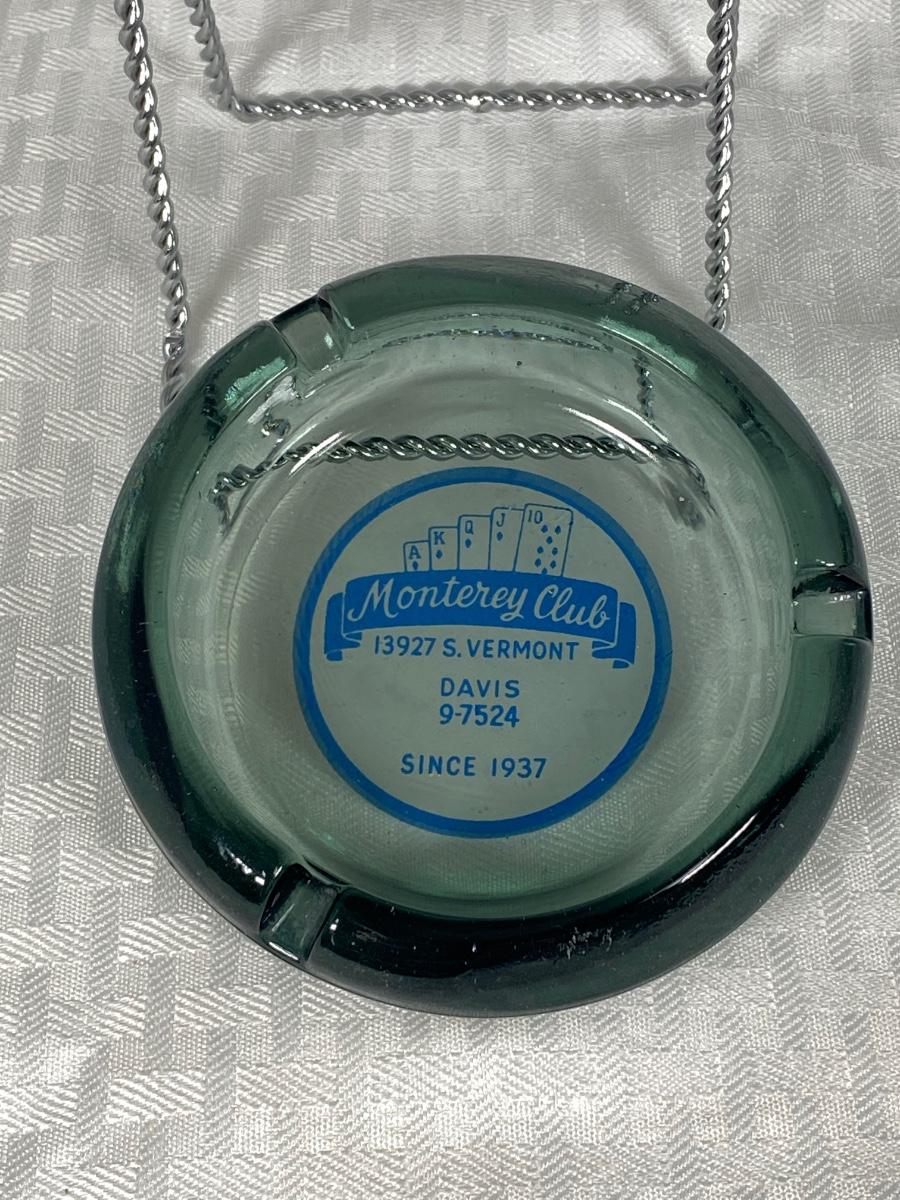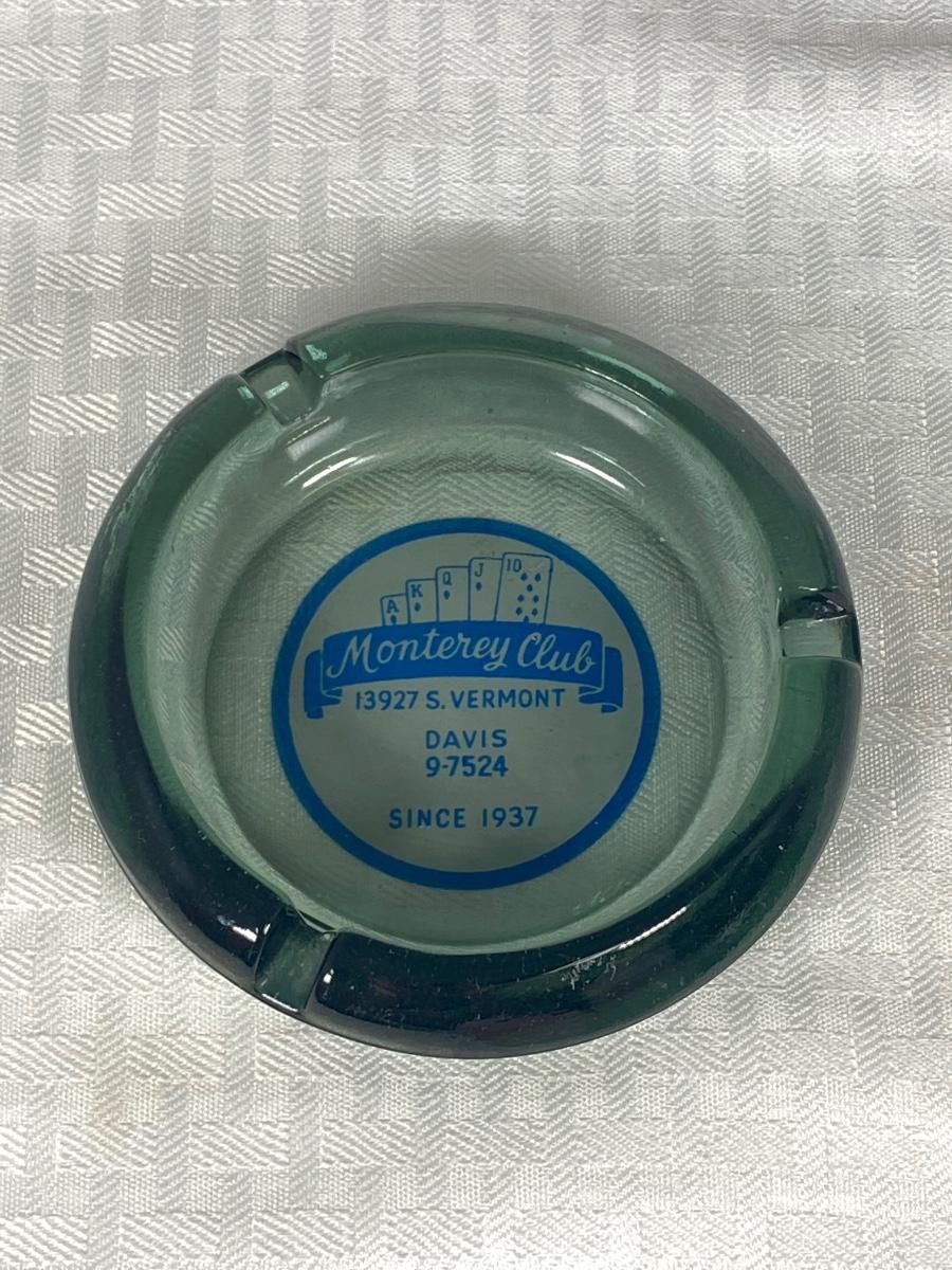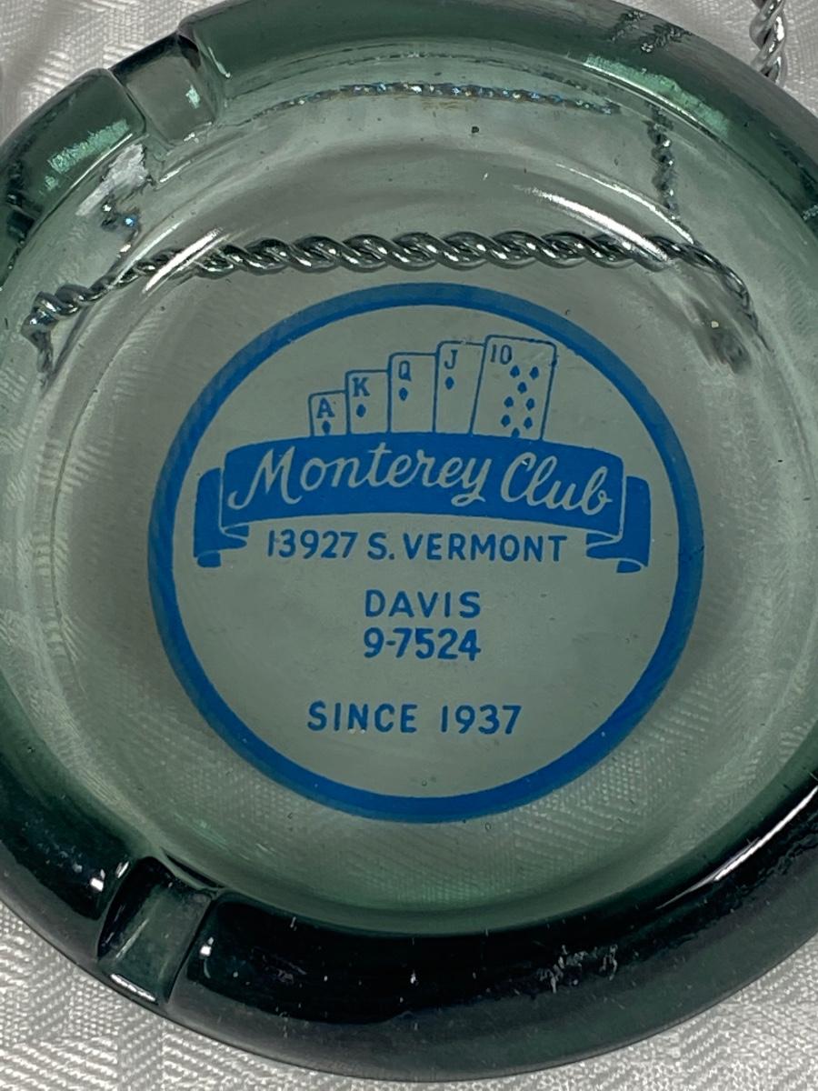 Vintage Monterey Club Card Room Casino Ashtray. Smoky blue tint to the glass, in good condition.
