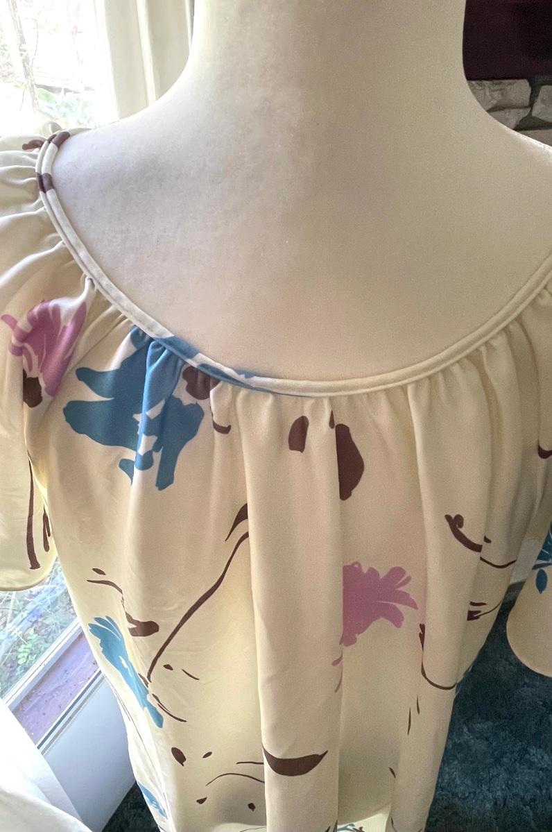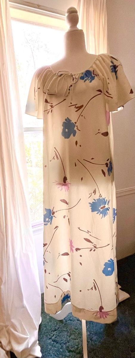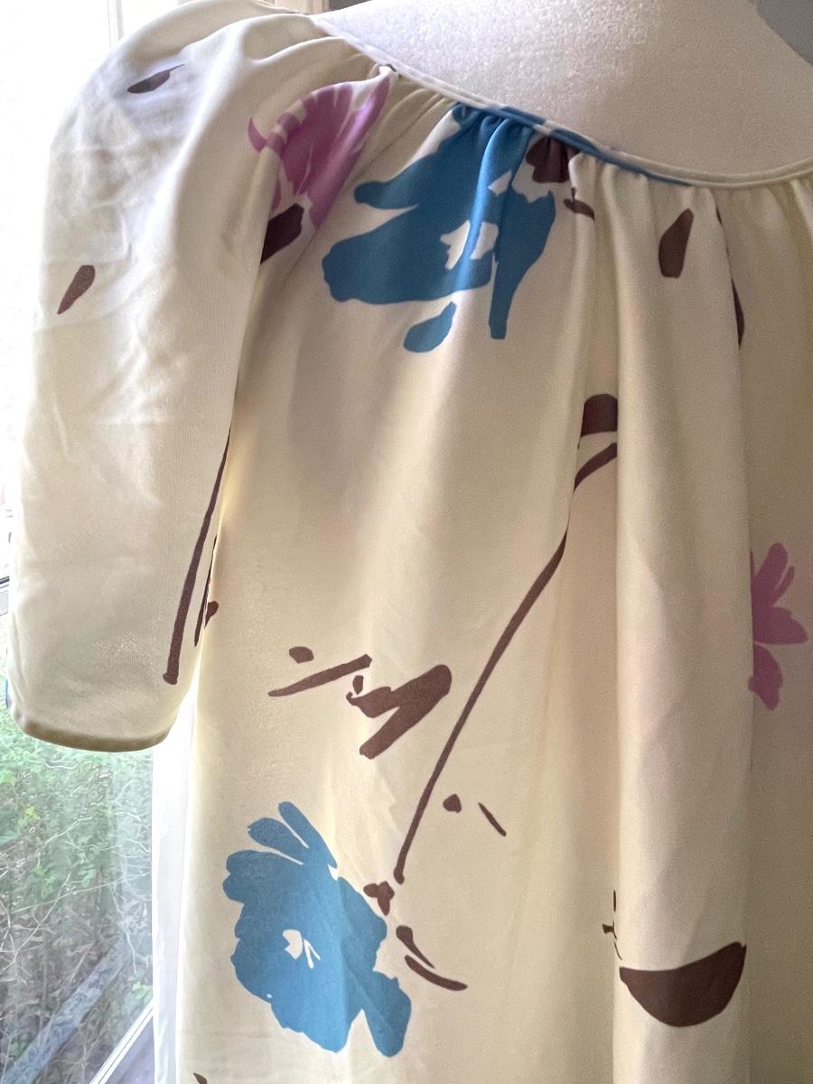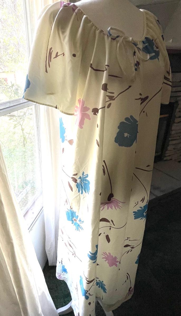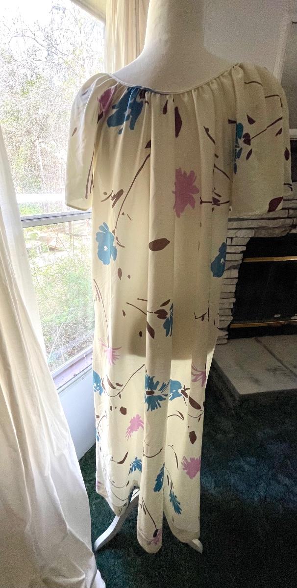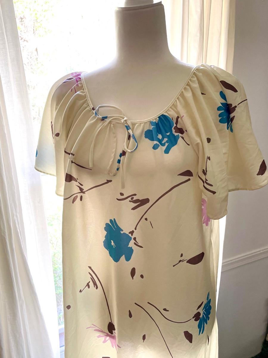 This is super cute. I feel like it’s one of Mrs. Ropers old dresses from 3s Company. I love it!! Is says it’s small but I feel like it’s a tad bigger than small. Laying flat- pit to pit is 22” pit to bottom of hem is 38” and measurement across bottom of hem is 36”