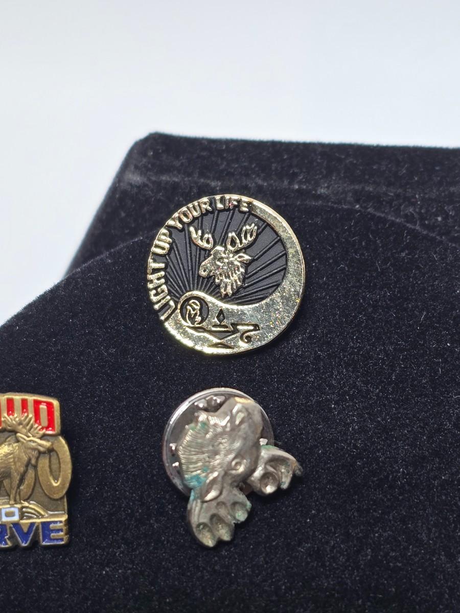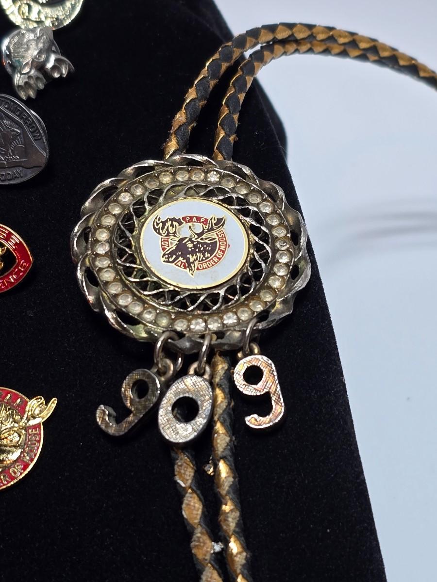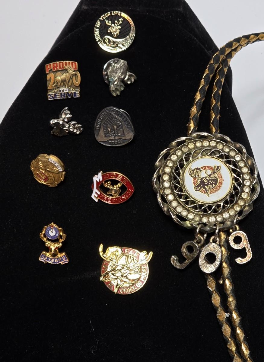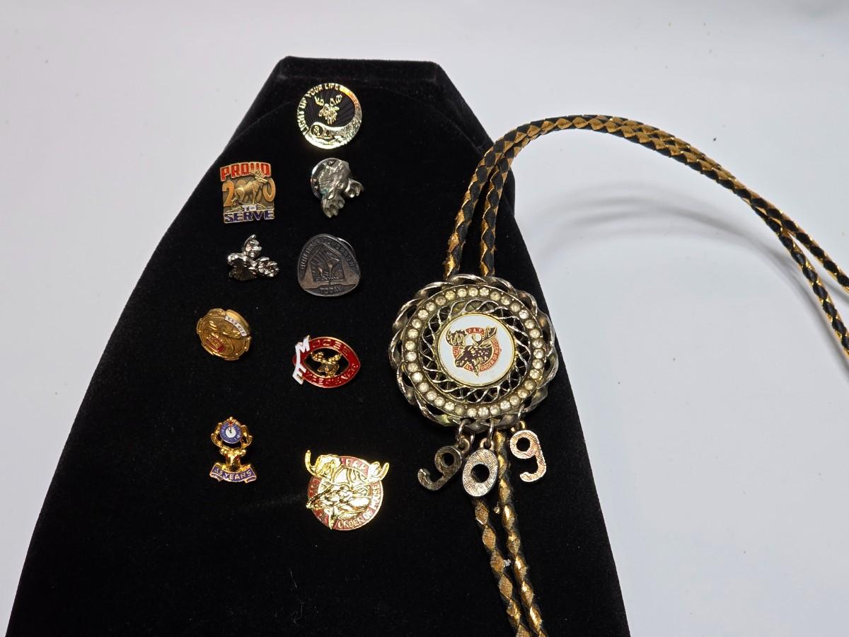 Vintage Moose Lodge hat pins with bolo tie with unique gold color coin back - Annual pins - Award pins - Collectibles