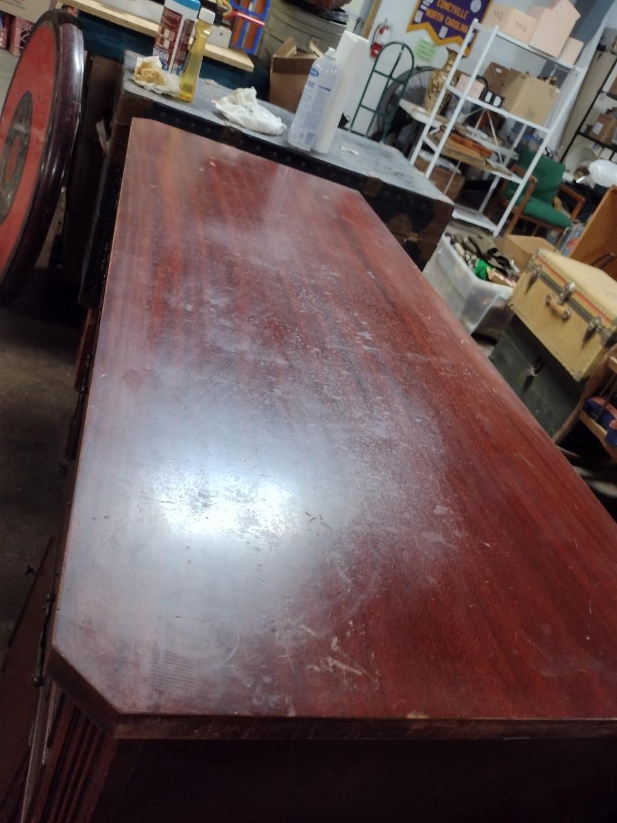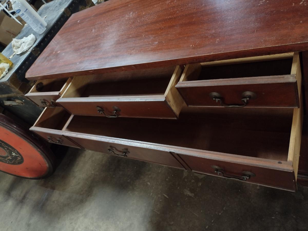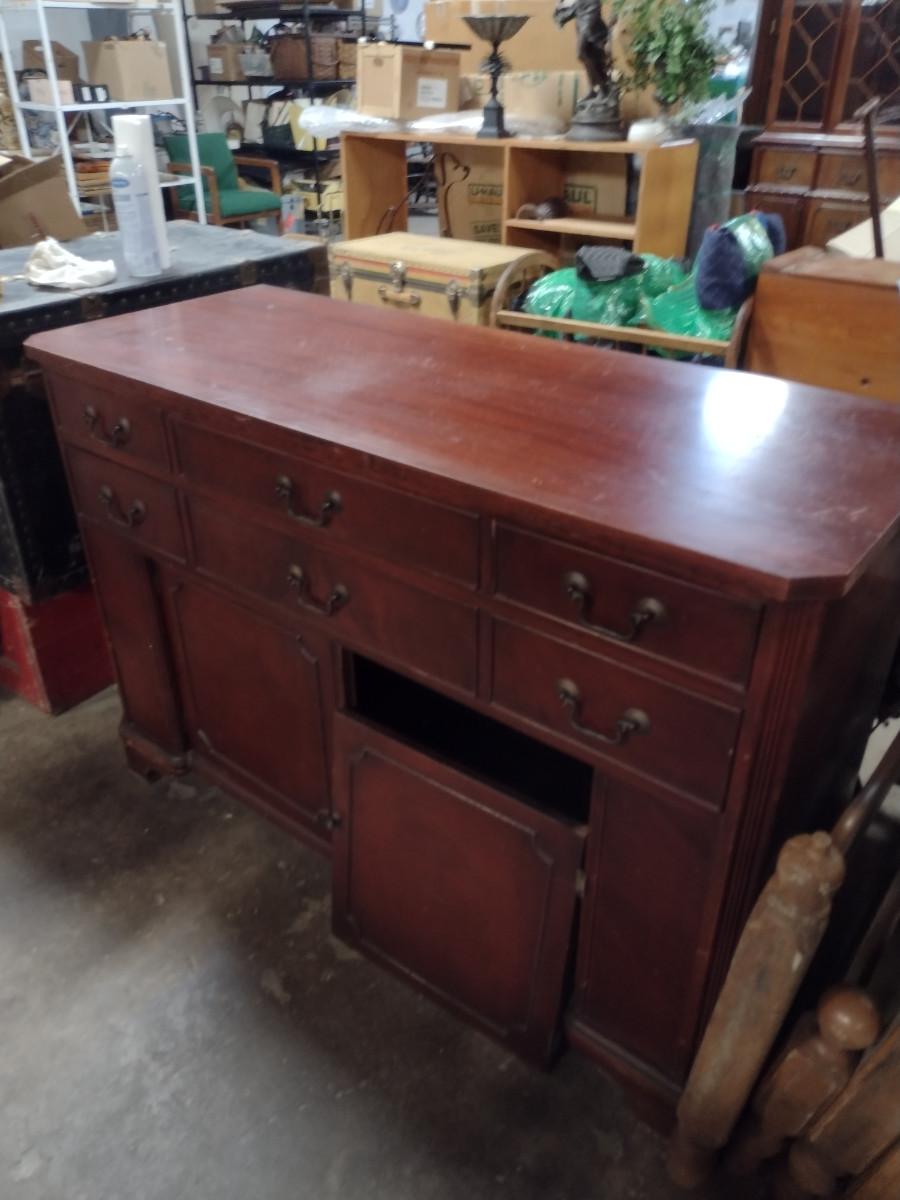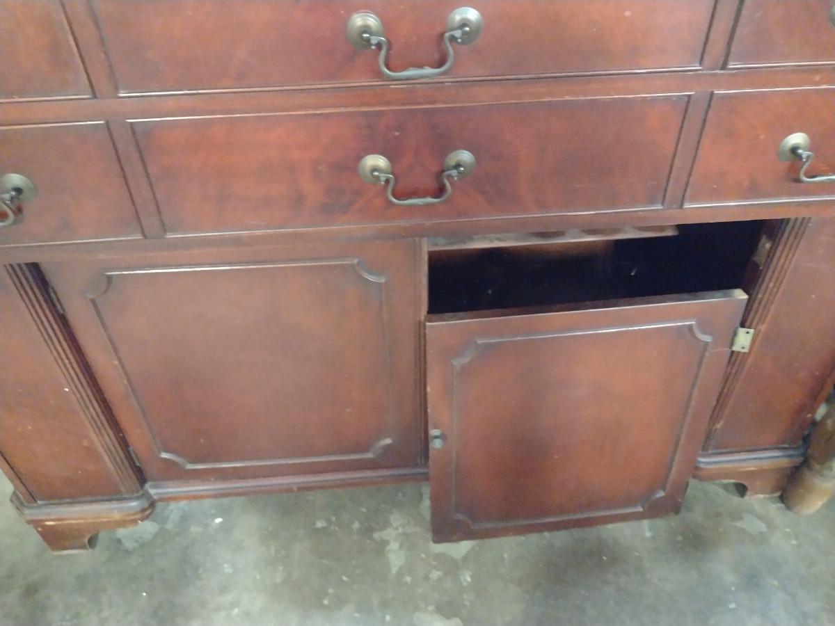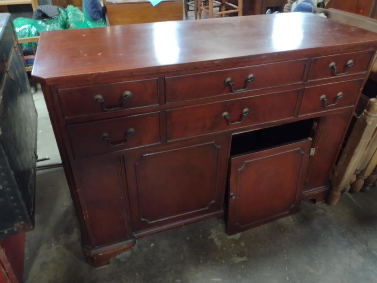 Vintage Solid Wood 4 Drawer Credenza. One of bottom doors needs to be re-attached. Approx 52" long, 21" deep, 35 1/2" tall.