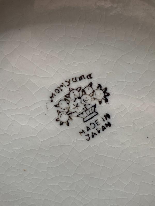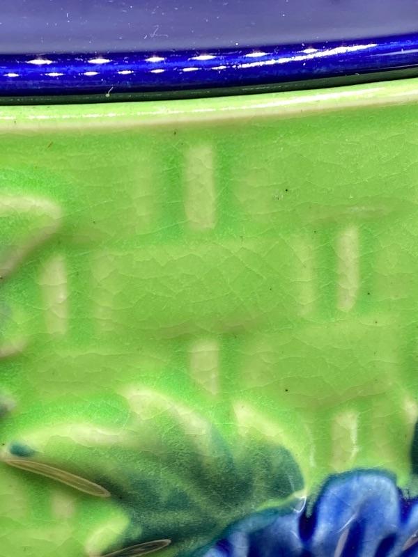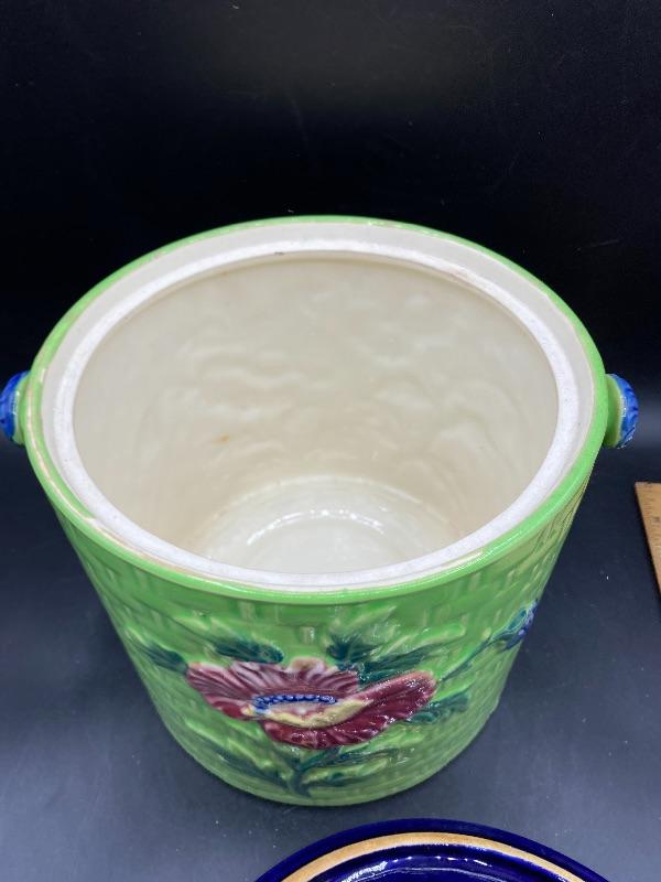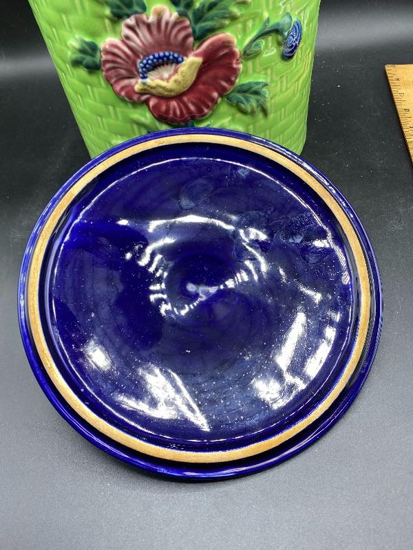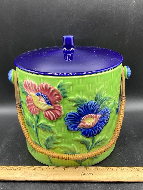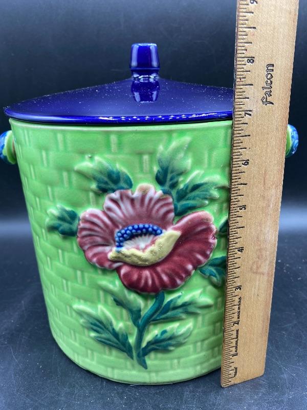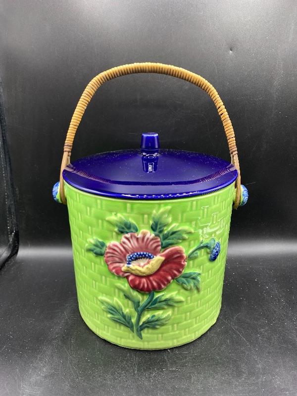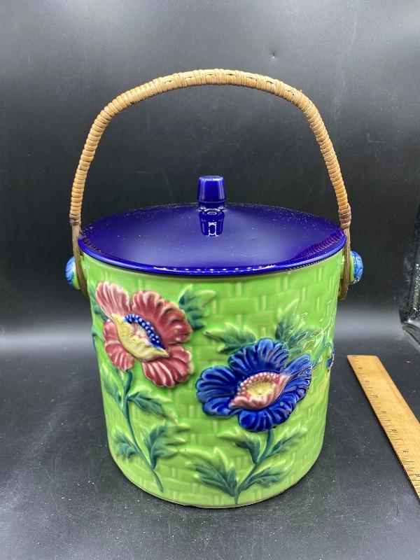 Vintage Moriyama ceramic cookie jar. Lime green basket texture with a flower on front. Cobalt blue color lid. Has a reed wood handle, for decor more then purpose. Large, stands about 9" at top of lid and is about the same at widest spot. Made in Japan. I'm not sure about the lid being the original. It looks good together but does not fit quite right. Good condition, no chips just crazing.