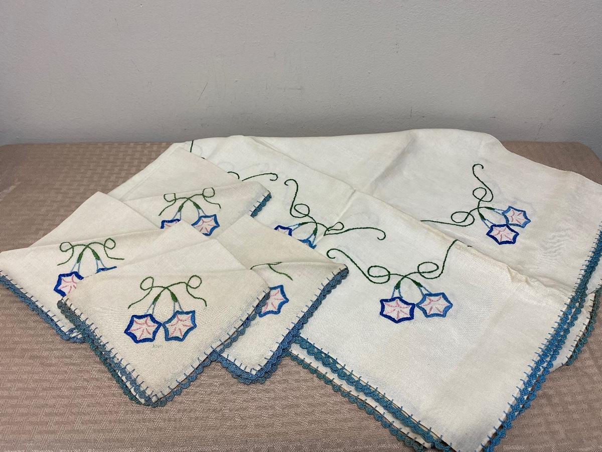 Vintage Morning Glory Embroidered Linen Table Cloth with 4 Matching Napkins