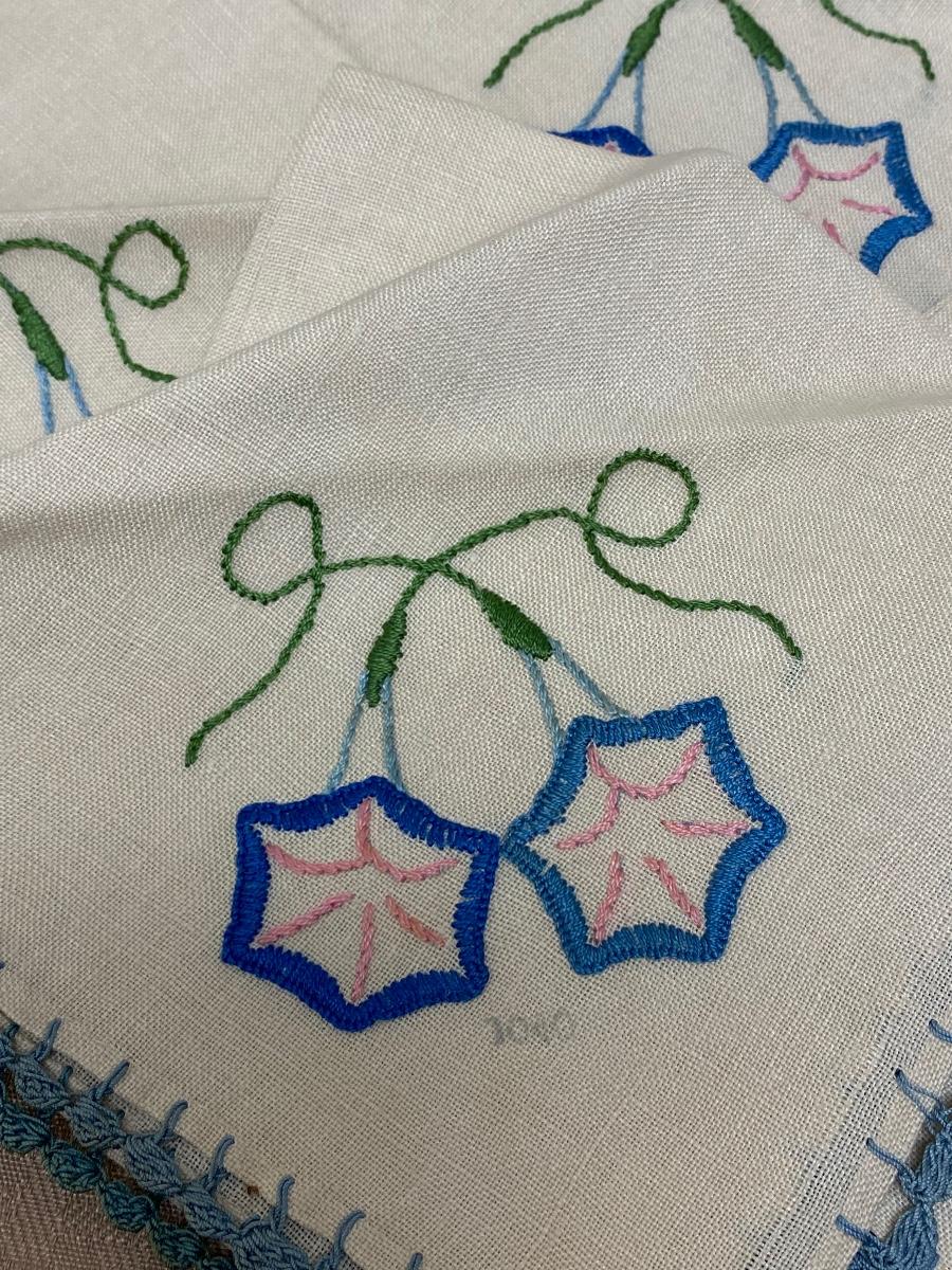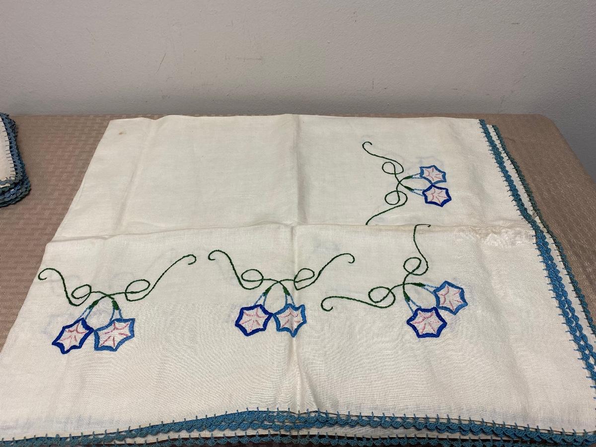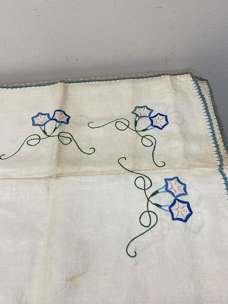 Vintage flower embroidered table cloth and matching napkin set. Blue edge with morning glory like flowers. Table cloth is about card table size. Comes with 4 napkins. There is discolor, more along the folds from storage, may come clean if washed. No holes noticed.
