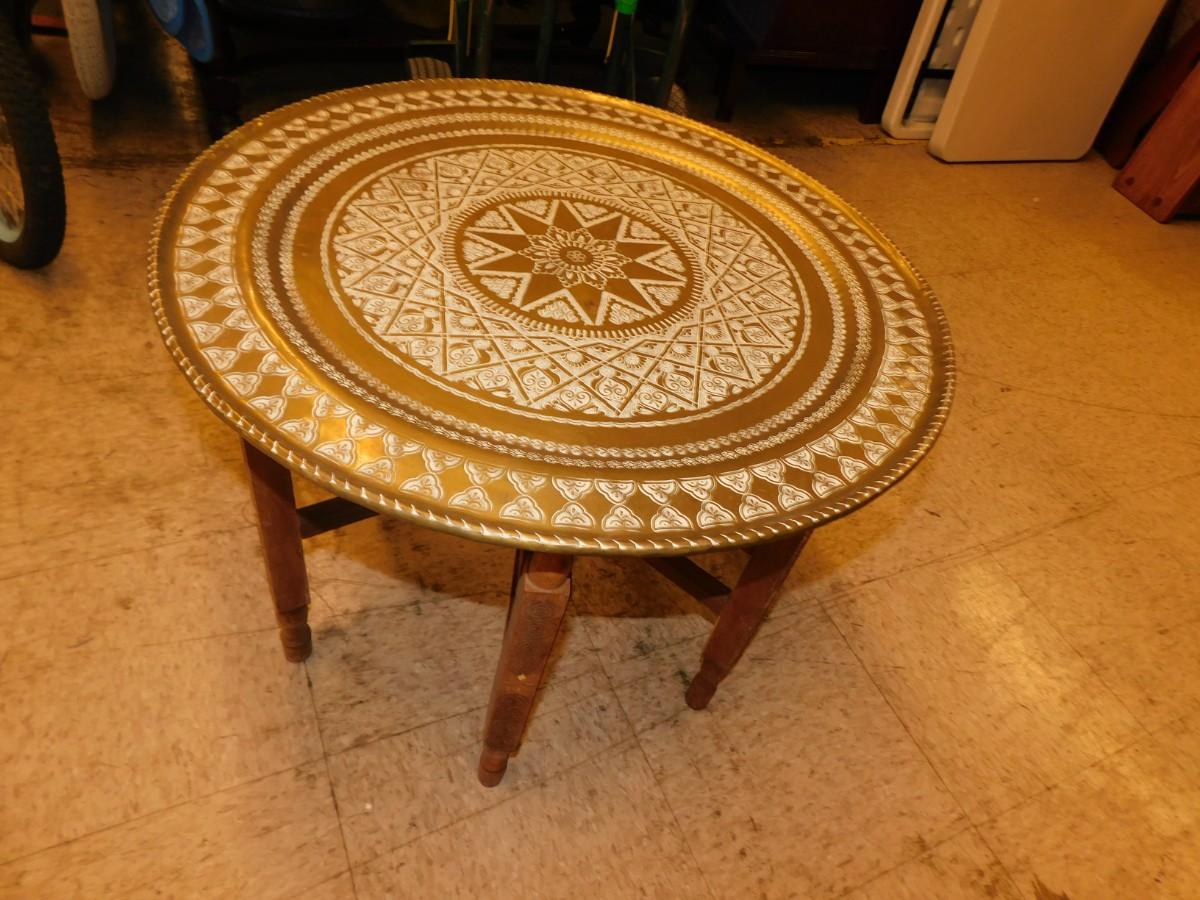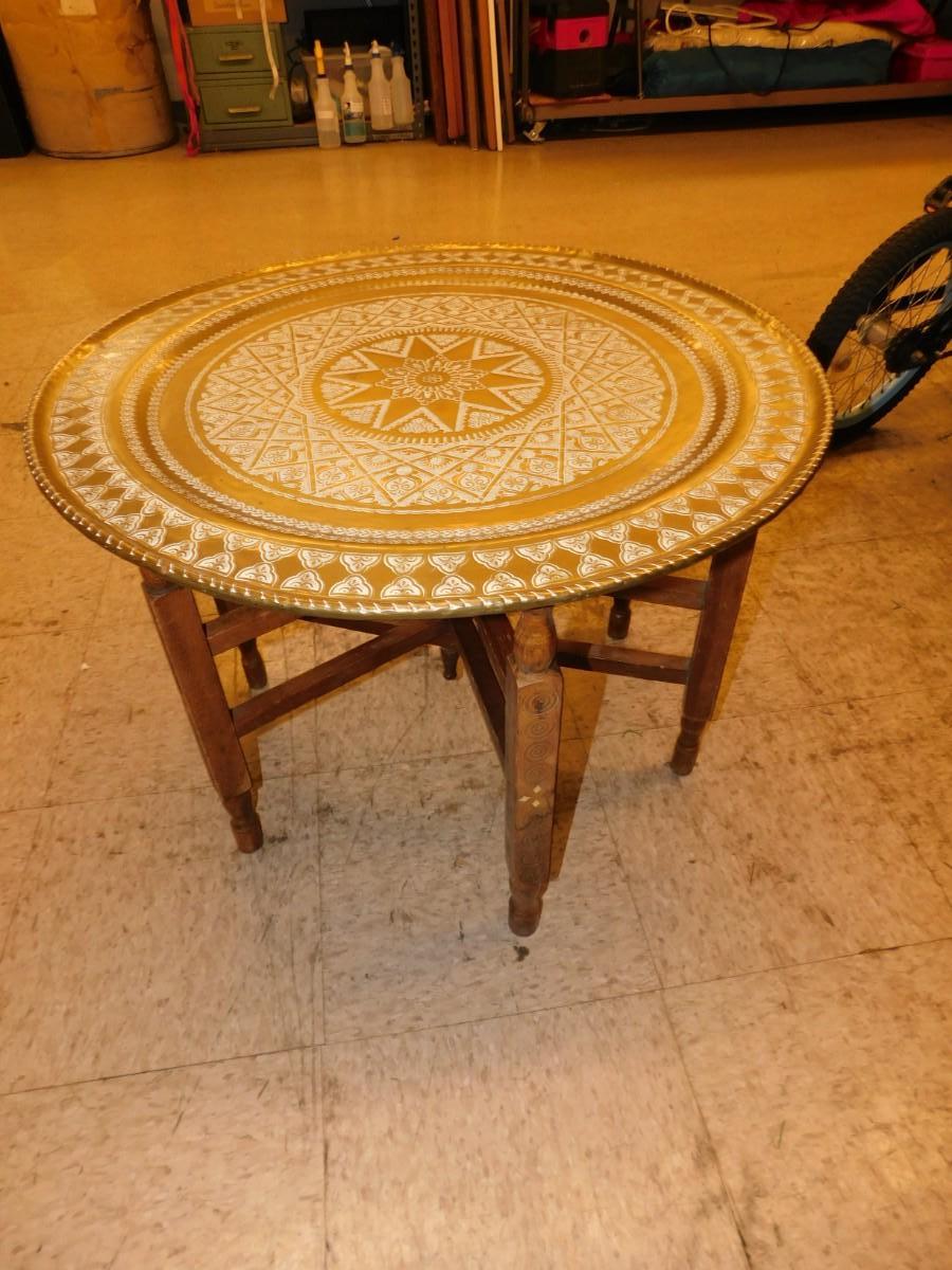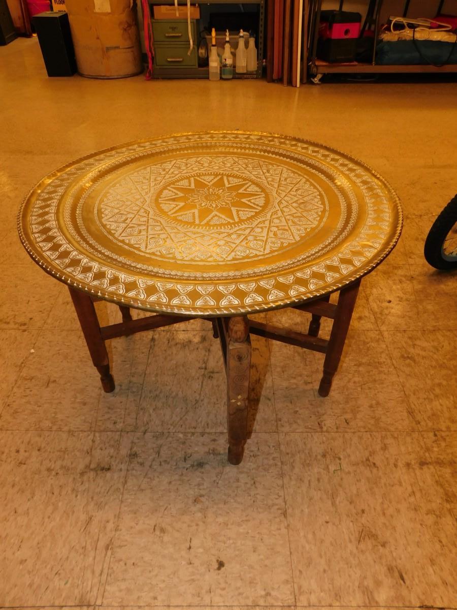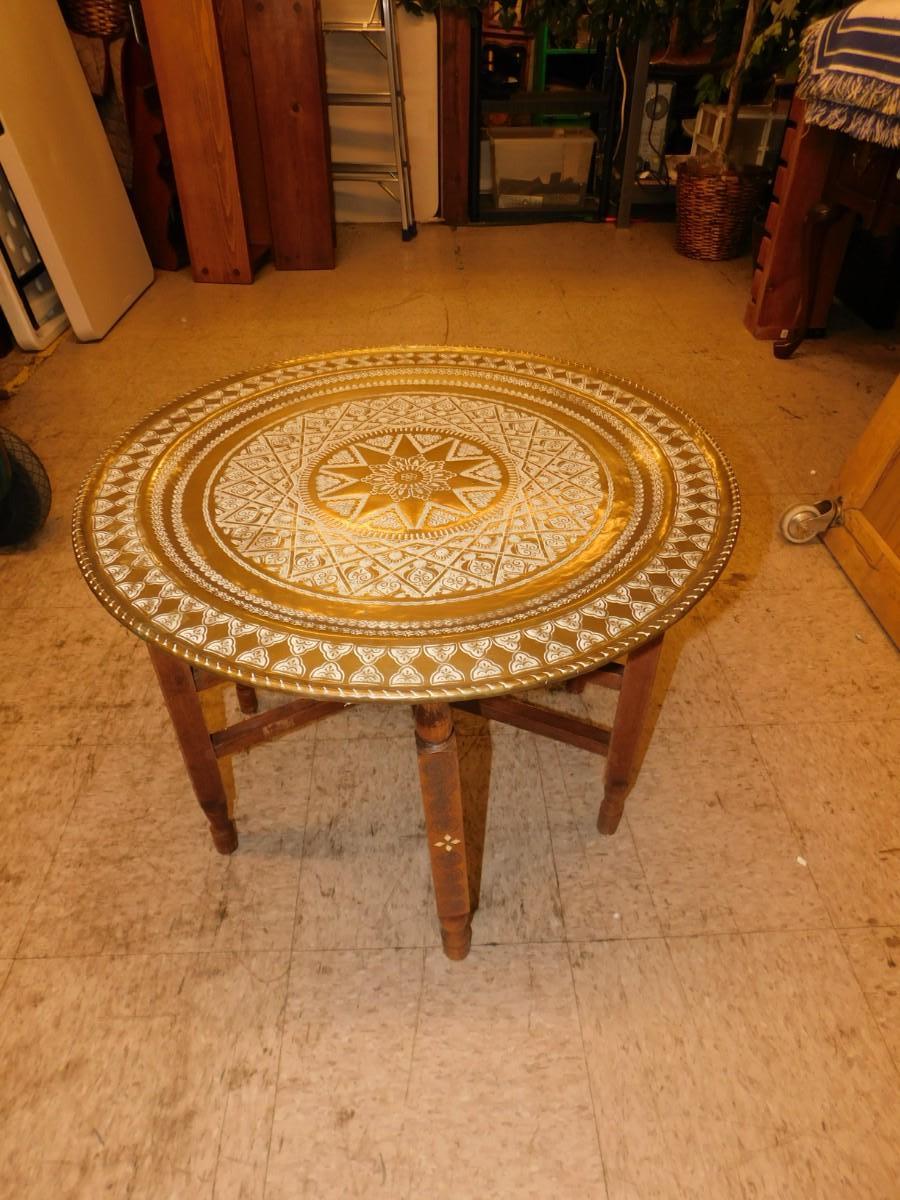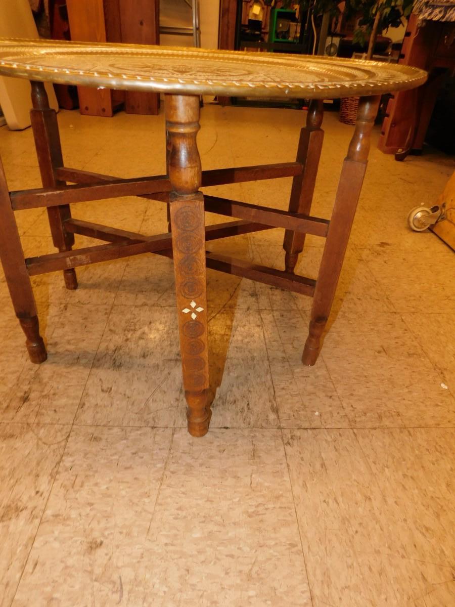 Vintage Moroccan Brass Tray Table w/ Inlayed Wood Stand