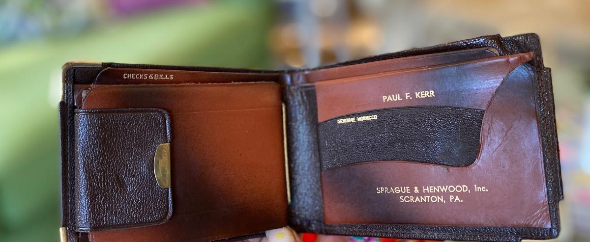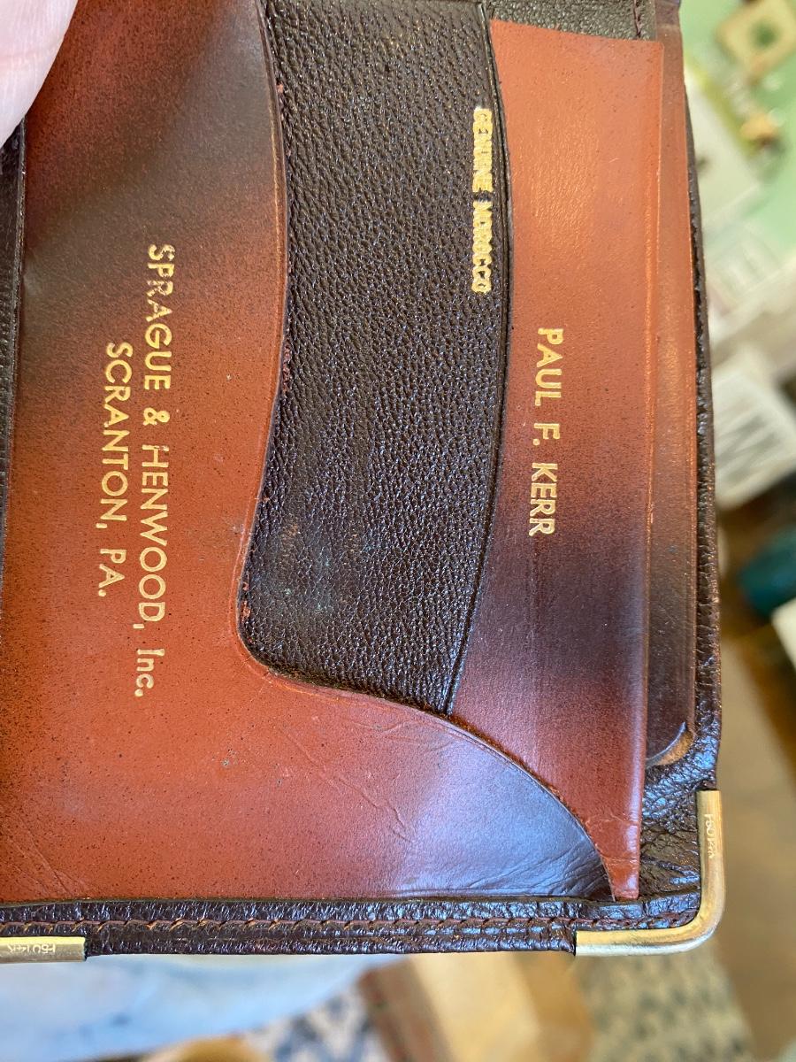 This fabulous vintage wallet was found unused at the residence of Paul Francis Kerr ., Bifold, it was tooled specifically as a presentation gift for Prof. Kerr by Sprague & Henwood of Scranton Pa - apparently they’re in the diamond drill business which must’ve been handy for a minerologist .