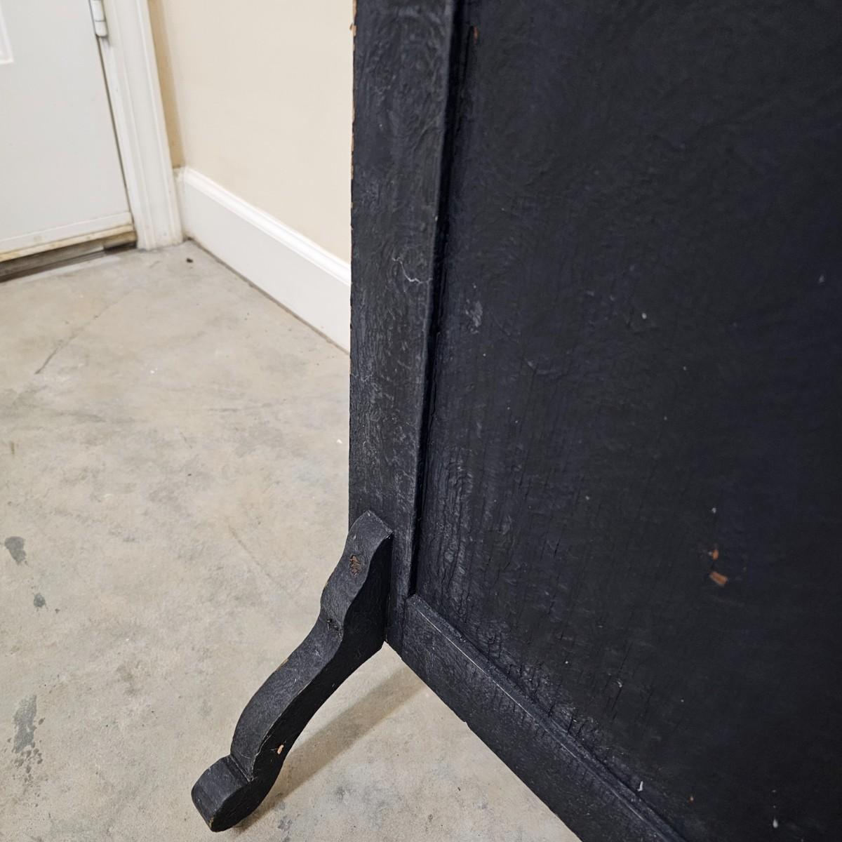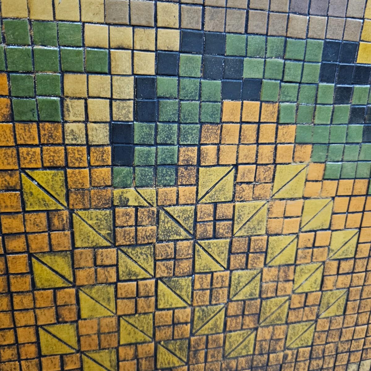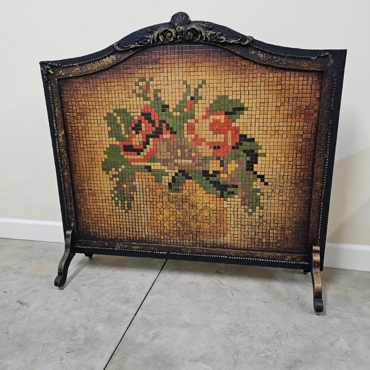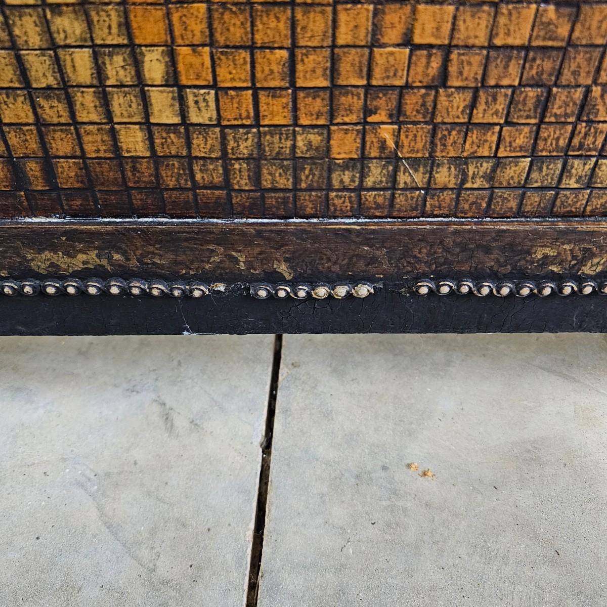 Decorated wood frame and legs with a 1/2" mosaic tile front, depicting flowers in a vase. Lovely patina on tiles from use. Wood frame has scrollwork at tops and beading down sides and across bottom. Back is solid piece of wood. Decor and beading have some missing pieces. Metal roller casters on bottom of legs. See photos for details. Local pickup only.