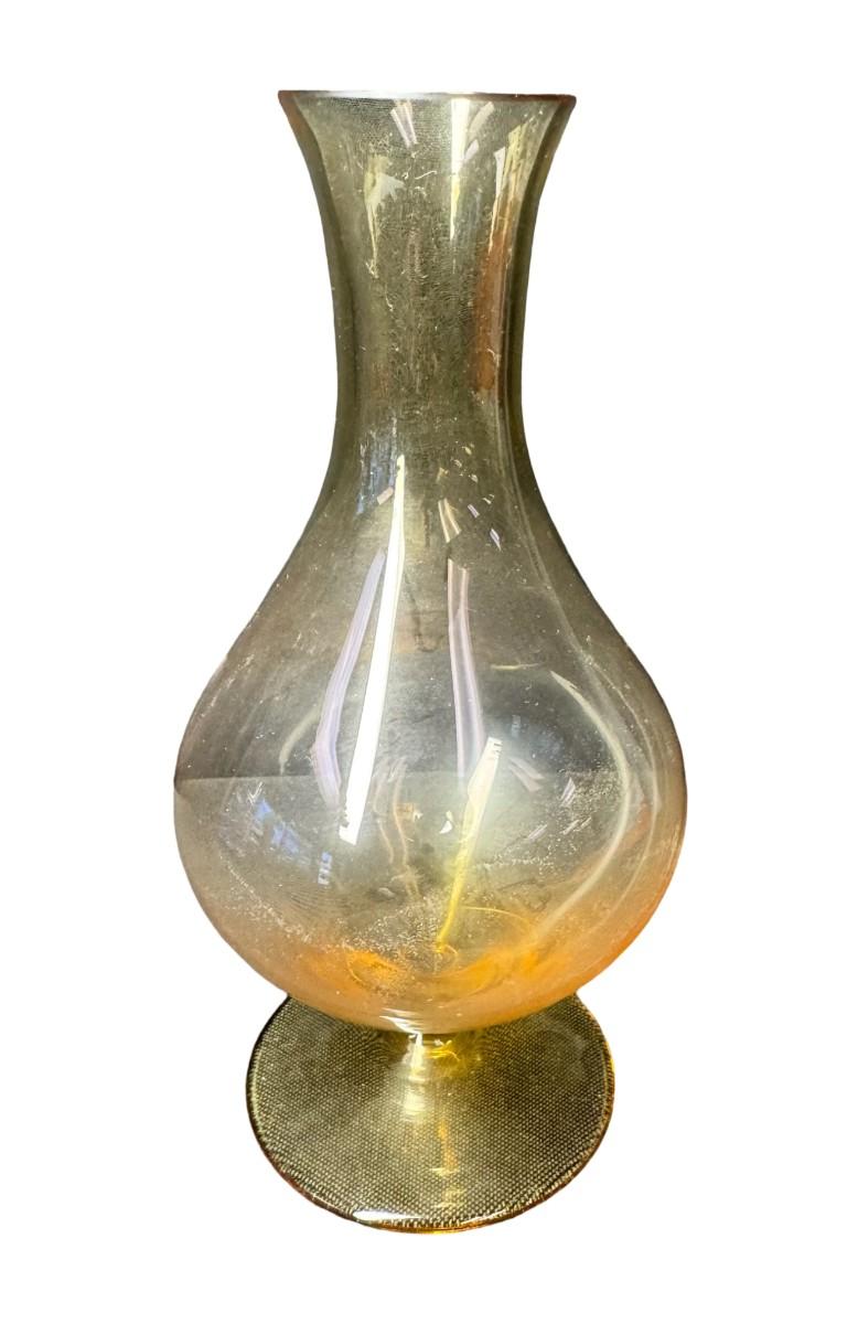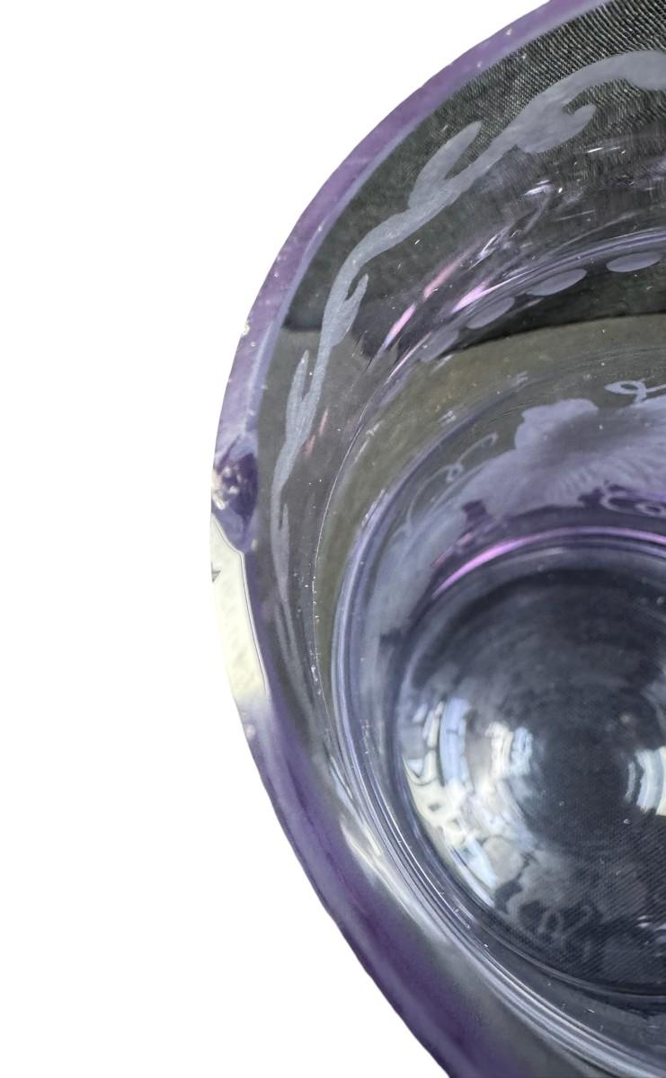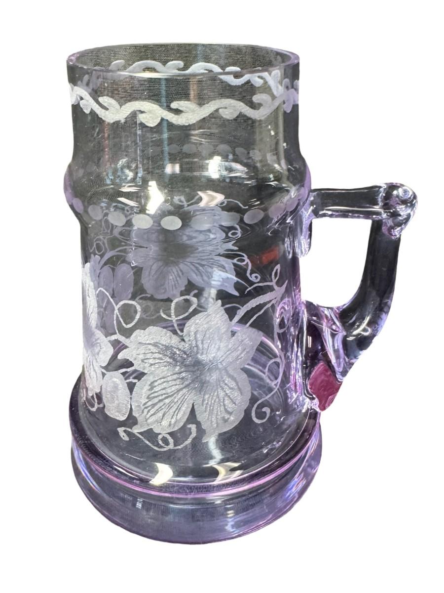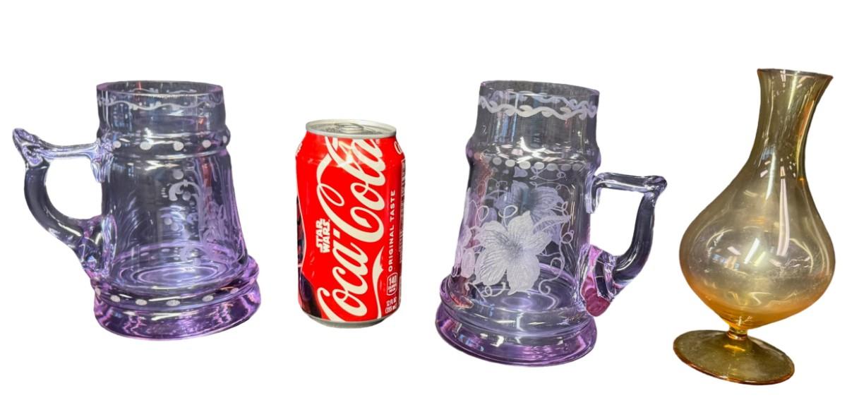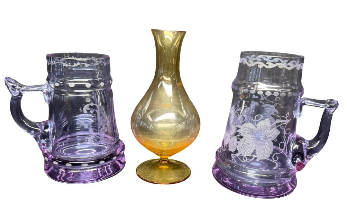 Made in Czechoslovakia. Includes two purple etched beer mugs, and one amber delicate glass vase. Total of three pieces. One of the mugs has a chip on the rim (pictured). Measurement of tallest: 7”H. Pre-auction estimate: $75-$125. [RE]