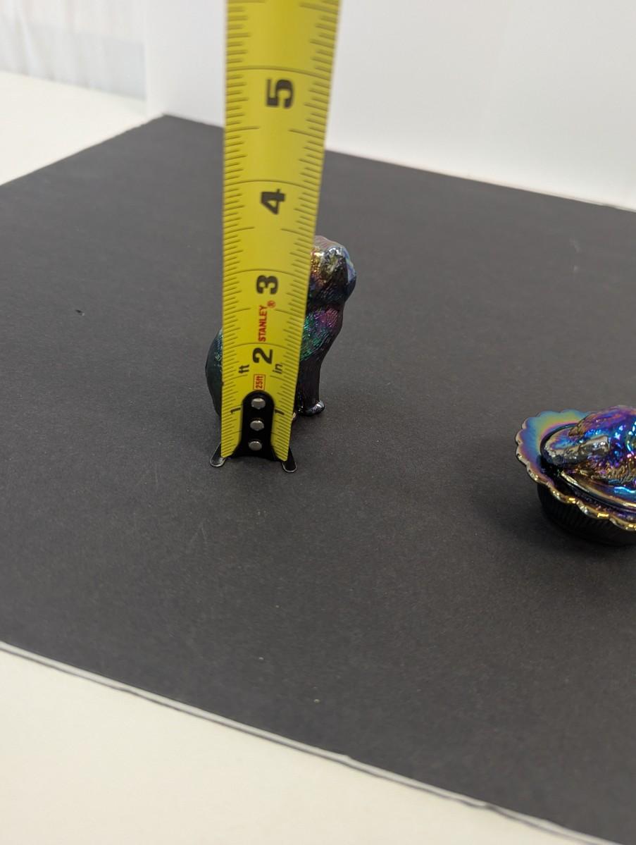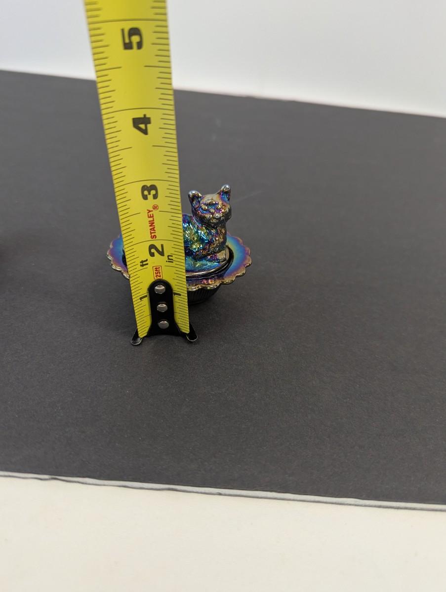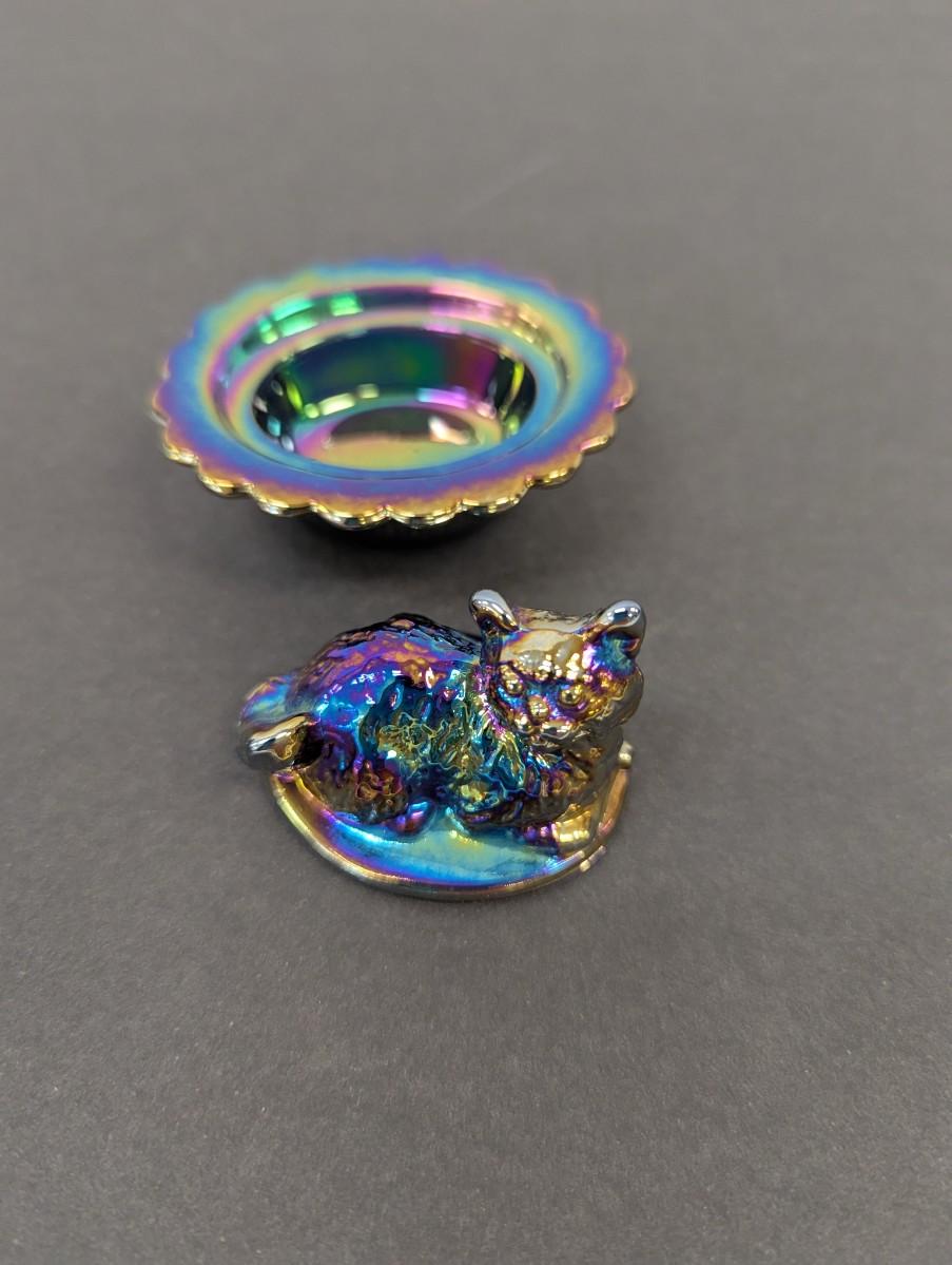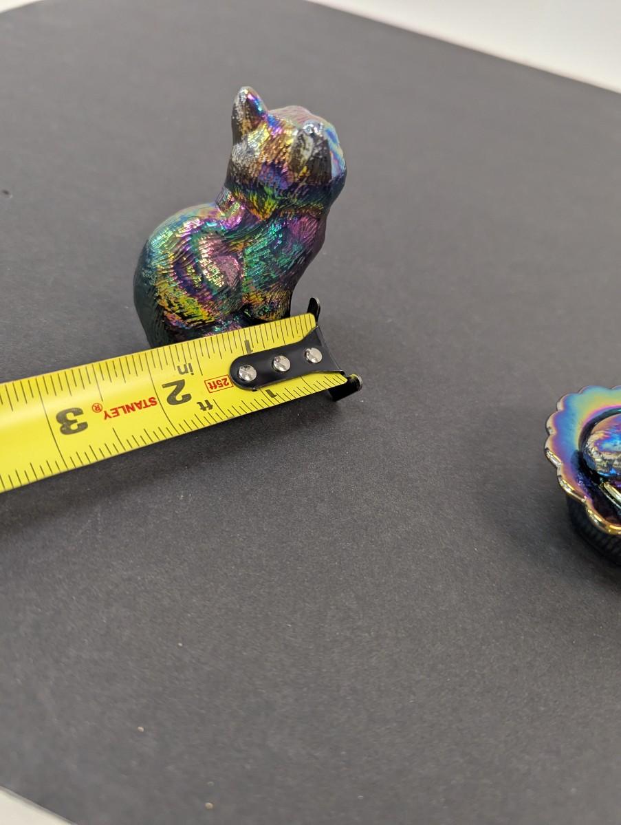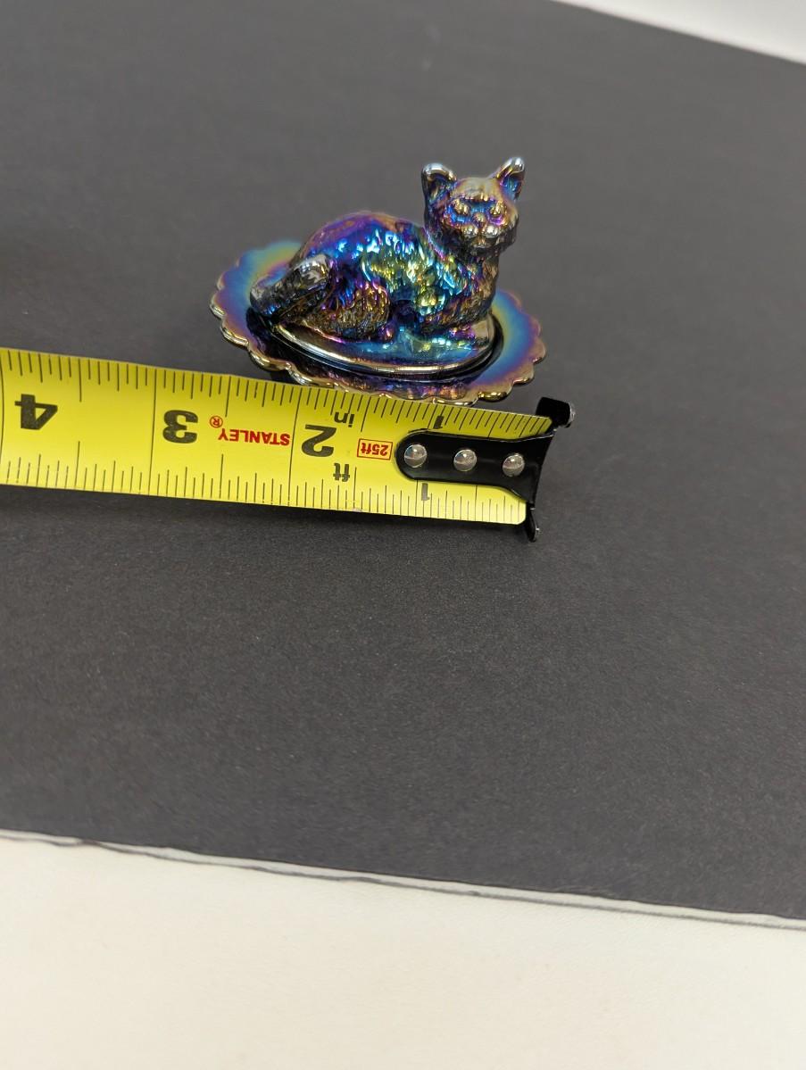 This vintage Mosser glass cat figurine is a beautiful addition to any collection. Crafted in the United States, this figurine features a stunning carnival oil slick design that is sure to catch the eye of any cat lover. The intricate details of the cat's fur and bones are impressive, making it a great choice for display or as a trinket dish.