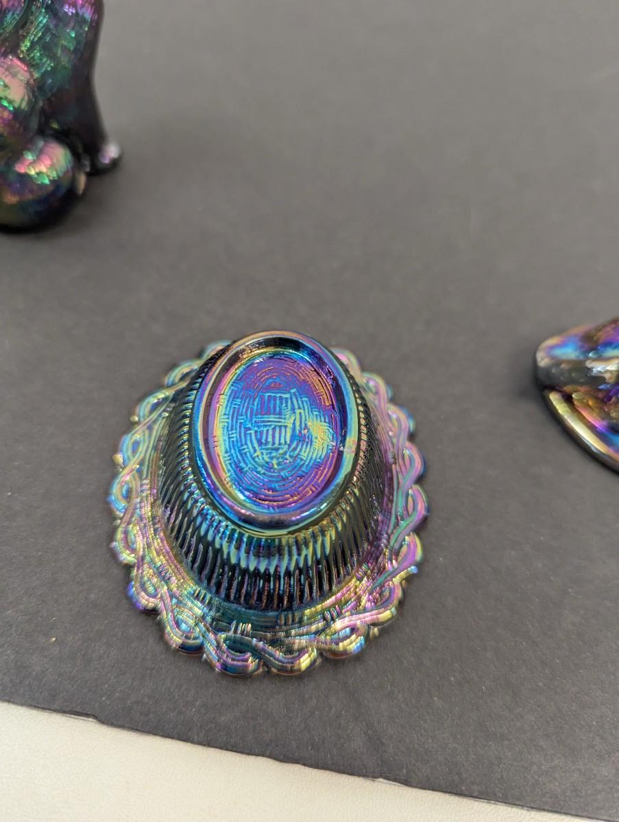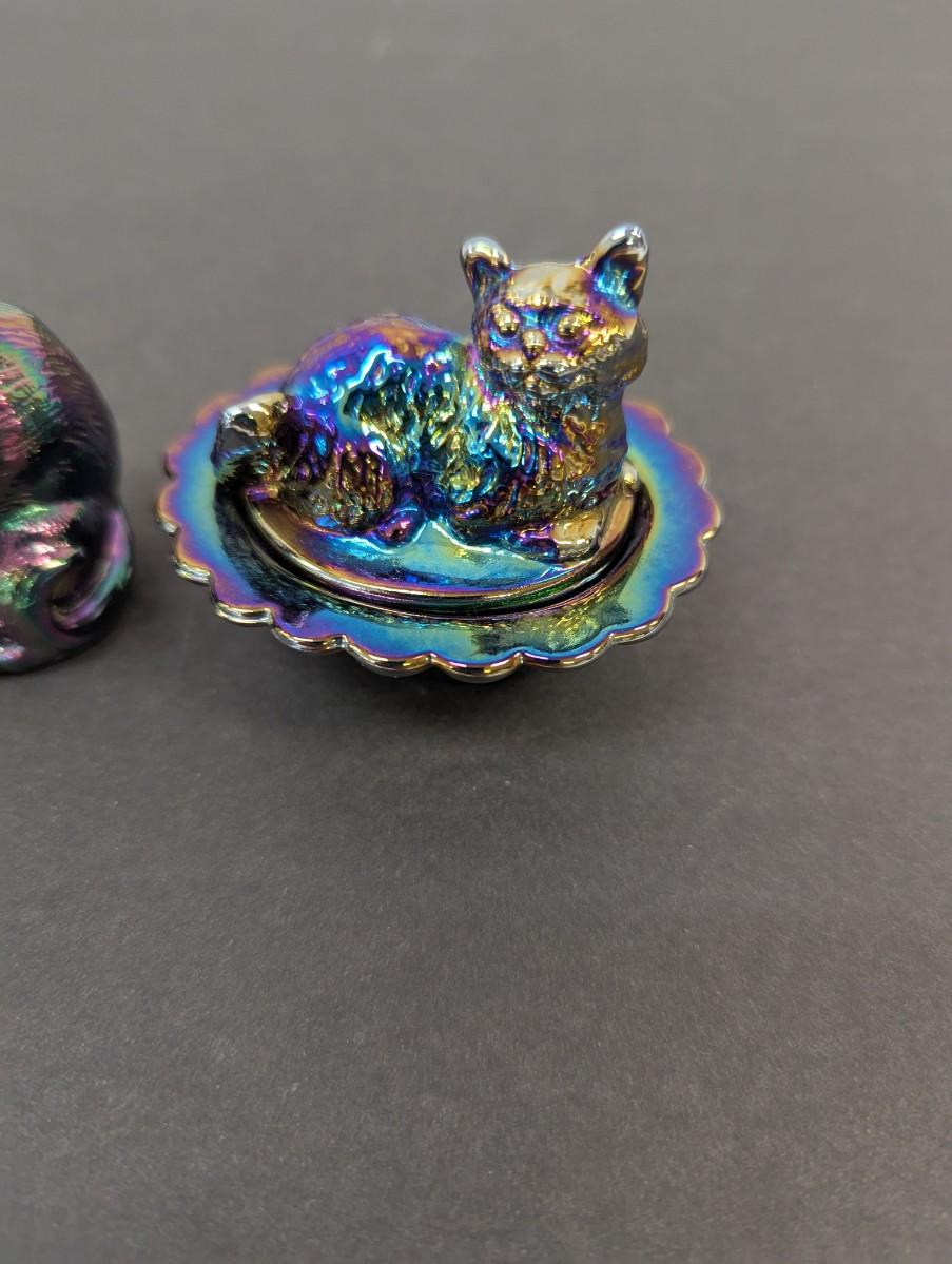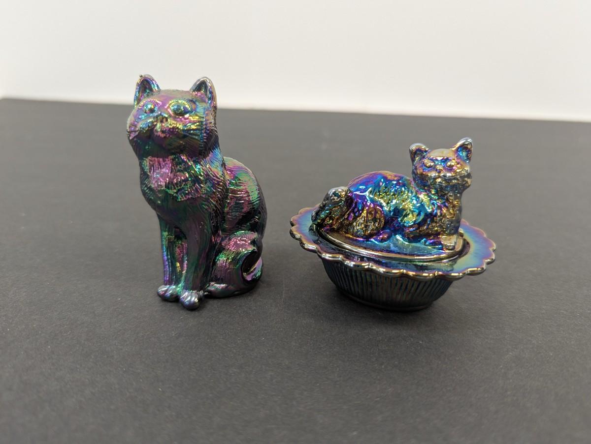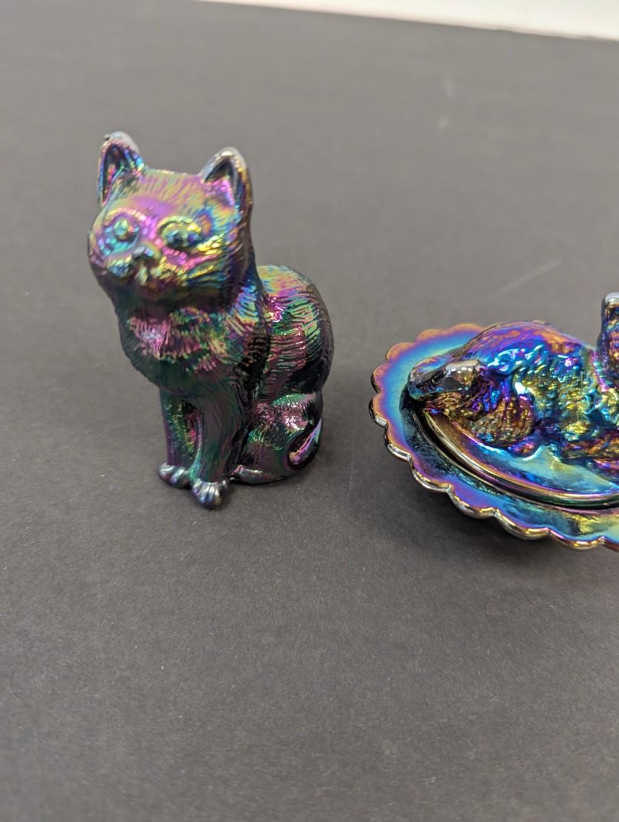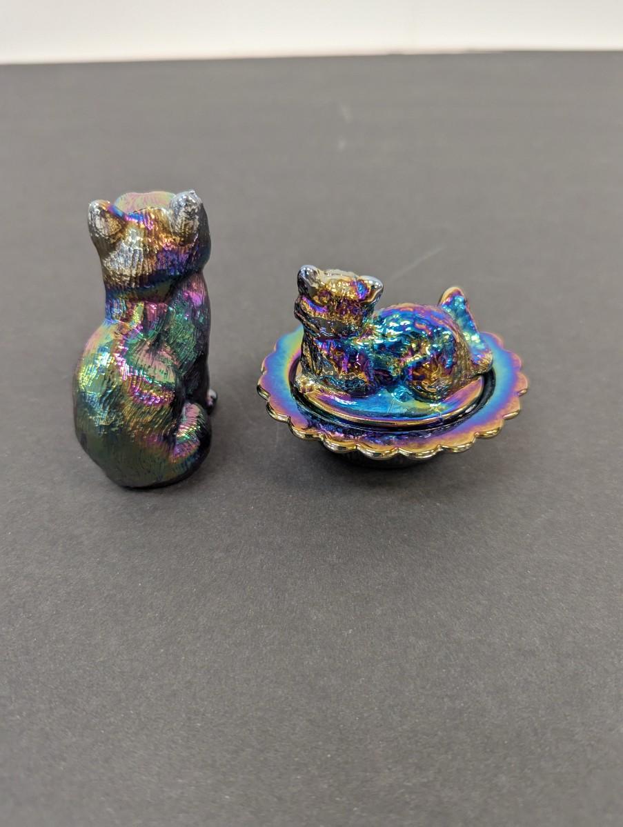 Vintage Mosser Cobalt Blue Carnival Iridescent Art Glass Sitting Cat Figurine & Mosser Glass Cat On Nest Carnival Oil Slick Salt Or Trinket Dish