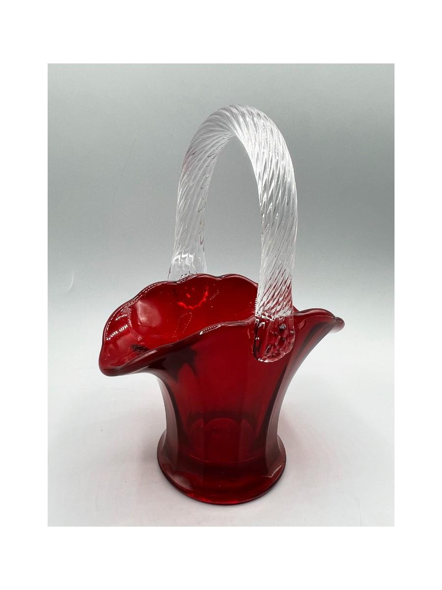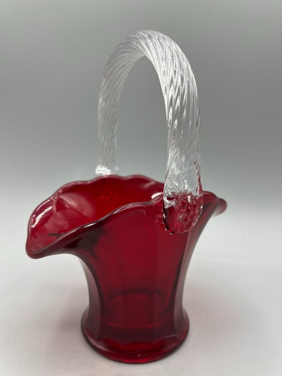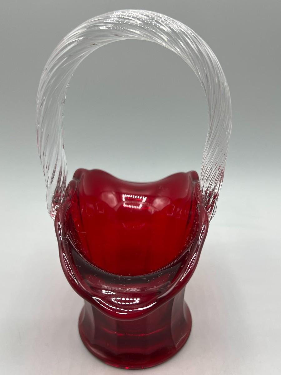 Vintage Mosser Ruby Red & Clear Glass Bridal Basket. Panel style glass basket with scalloped edge. About 7" size. Offer pressed edge on basket handle.