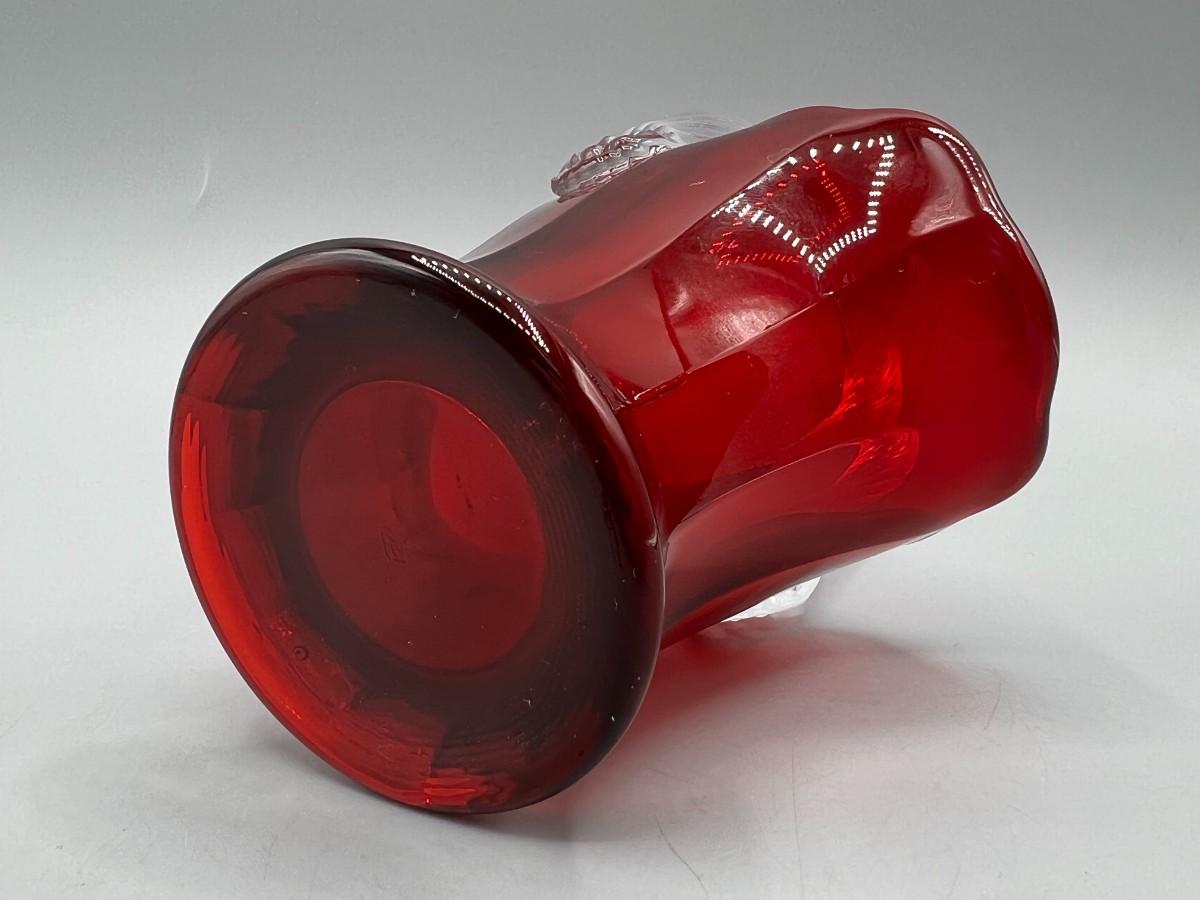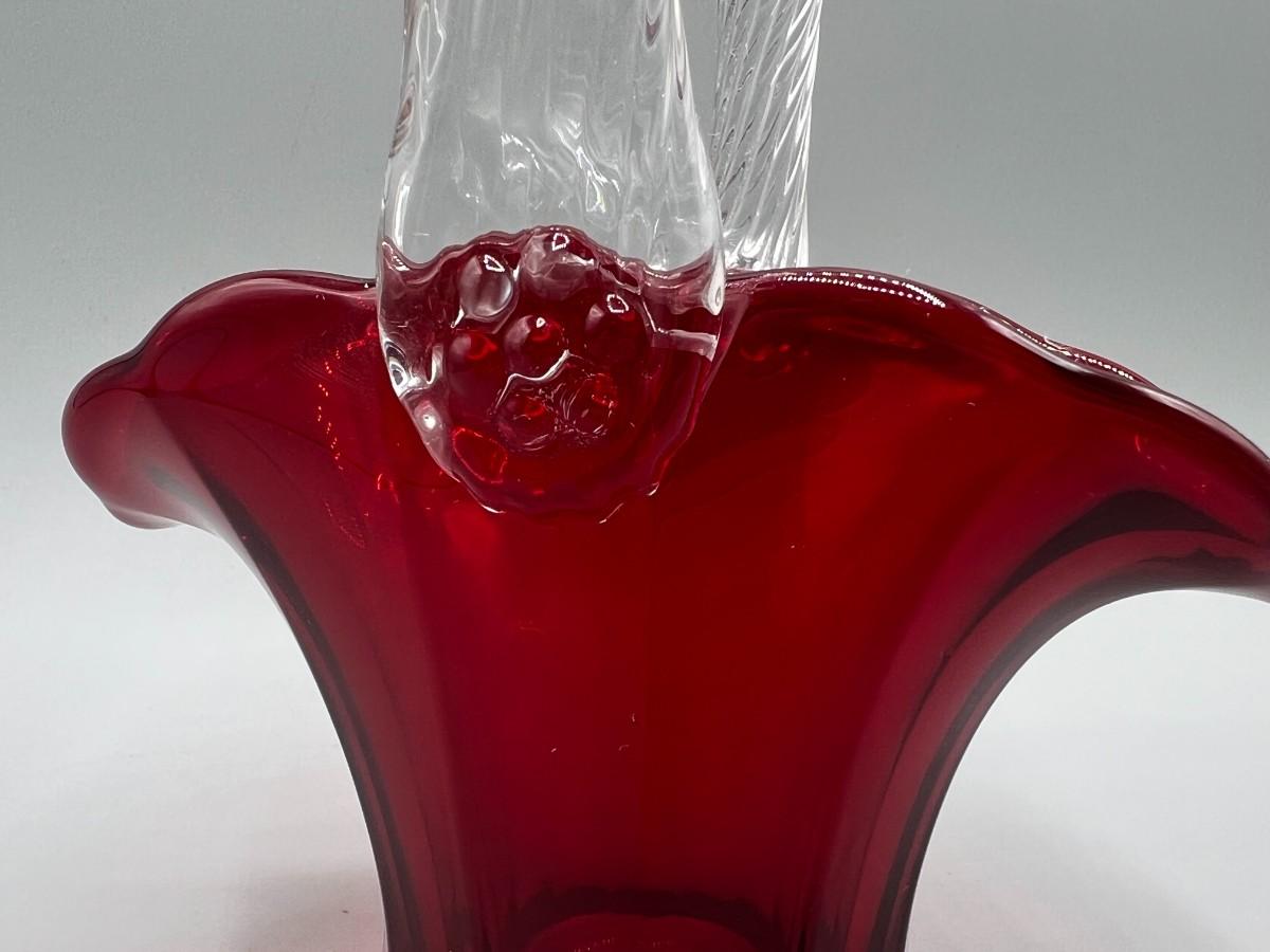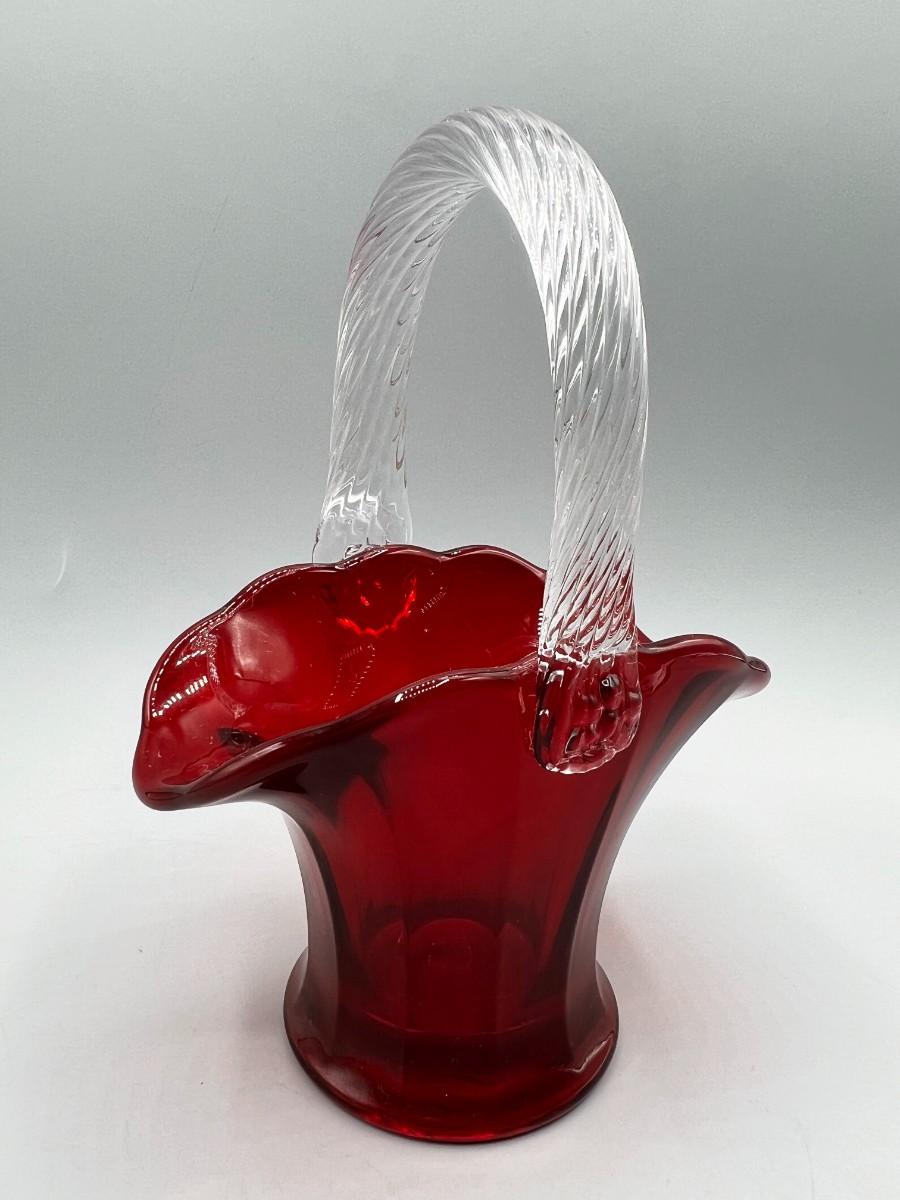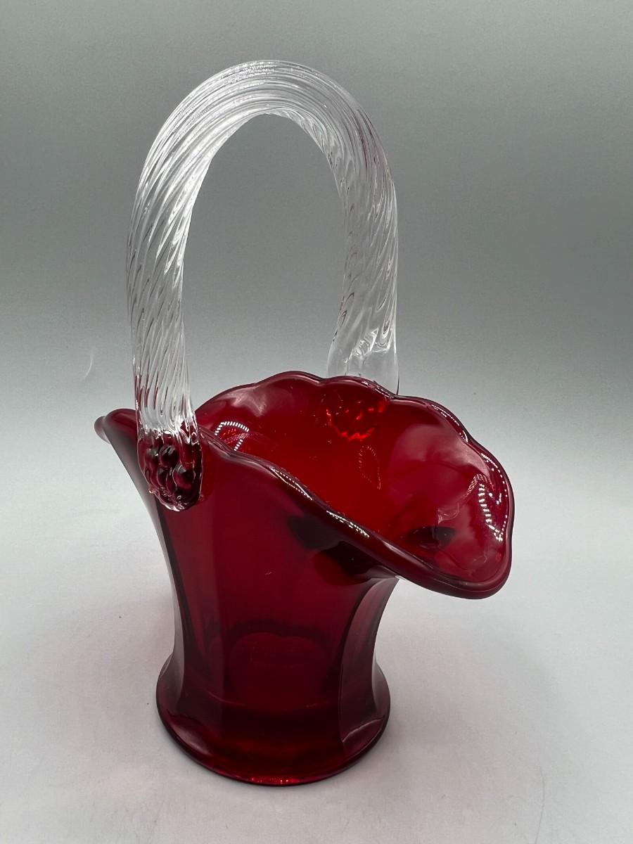 Vintage Mosser Ruby Red & Clear Glass Bridal Basket. Panel style glass basket with scalloped edge. About 7" size. Offer pressed edge on basket handle.