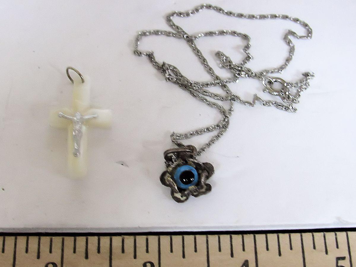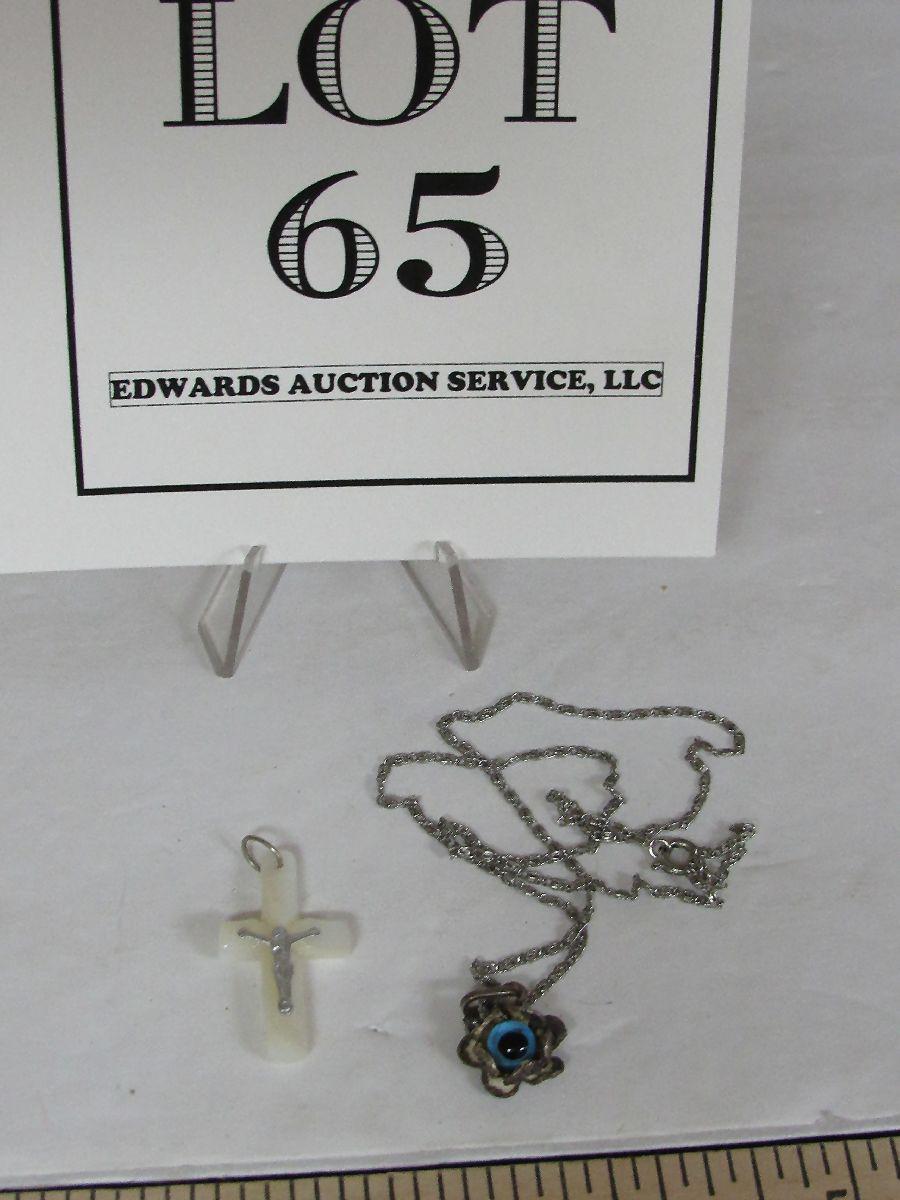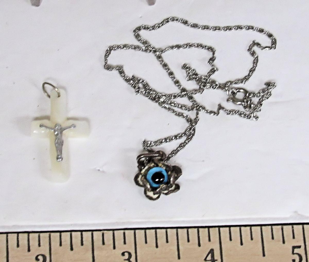 Vintage Mother of Pearl Cross Pendant and Sterling Eye In Flower Pendant on Silver Tone Necklace
