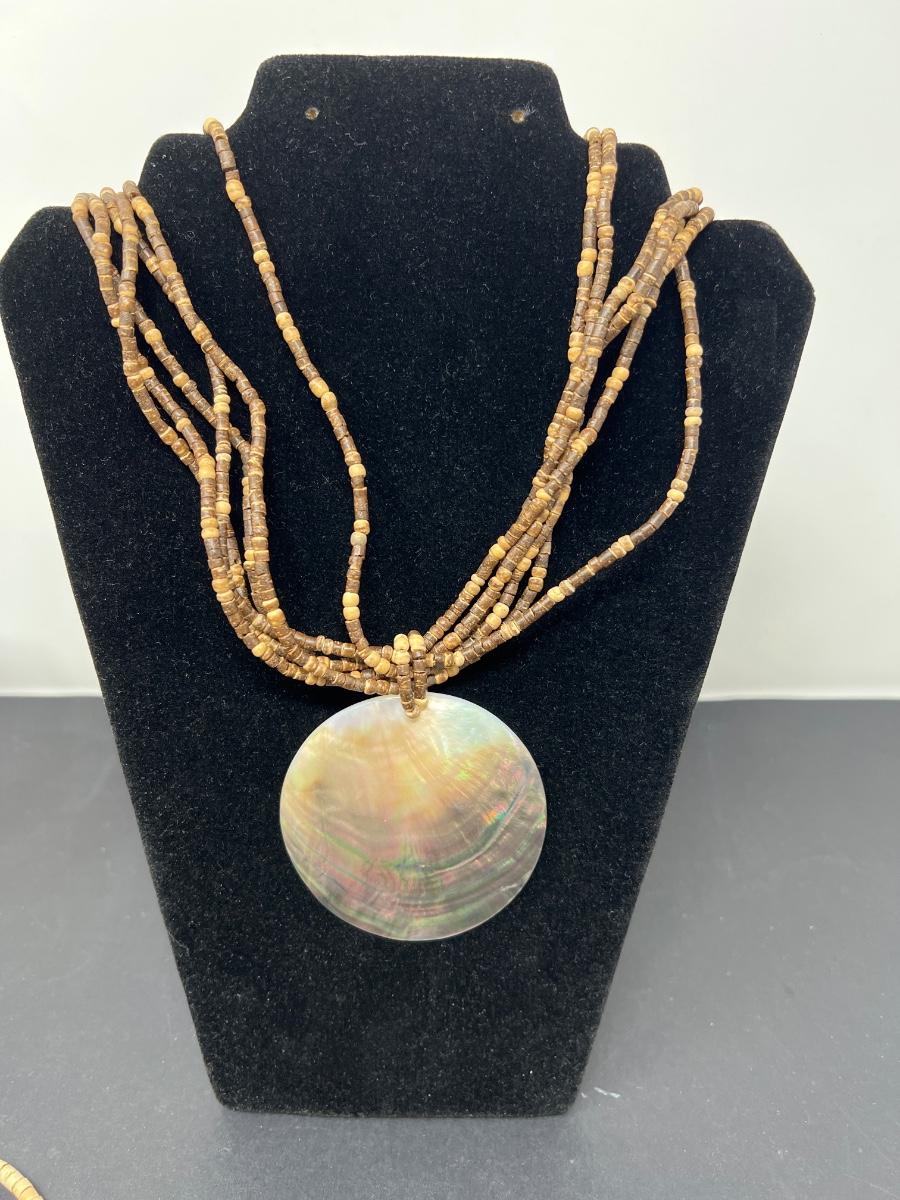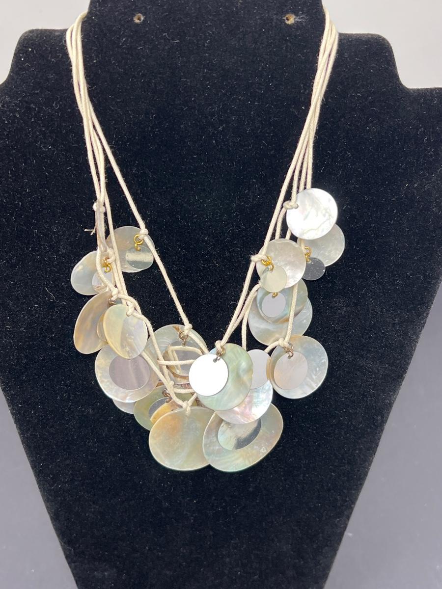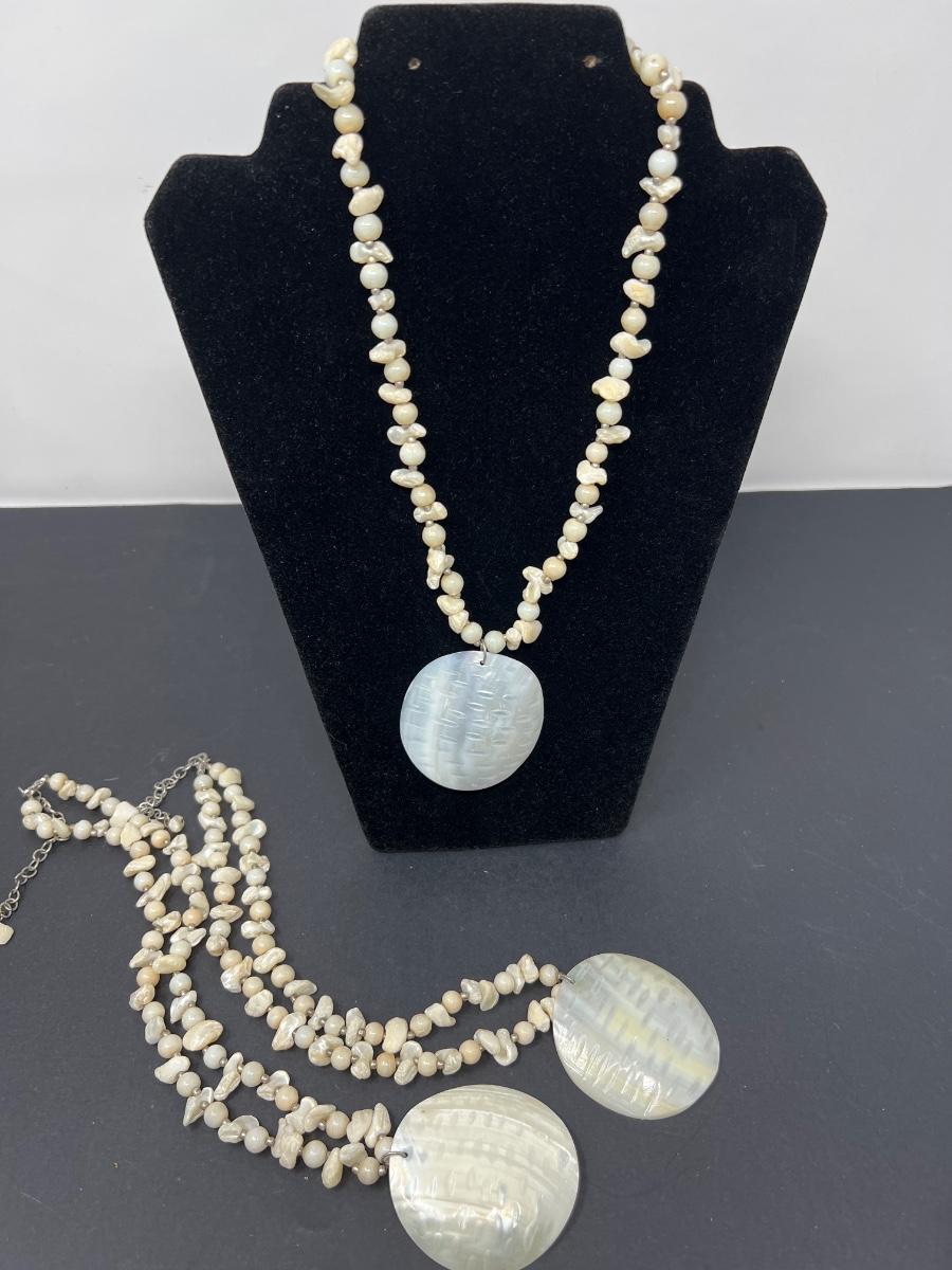 Medallion necklaces with one strand and others three strand with single mother of pearl shell. (6 total)