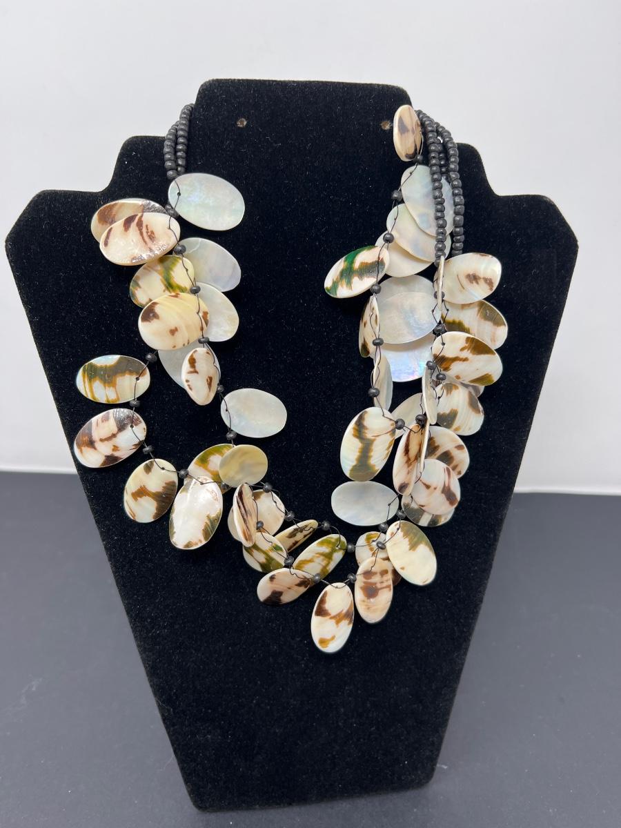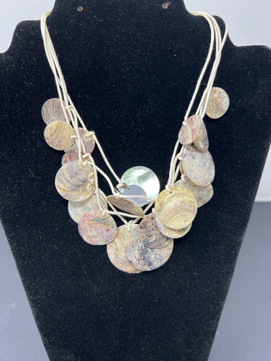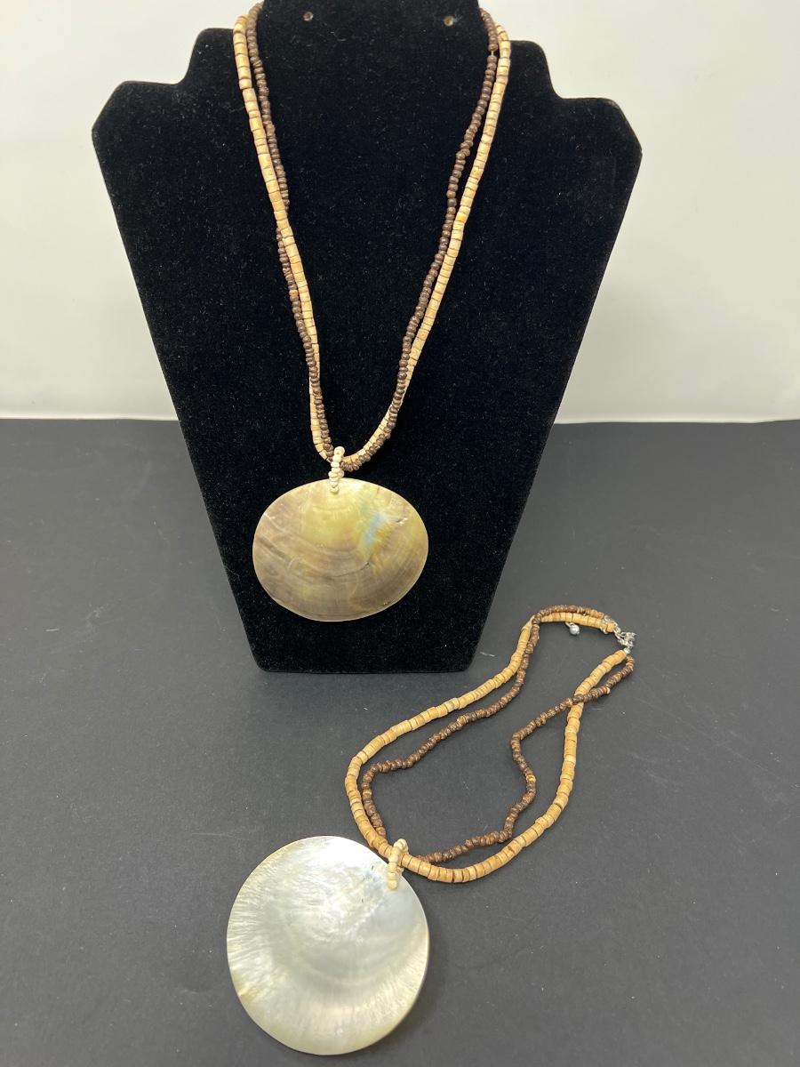 Medallion necklaces with one strand and others three strand with single mother of pearl shell. (6 total)