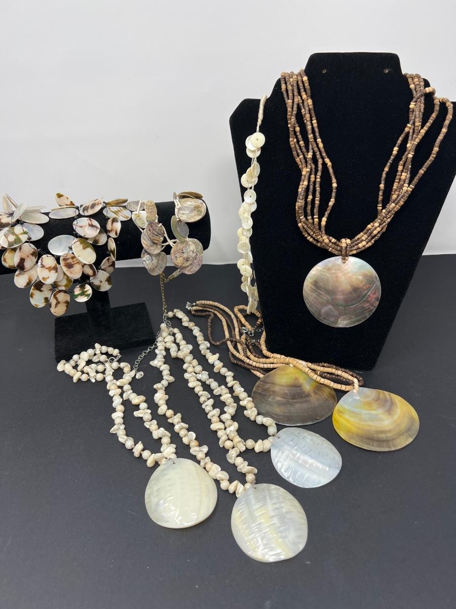 Appear to be genuine shells. Some beading is faux and the white necklaces appear to be shell and faux beaded.