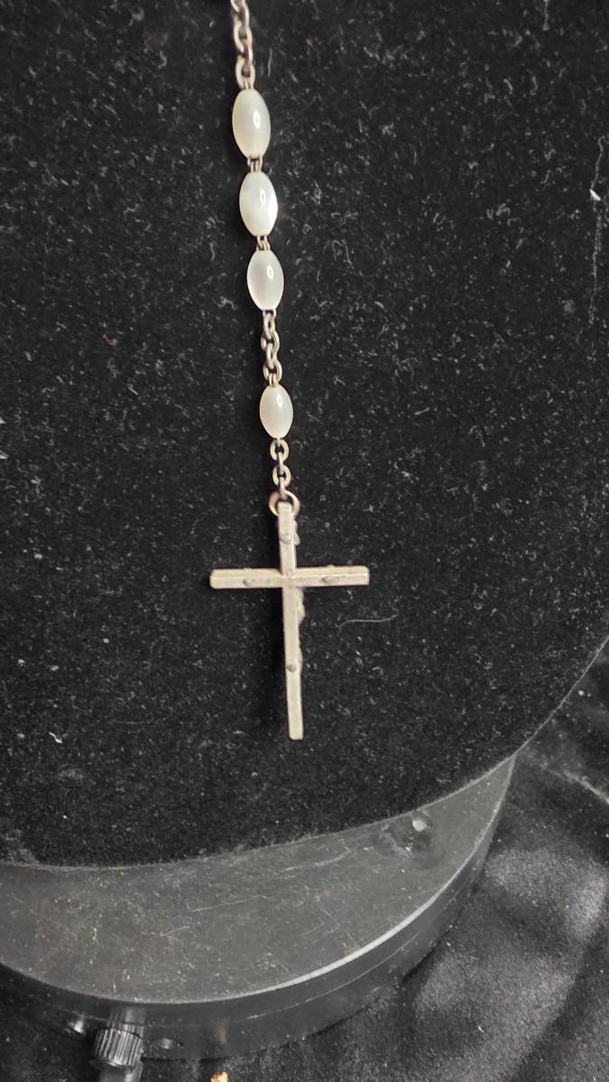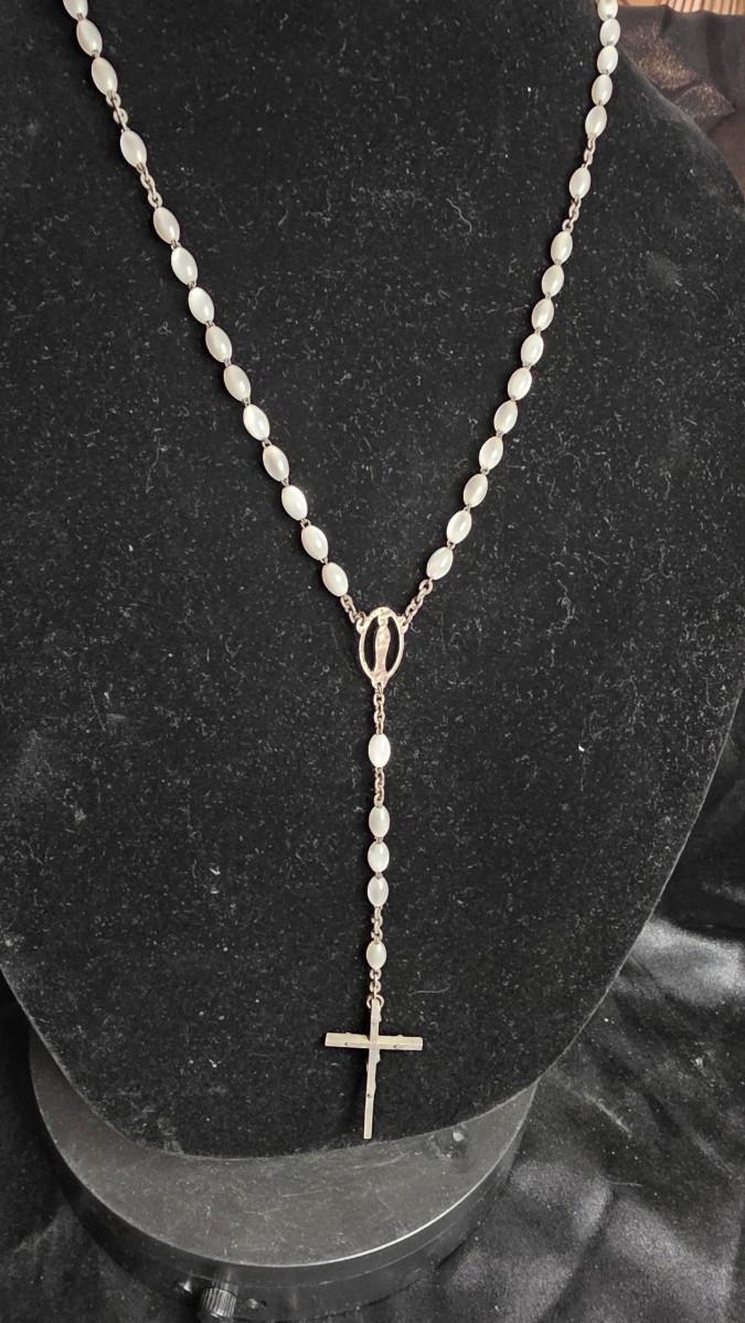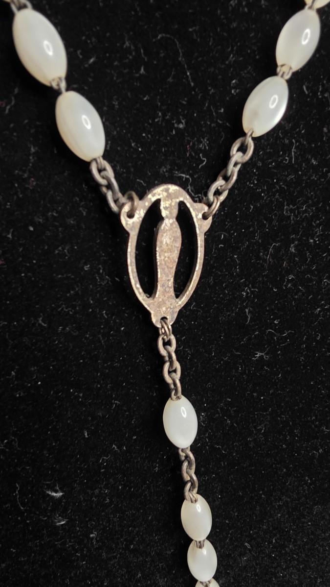 Vintage Mother-of-Pearl Bead Rosary Necklace with Silver-Tone Cross – Graceful & Timeless