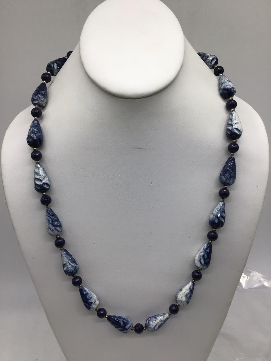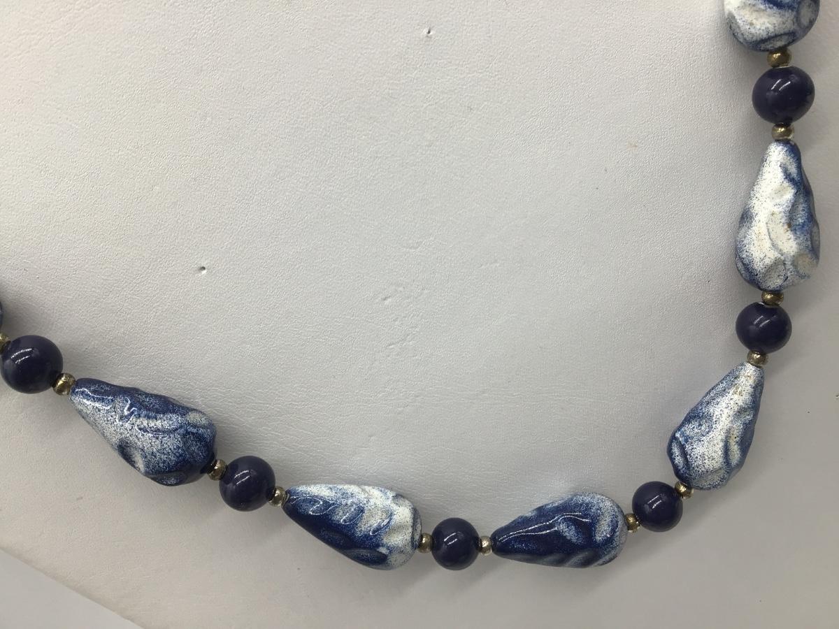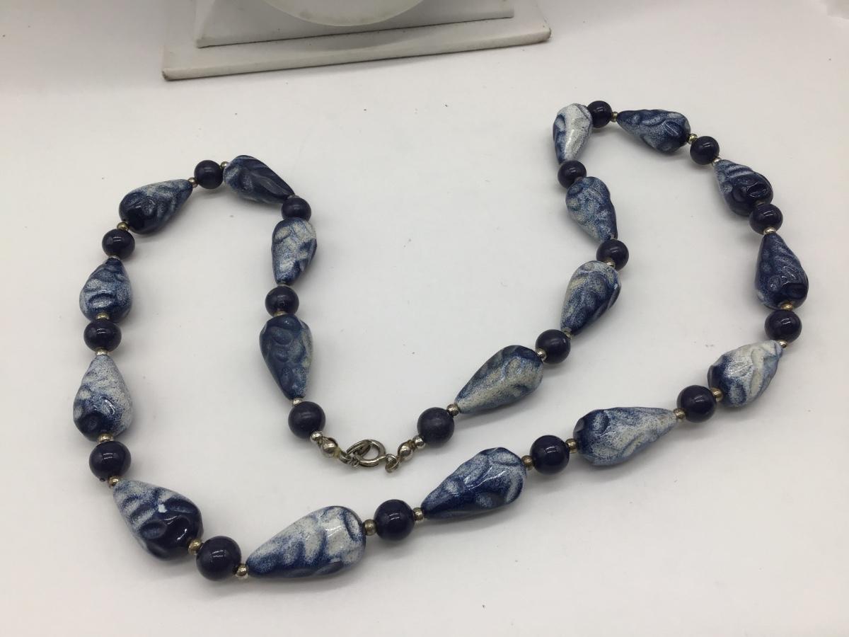 Vintage Mottled Blue Beaded Necklace Geometric Shapes Silver Tone Spacers