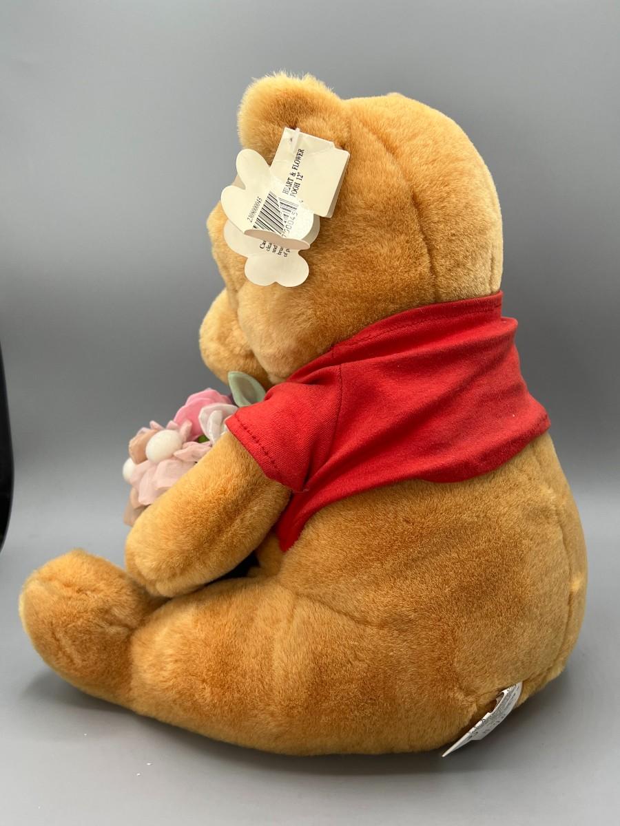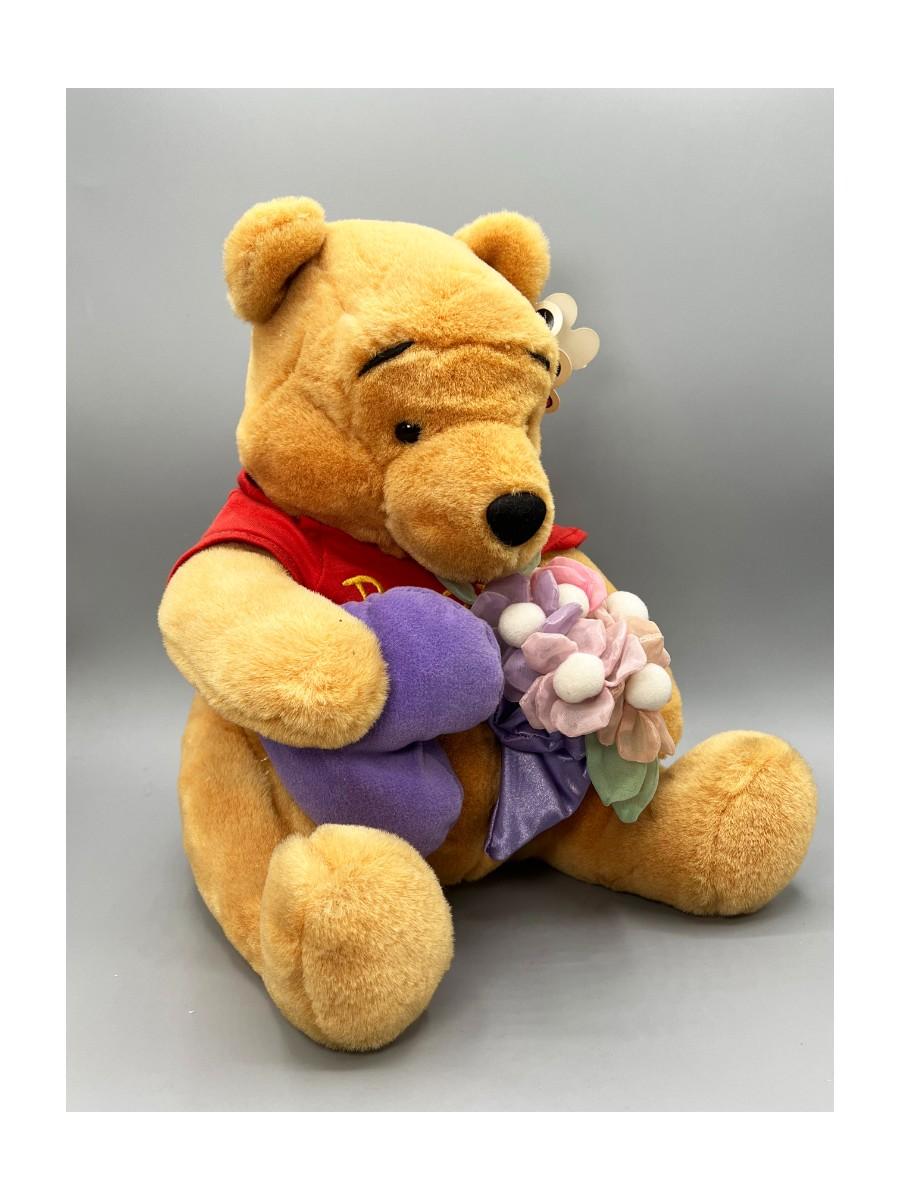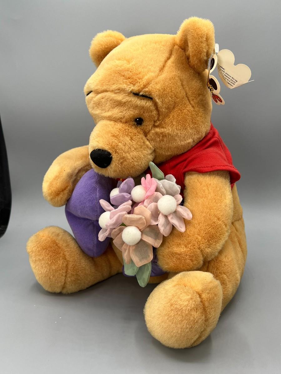 Vintage Mouseketoys Winnie The Pooh Plush Stuffed Animal. Winnie the pooh is holding heart and flowers. Original tags attached. May be dusty from age, display, and storage.