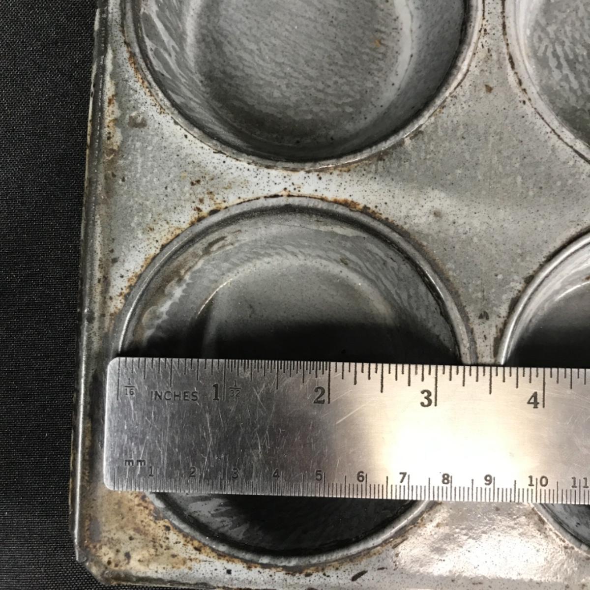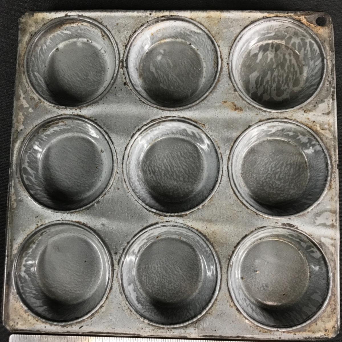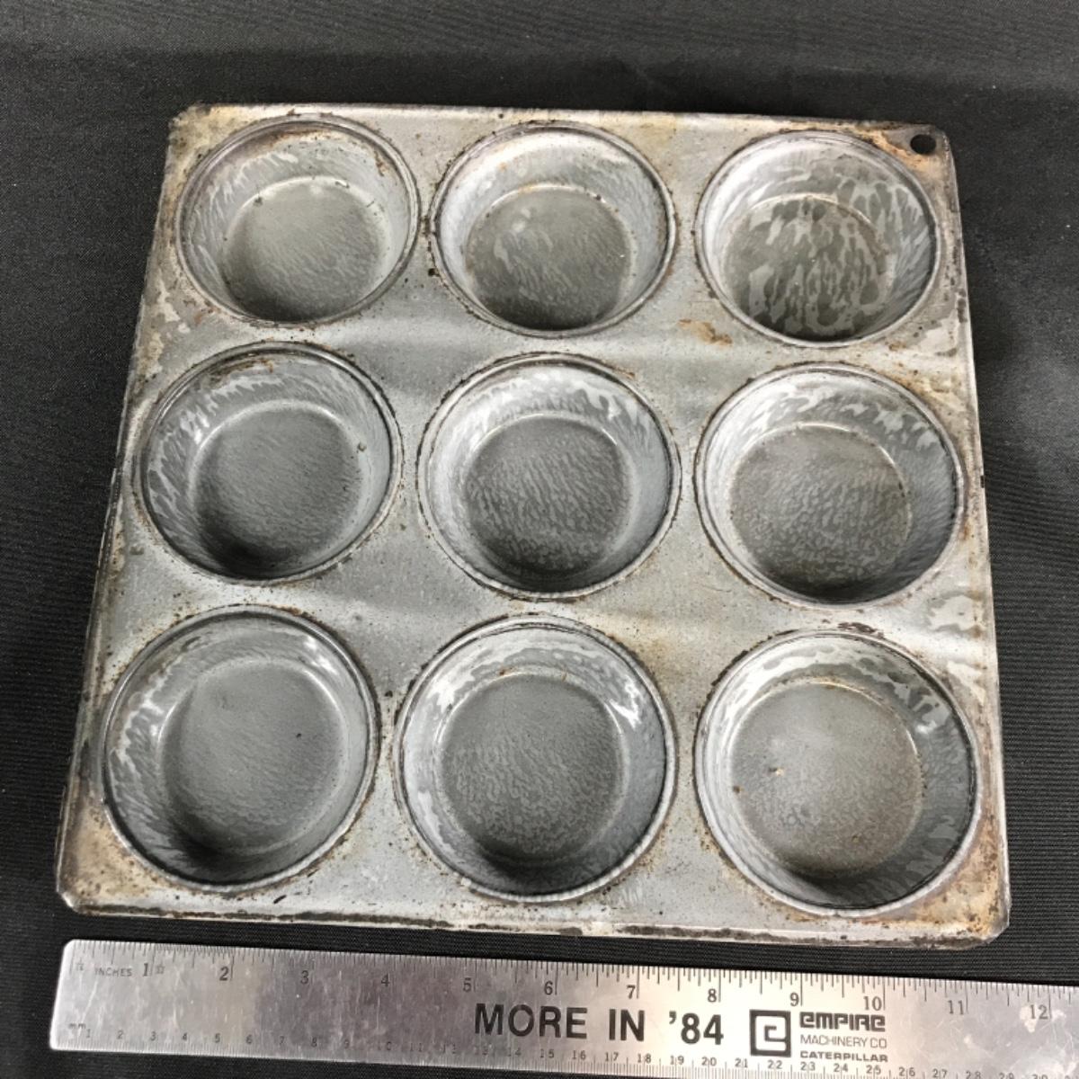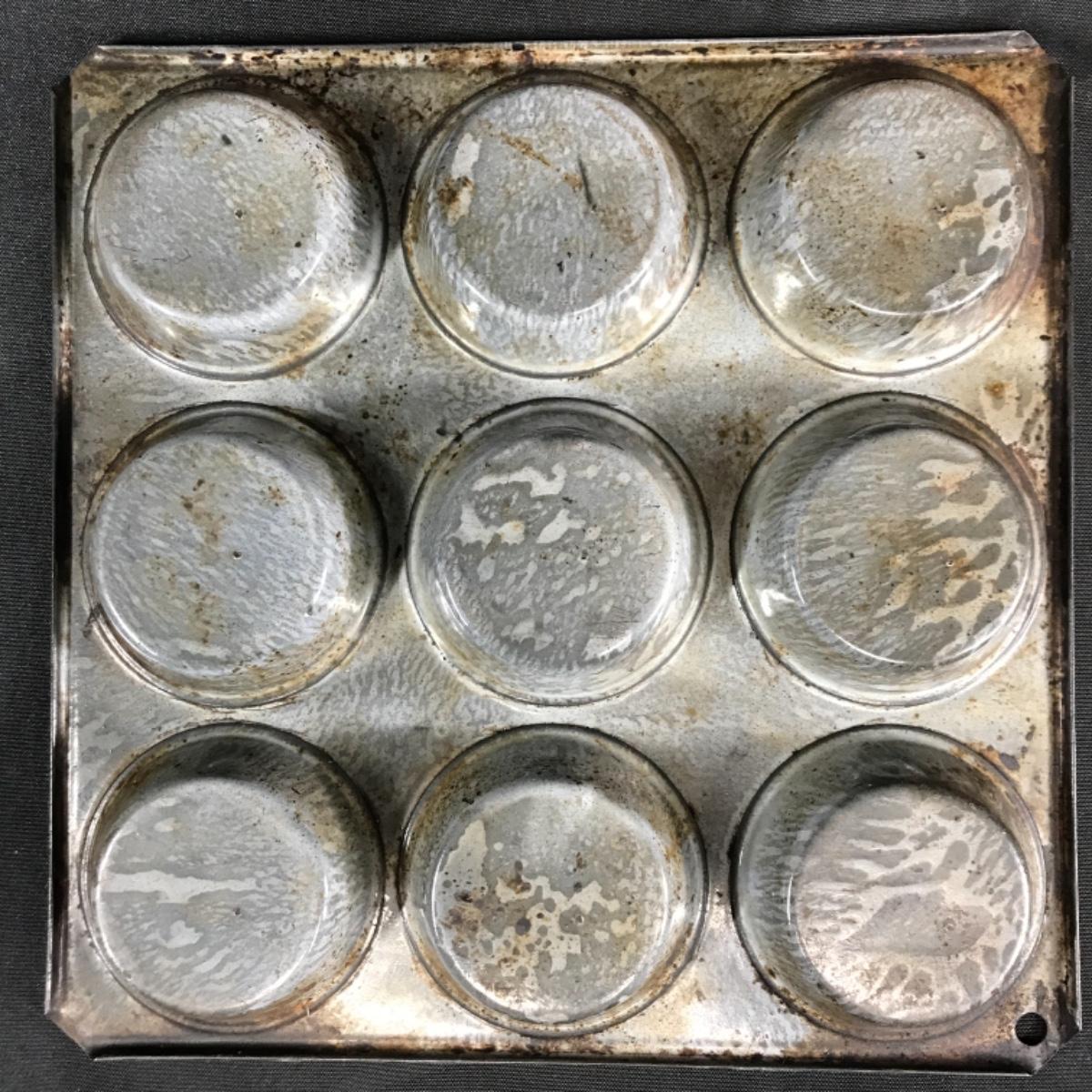 Up for auction is a vintage muffin baking pan. It can accommodate nine muffins. This piece has some patina indicating its age; see pictures.