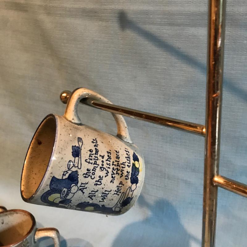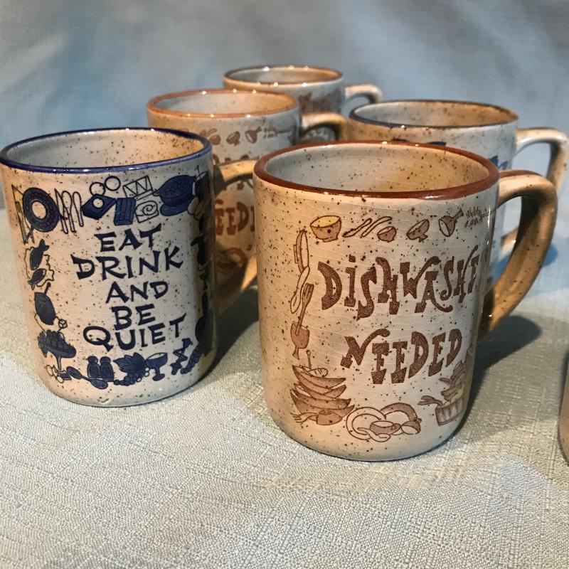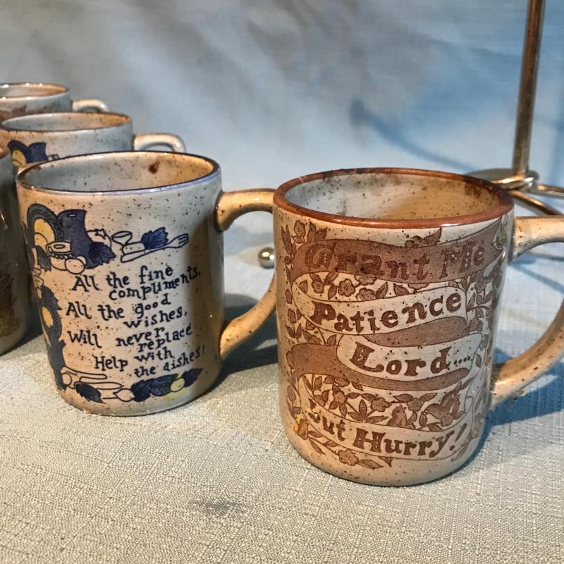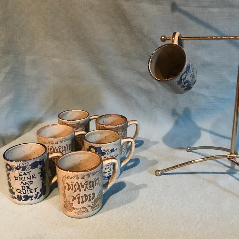 Lot includes 7 mugs, all in similar style with different phrases/quotes. Includes mug holder. No Shipping. Local pickup only in Hendersonville, NC.