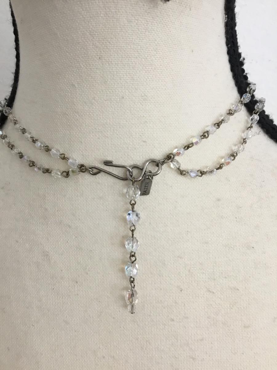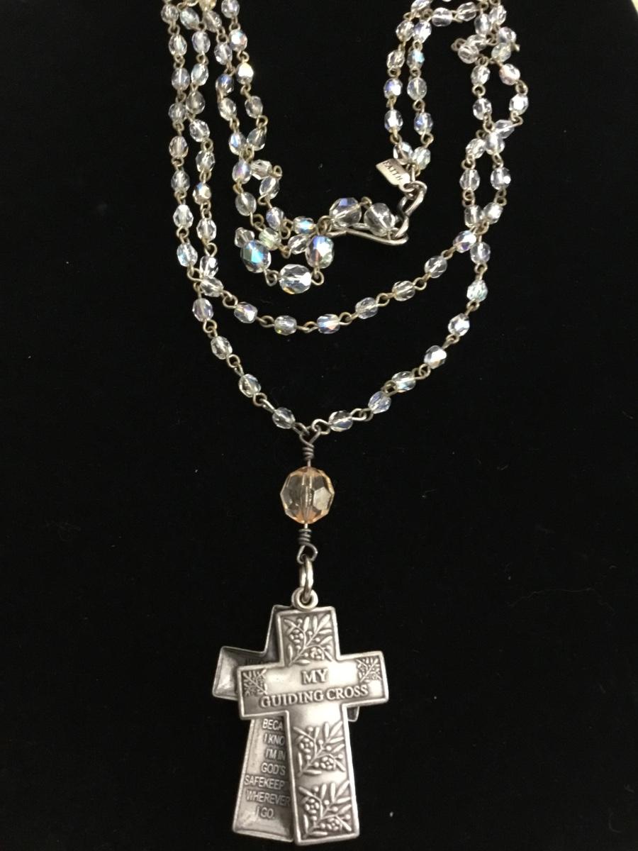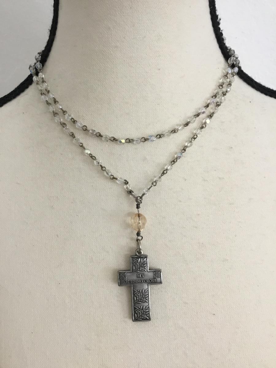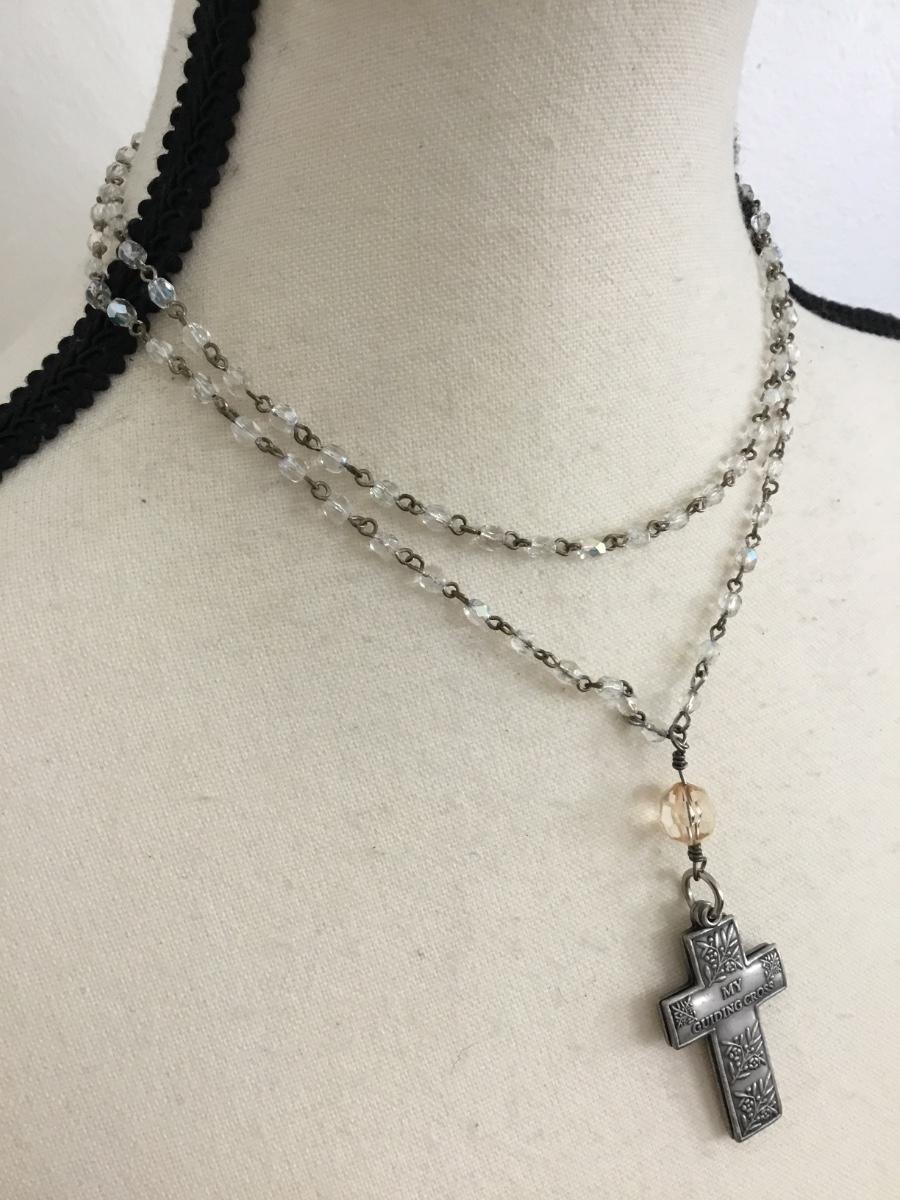 Vintage multi layer, crystal bead choker style necklace with silver tone cross pendant