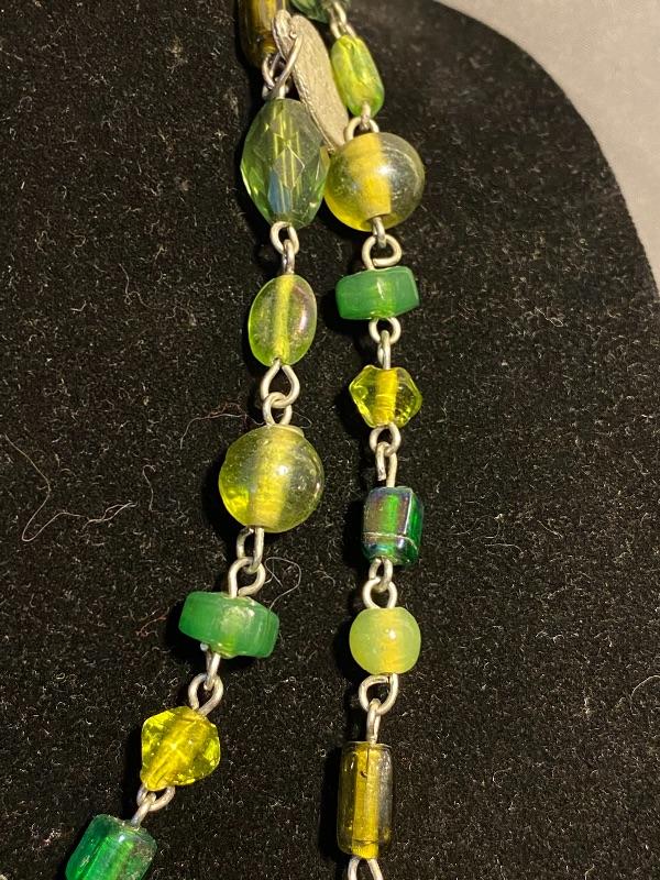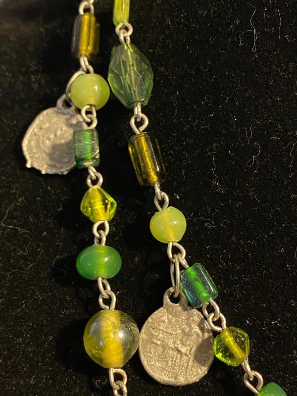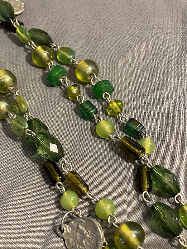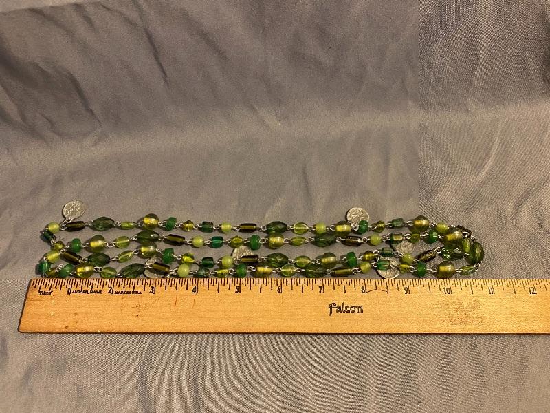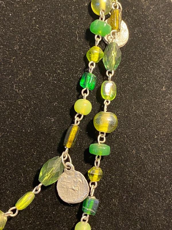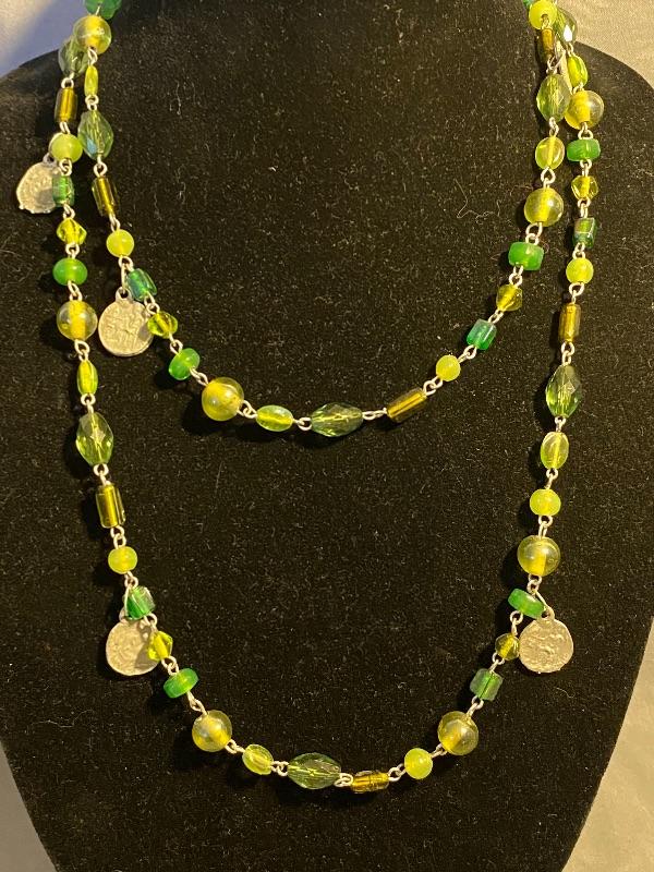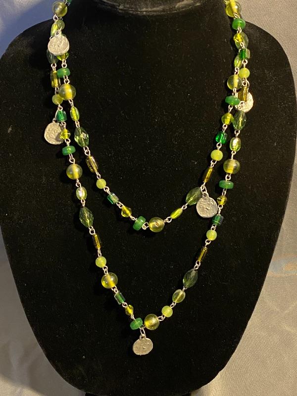 Vintage multi shades of green beaded necklace. Beads are different shapes and sizes, all are glass. Set on metal links. Necklace is accented with faux coins. Long length, could be doubled. Measures about 21".