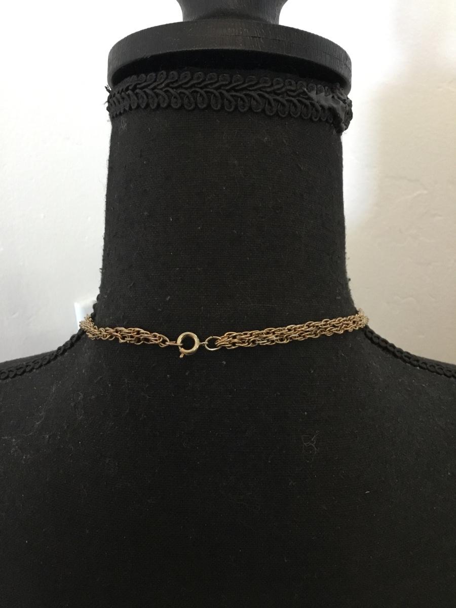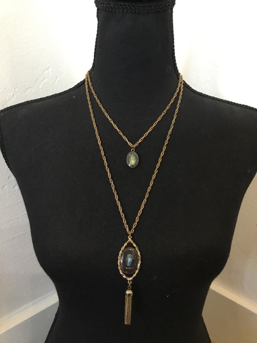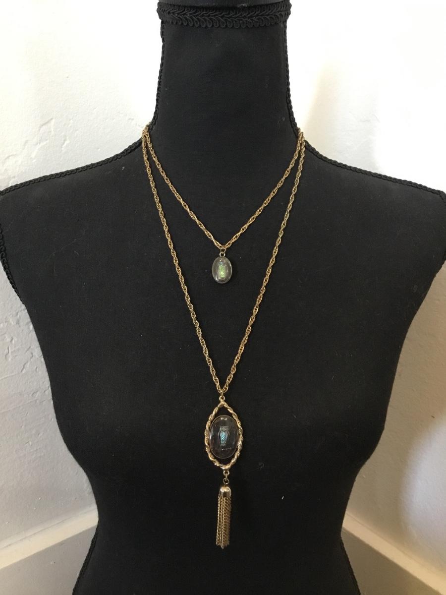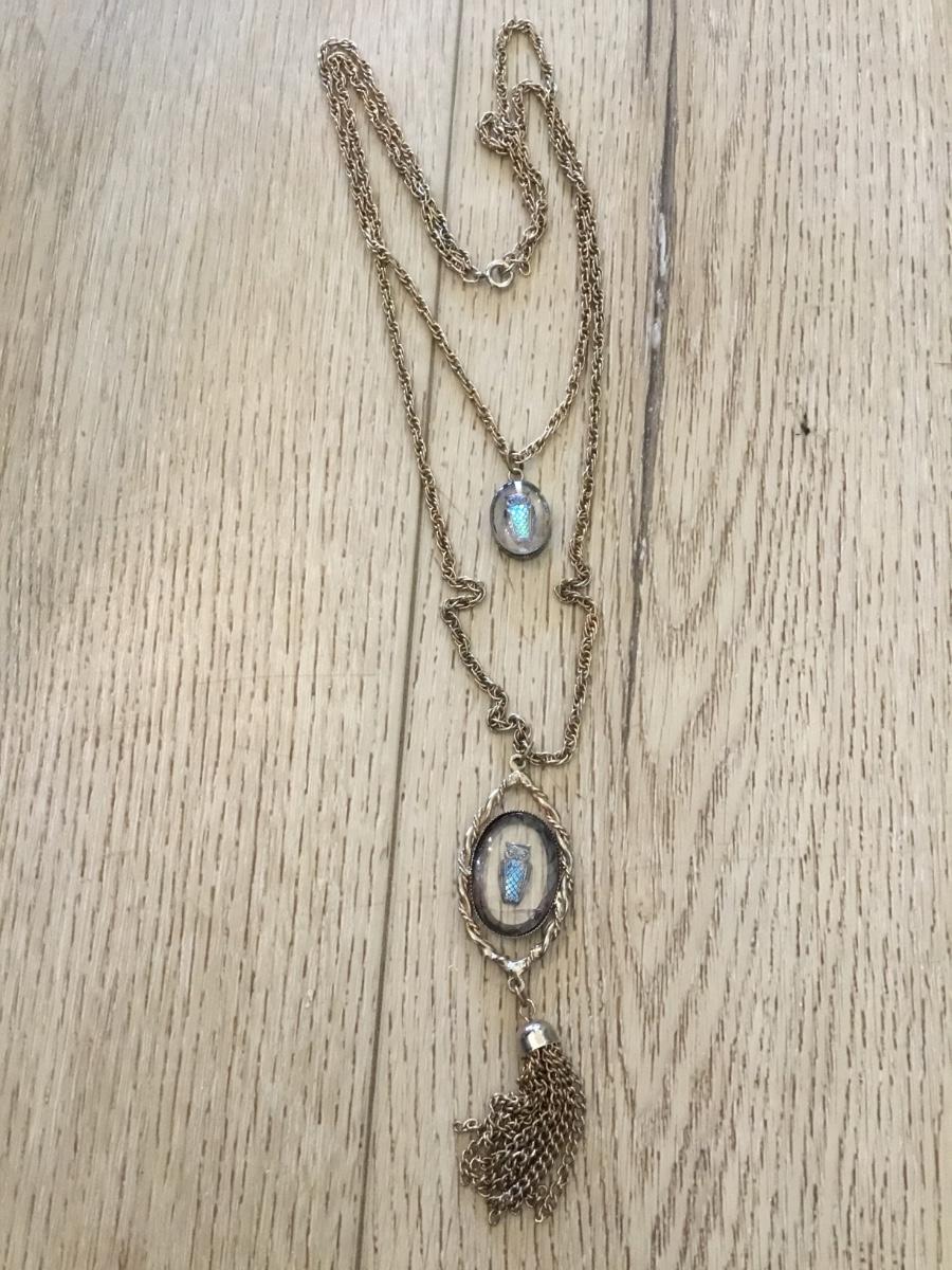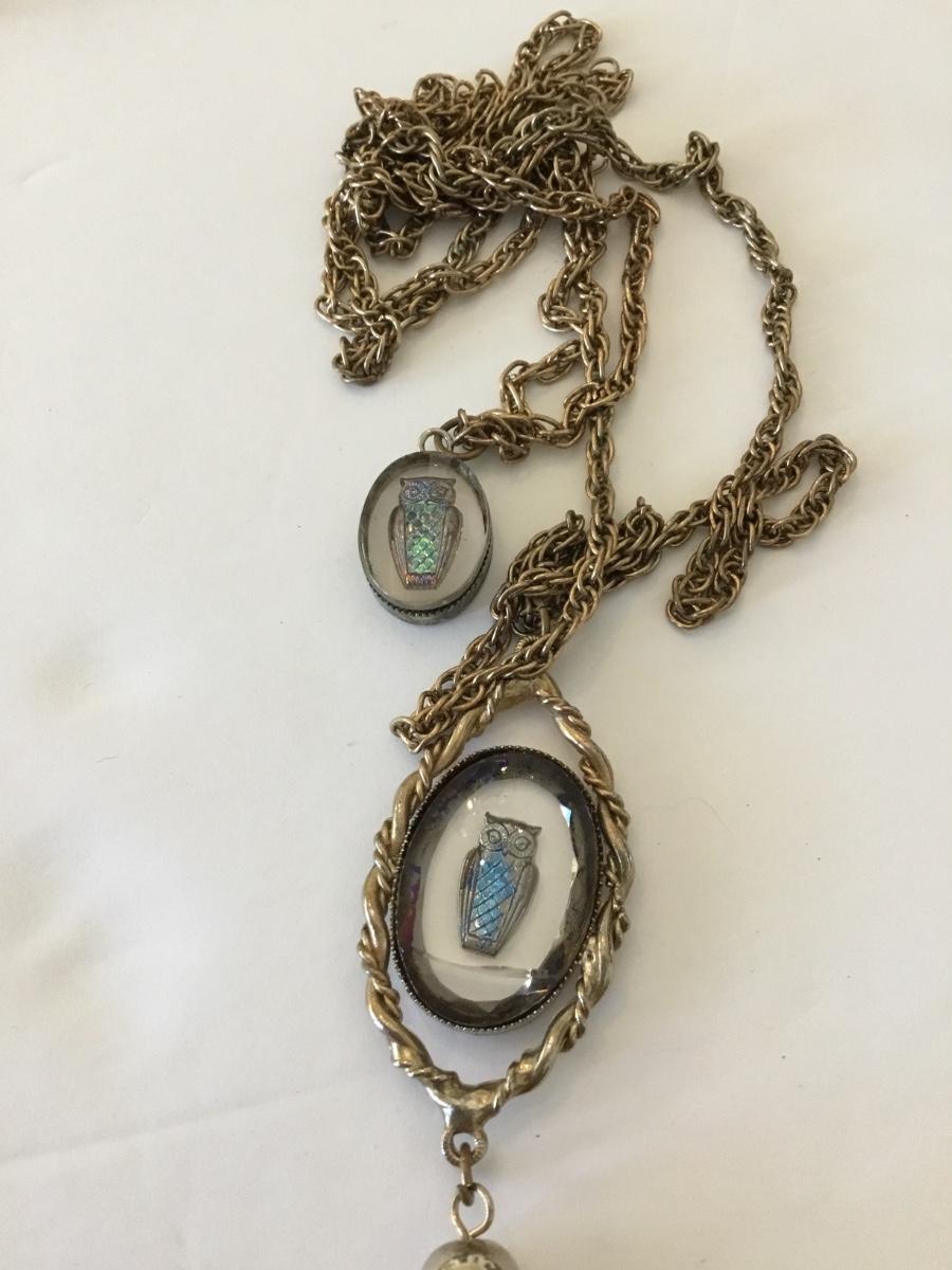 Vintage Multi strand, gold tone, chain necklace, vintage indigo owl glass pendant