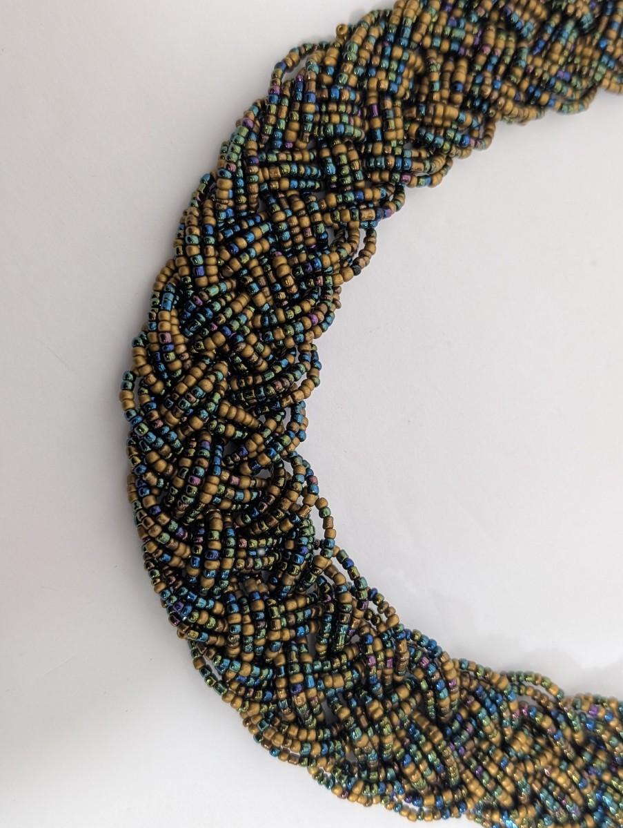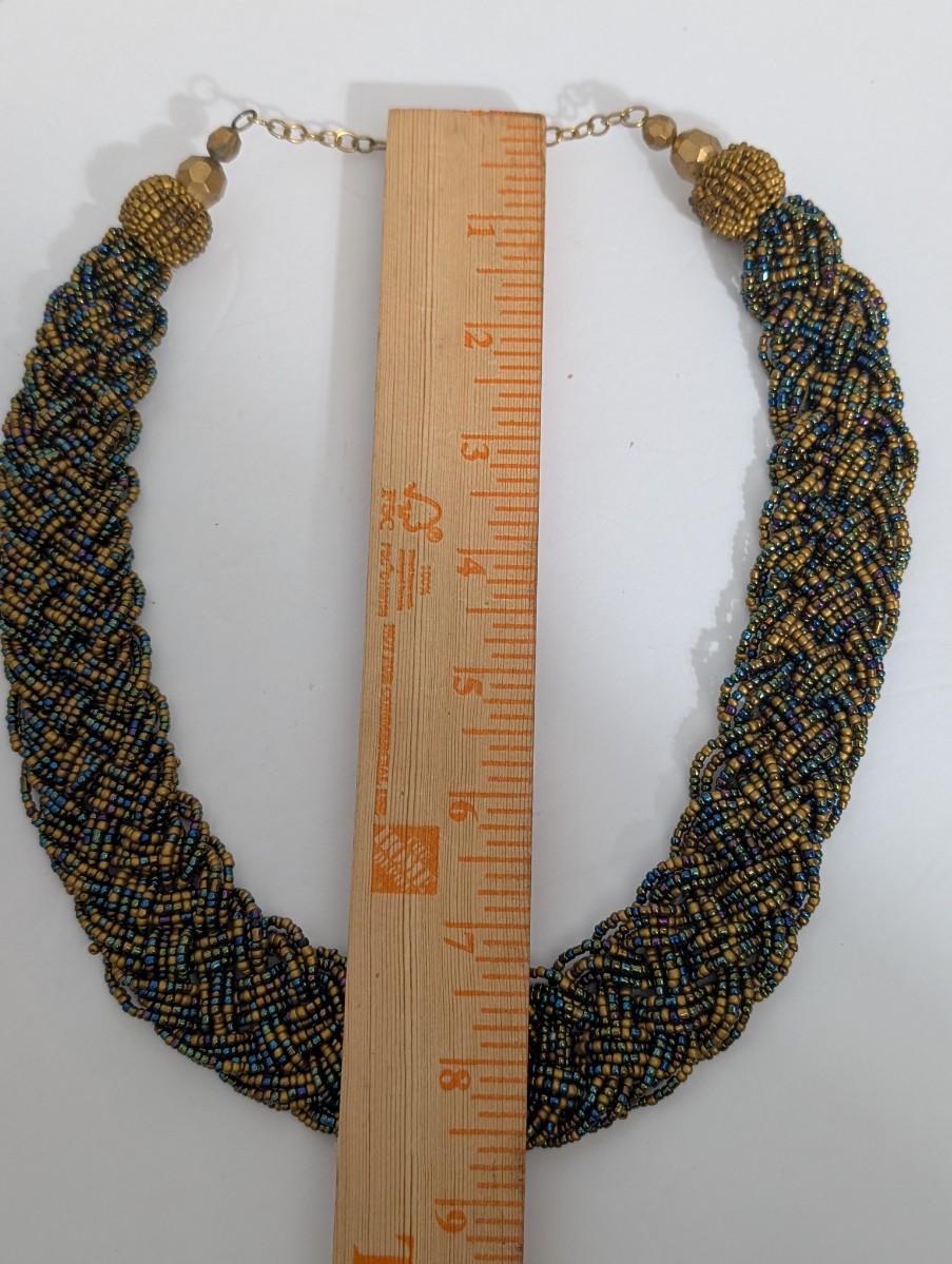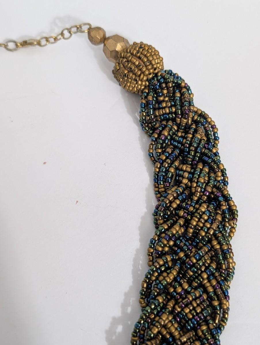 Vintage statement necklace featuring densely woven multi strand seed beads in a rich mix of gold tone, blue, green, and iridescent hues. The necklace forms a thick collar style with a braided, textured appearance that sits beautifully as a focal piece. Finished with gold tone bead caps, faceted accent beads, and an adjustable chain closure. No maker’s mark observed. A bold vintage accessory with strong bohemian and evening wear appeal.