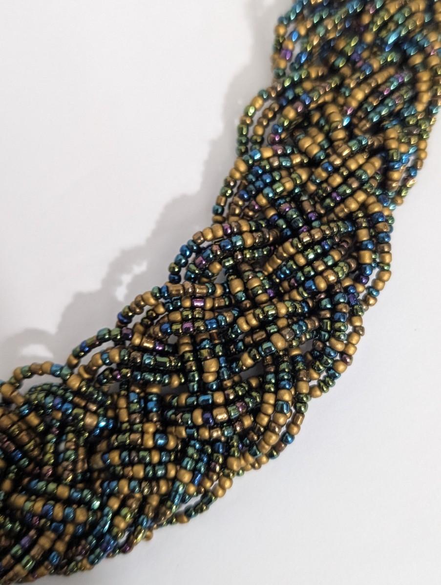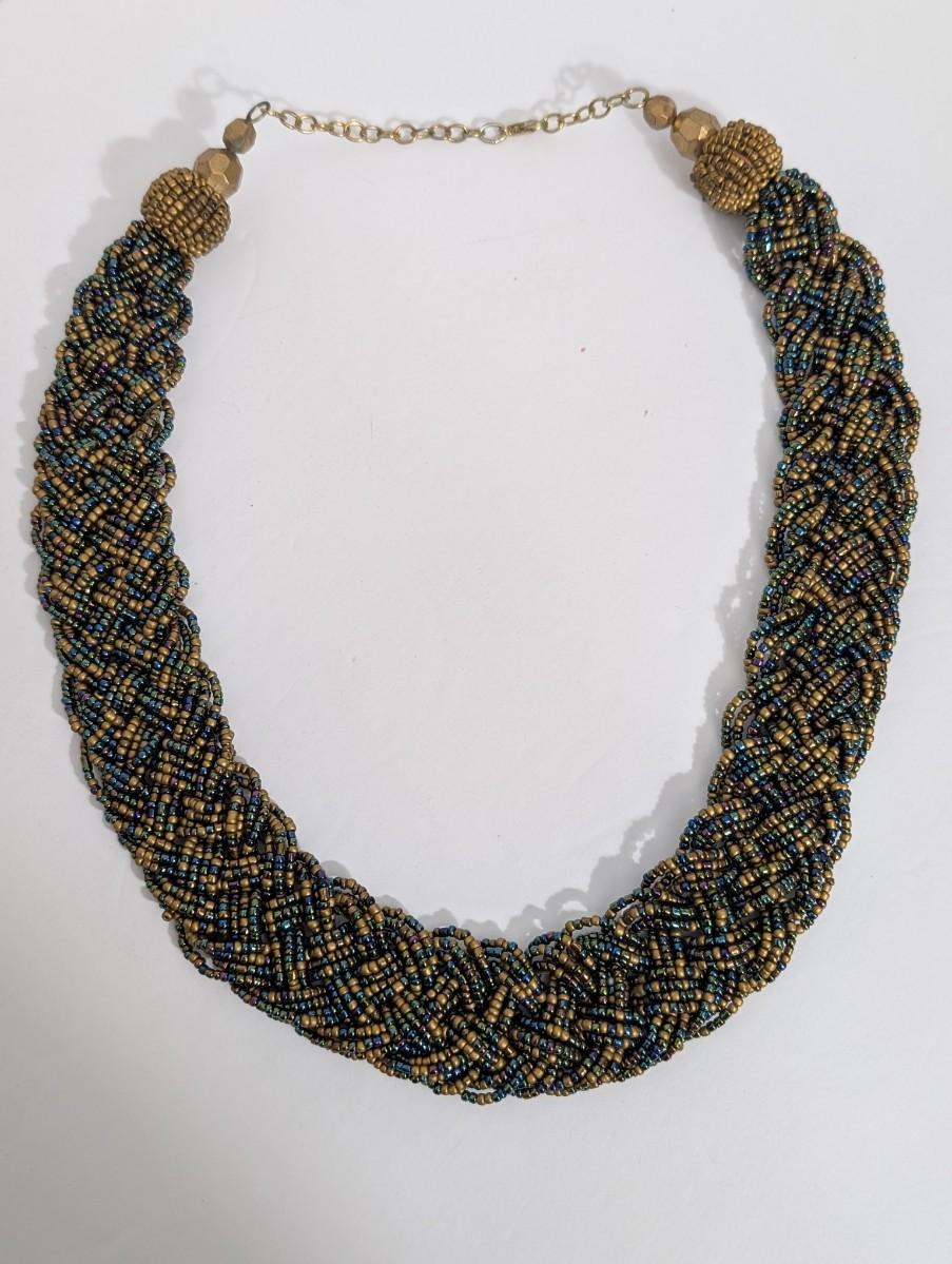 Vintage statement necklace featuring densely woven multi strand seed beads in a rich mix of gold tone, blue, green, and iridescent hues. The necklace forms a thick collar style with a braided, textured appearance that sits beautifully as a focal piece. Finished with gold tone bead caps, faceted accent beads, and an adjustable chain closure. No maker’s mark observed. A bold vintage accessory with strong bohemian and evening wear appeal.
