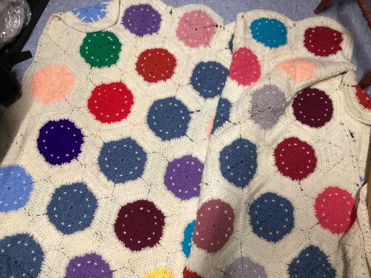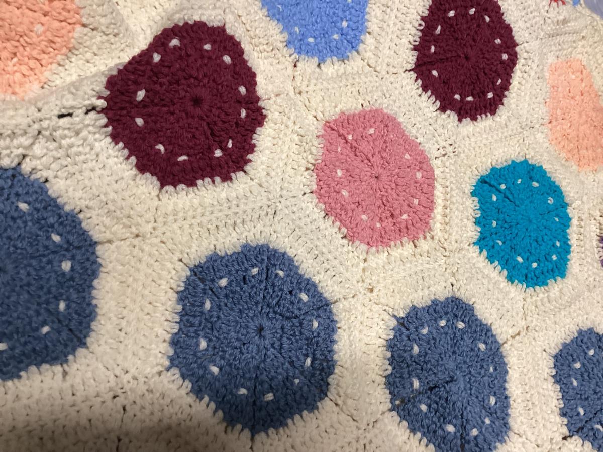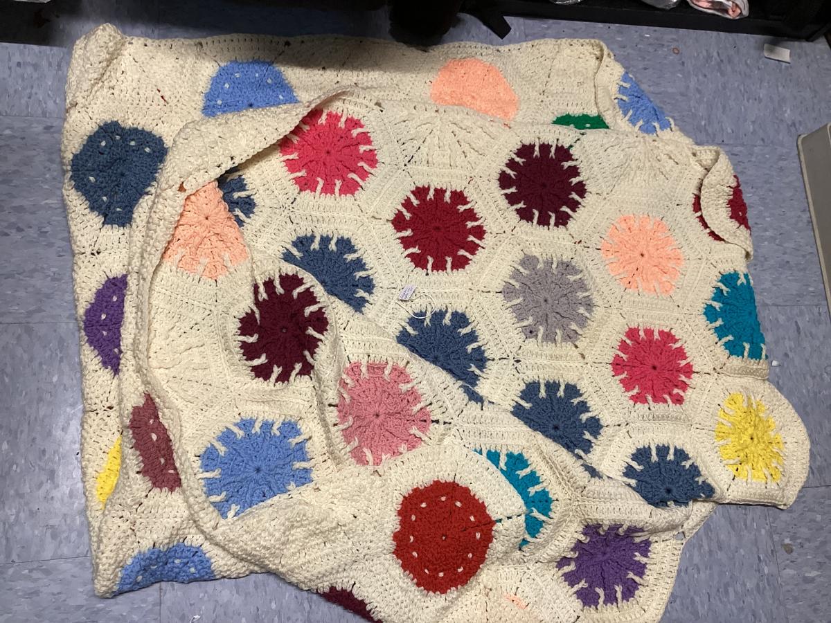 vintage multicolor hand crocheted Afghan blanket made of hexagon sunburst or granny squares