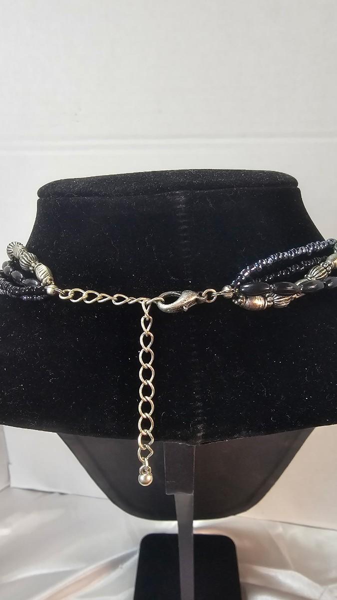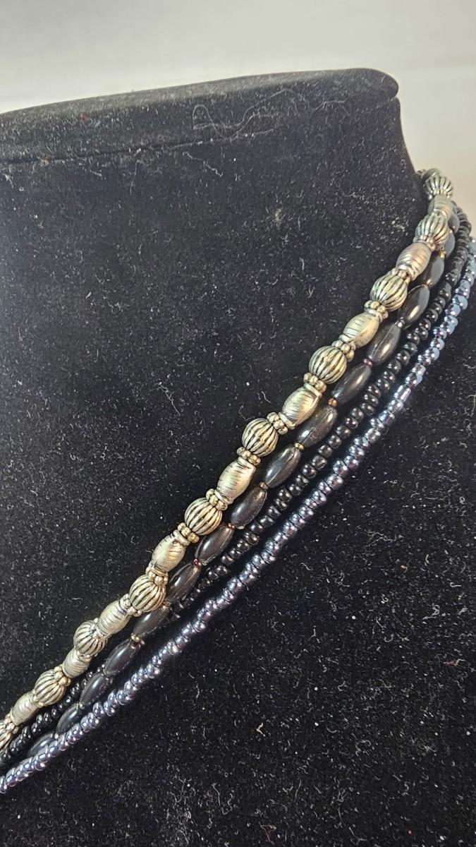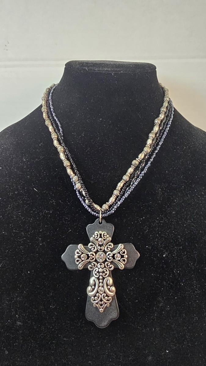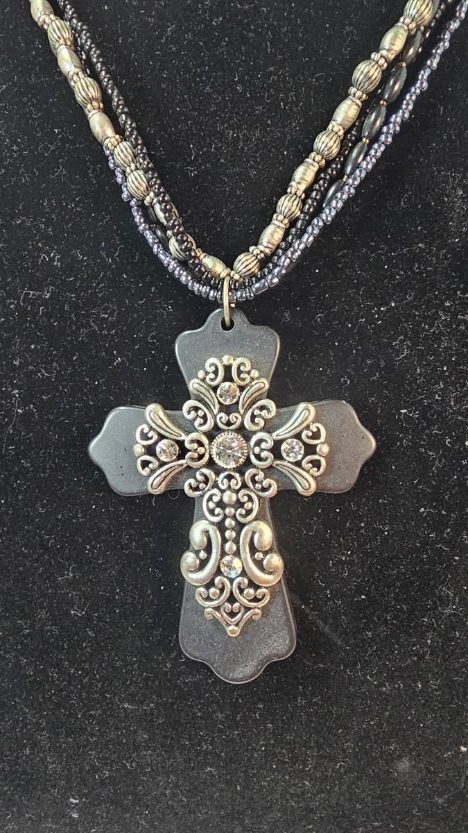 This striking vintage necklace presents a layered composition of finely strung beads paired with an ornate cross pendant that anchors the design with presence and craftsmanship. The necklace features multiple strands of coordinated beads in deep charcoal, black, and antiqued metallic tones, creating depth, contrast, and a refined visual rhythm when worn.