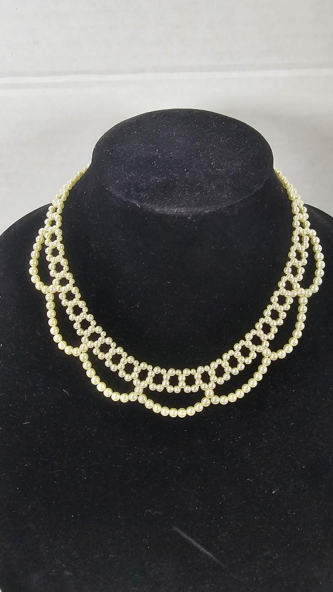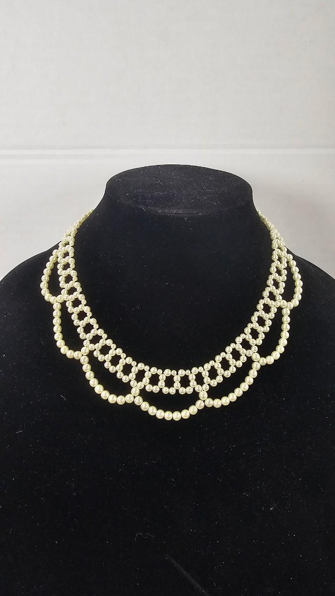 This vintage multi-strand necklace features a classic cream-toned faux pearl design, offering the elegant appearance of traditional pearl jewelry while remaining true to its costume construction. The necklace is composed of multiple strands of uniformly sized, softly lustrous beads, arranged in a layered drape that creates depth and visual movement across the neckline. The finish is smooth and consistent, reflecting light evenly for a refined, polished look.