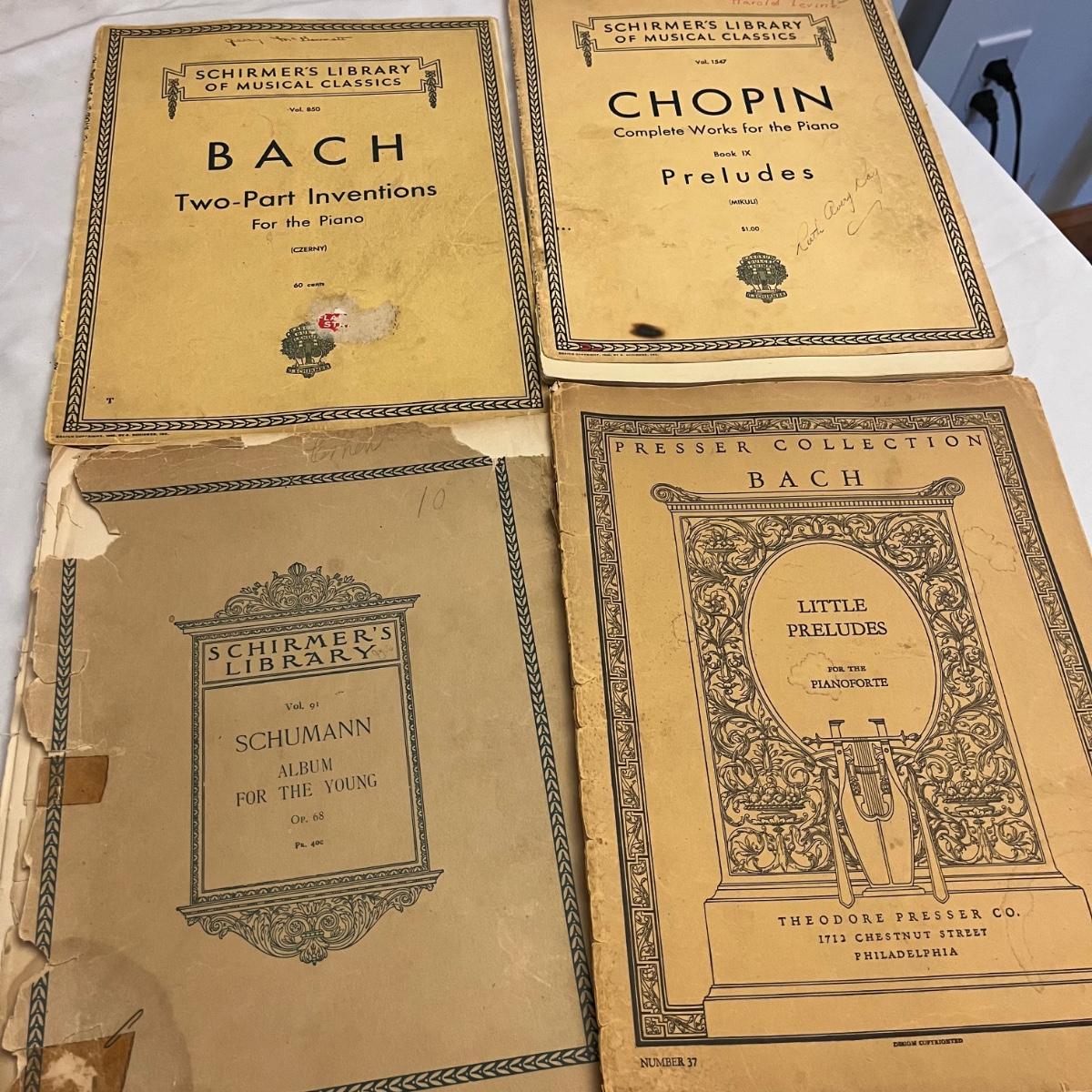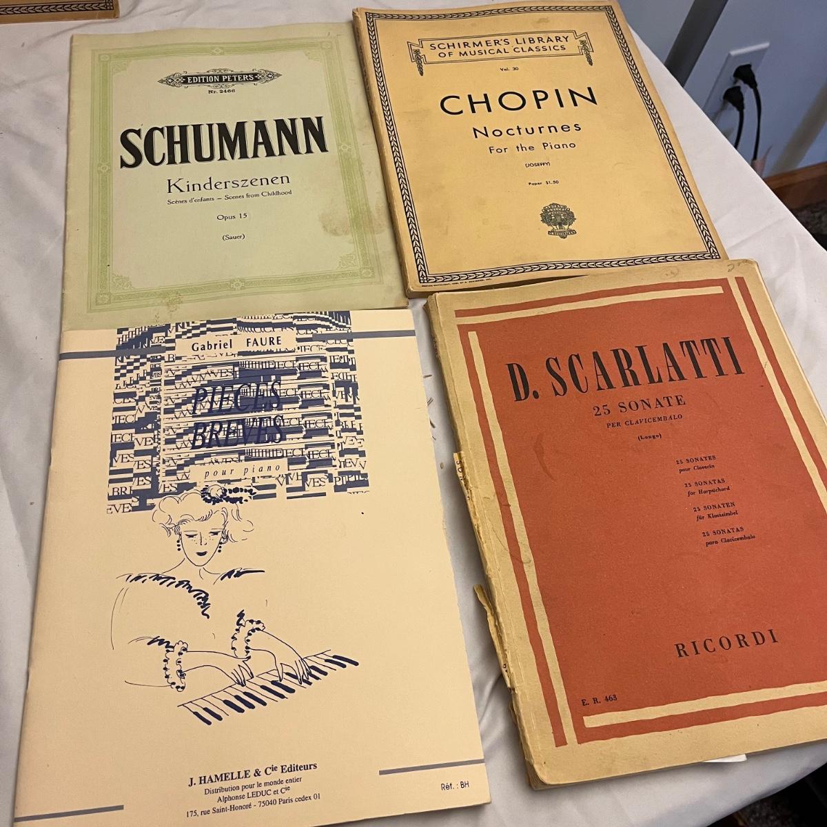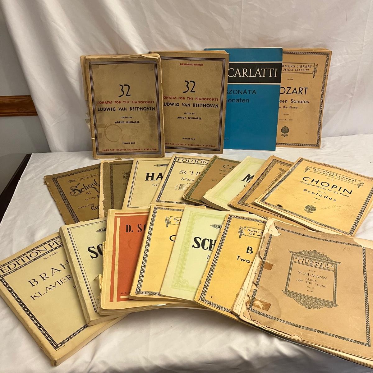Lot contains over fourteen music books including Mozart, Beethoven, Chopin, Brahms, Schubert and more. Some of the books are showing their age, see pictures.