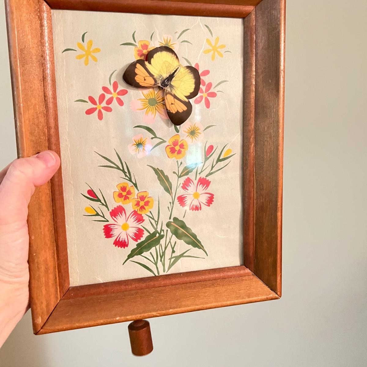 The frame has a clasp that needs replacing. Its a magnet music box where the butterfly moves across the frame when you pull the string. Buying "as is - as found" in this wonderful estate. See ALL PHOTOS for content, condition, & dimensions. NEVER a Buyer's Premium or Credit Card Fee added.