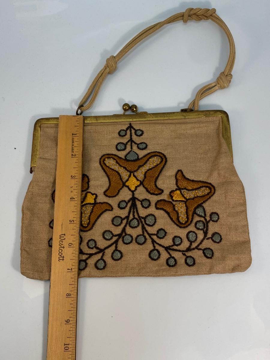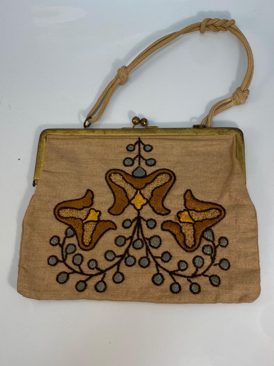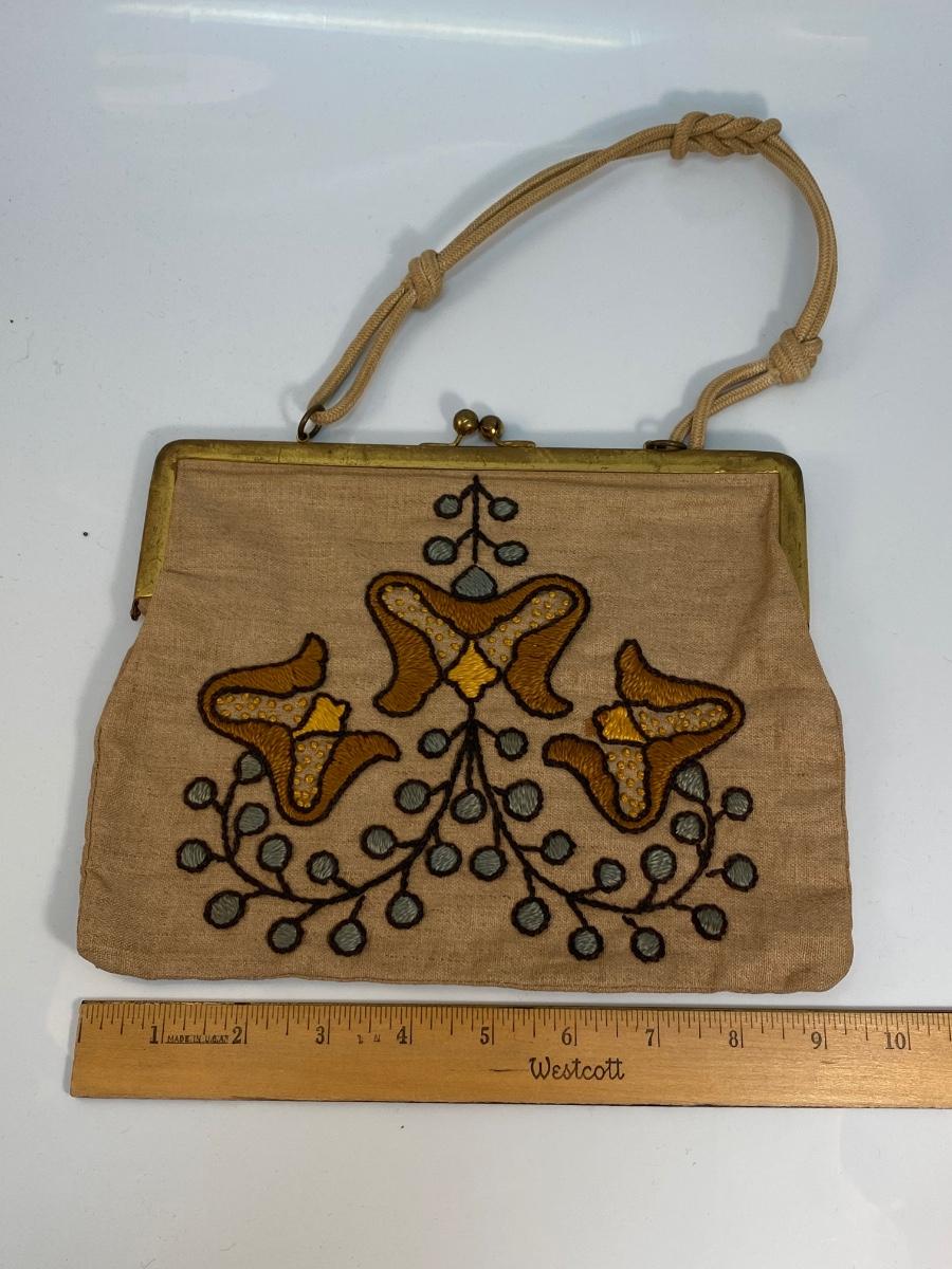 Vintage Muted Tone Floral Embroidered Handbag Purse. Has a natural vintage boho look to it. In good vintage condition, some light discolor as expected with age.
