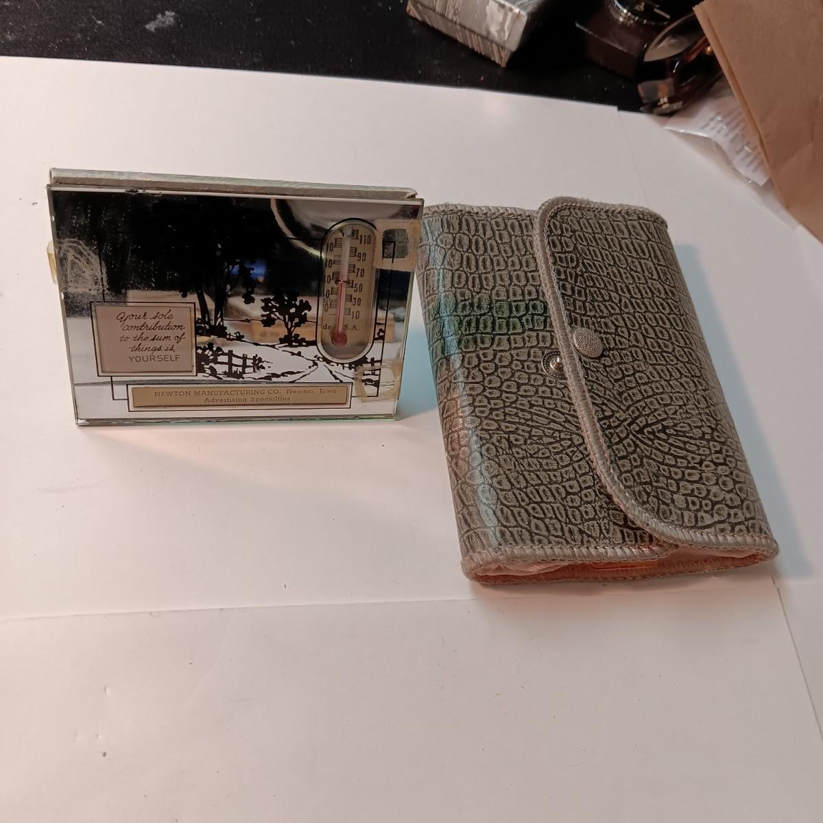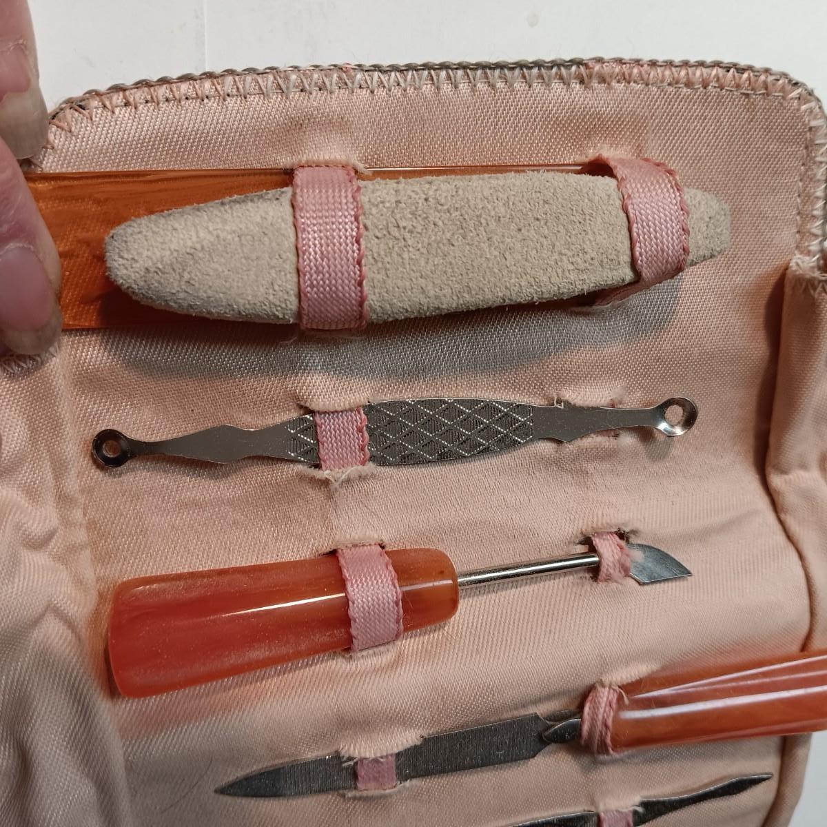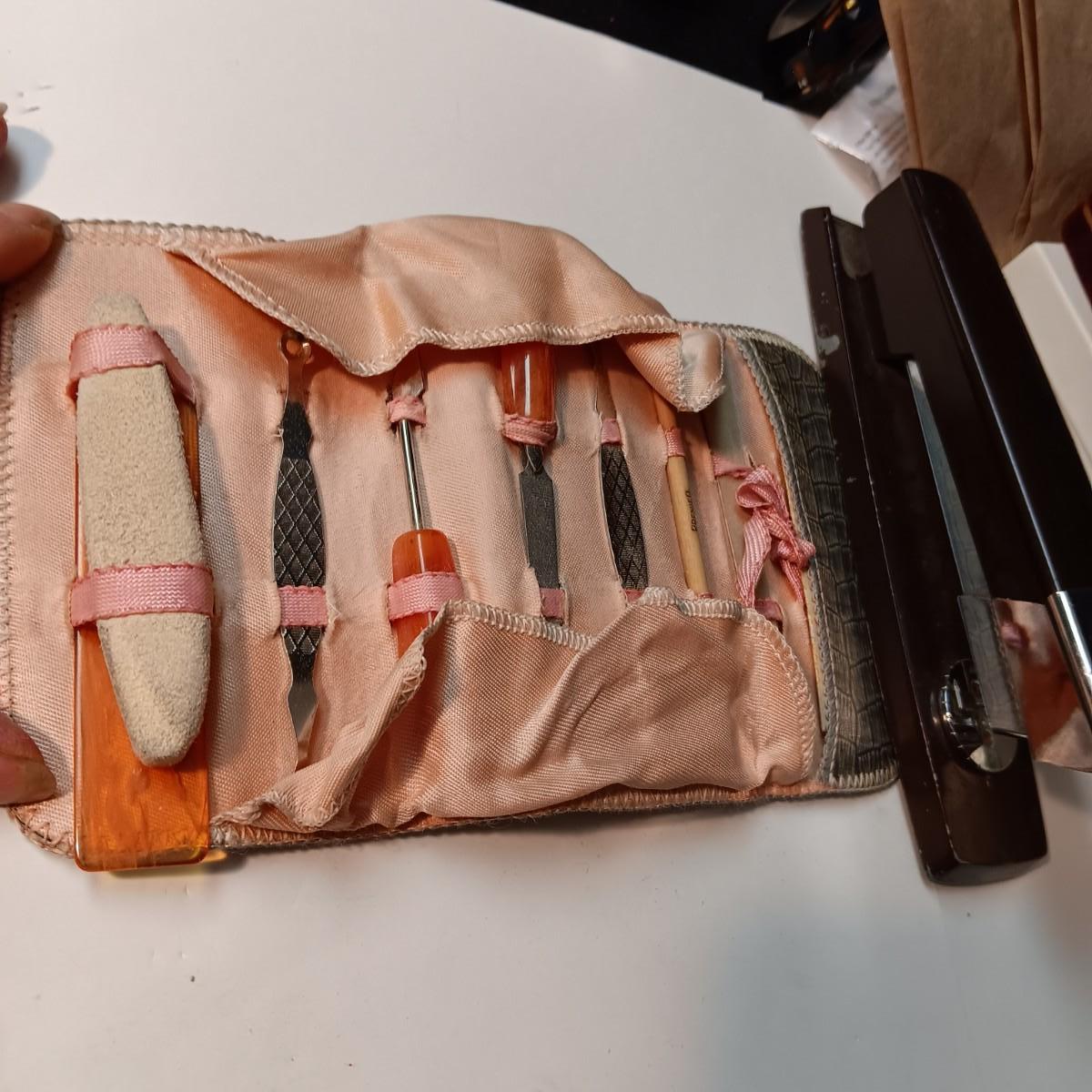 VINTAGE NAIL GROOMING KIT W/BAKELITE HANDLES AND A MIRRORED THERMOMETER