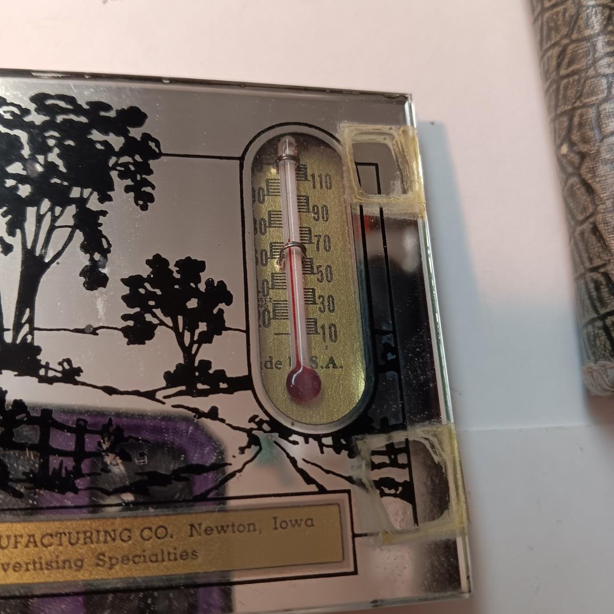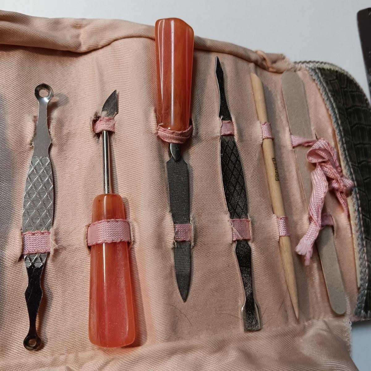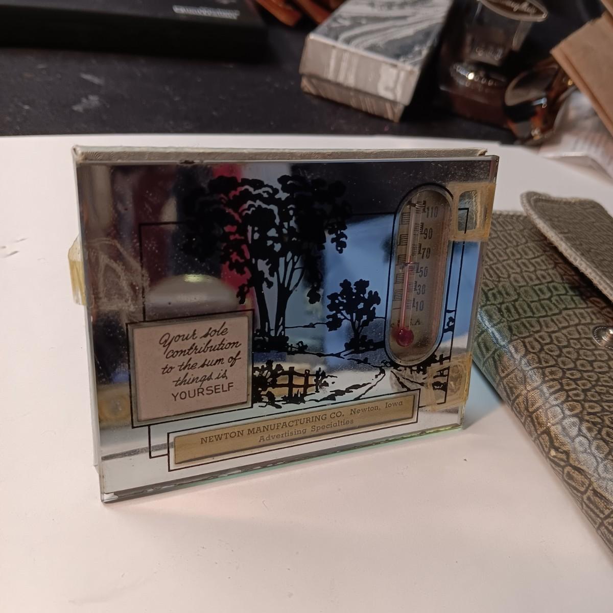 VINTAGE NAIL GROOMING KIT W/BAKELITE HANDLES AND A MIRRORED THERMOMETER
