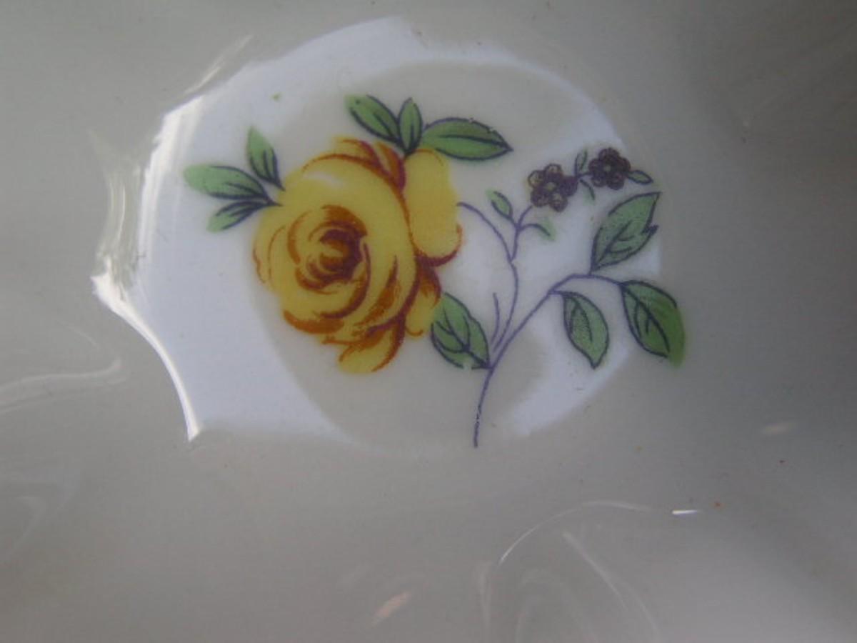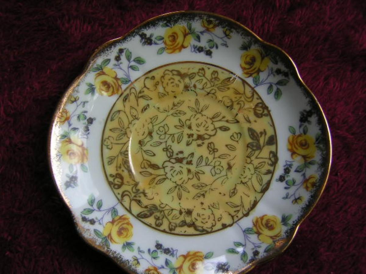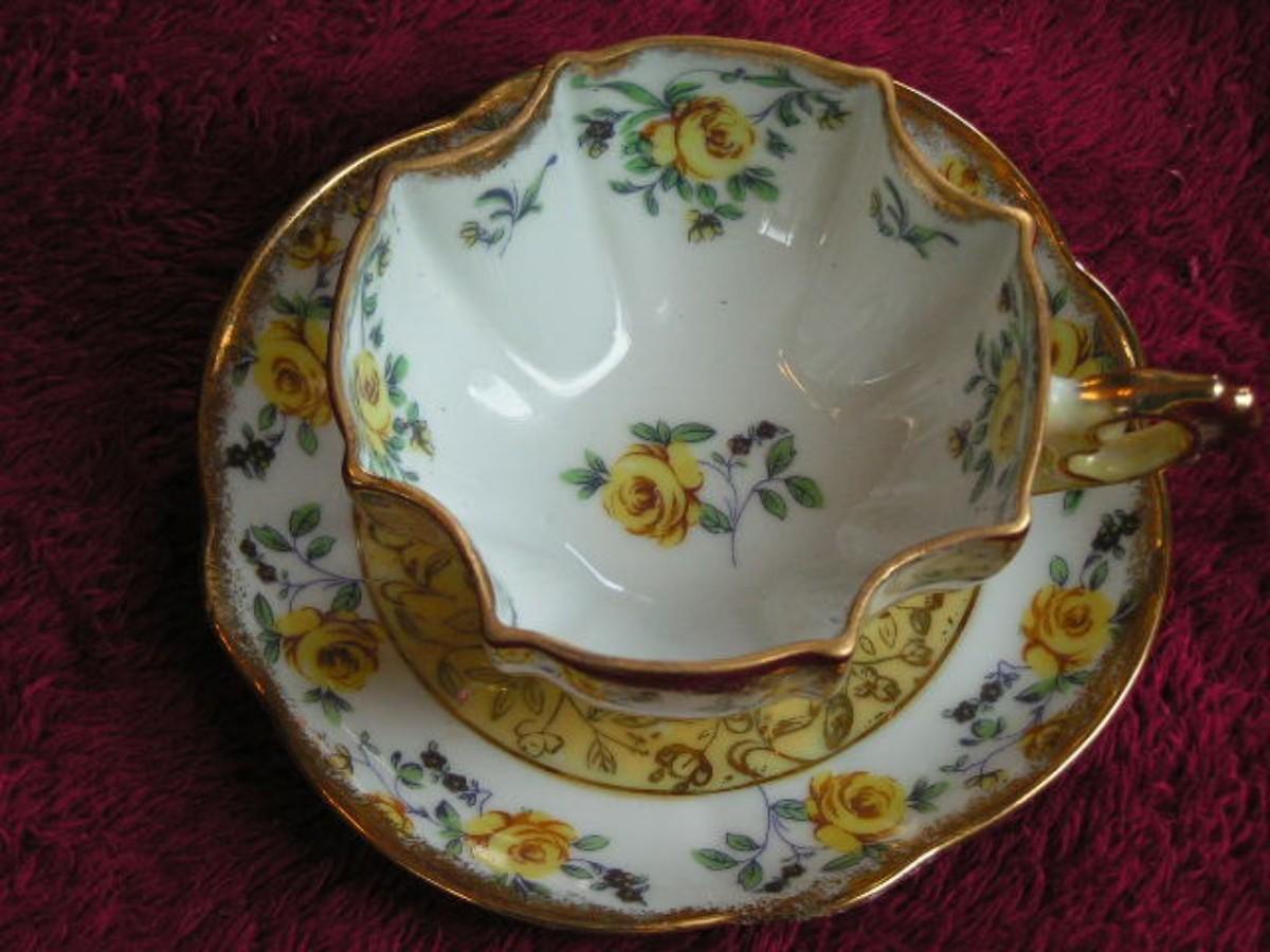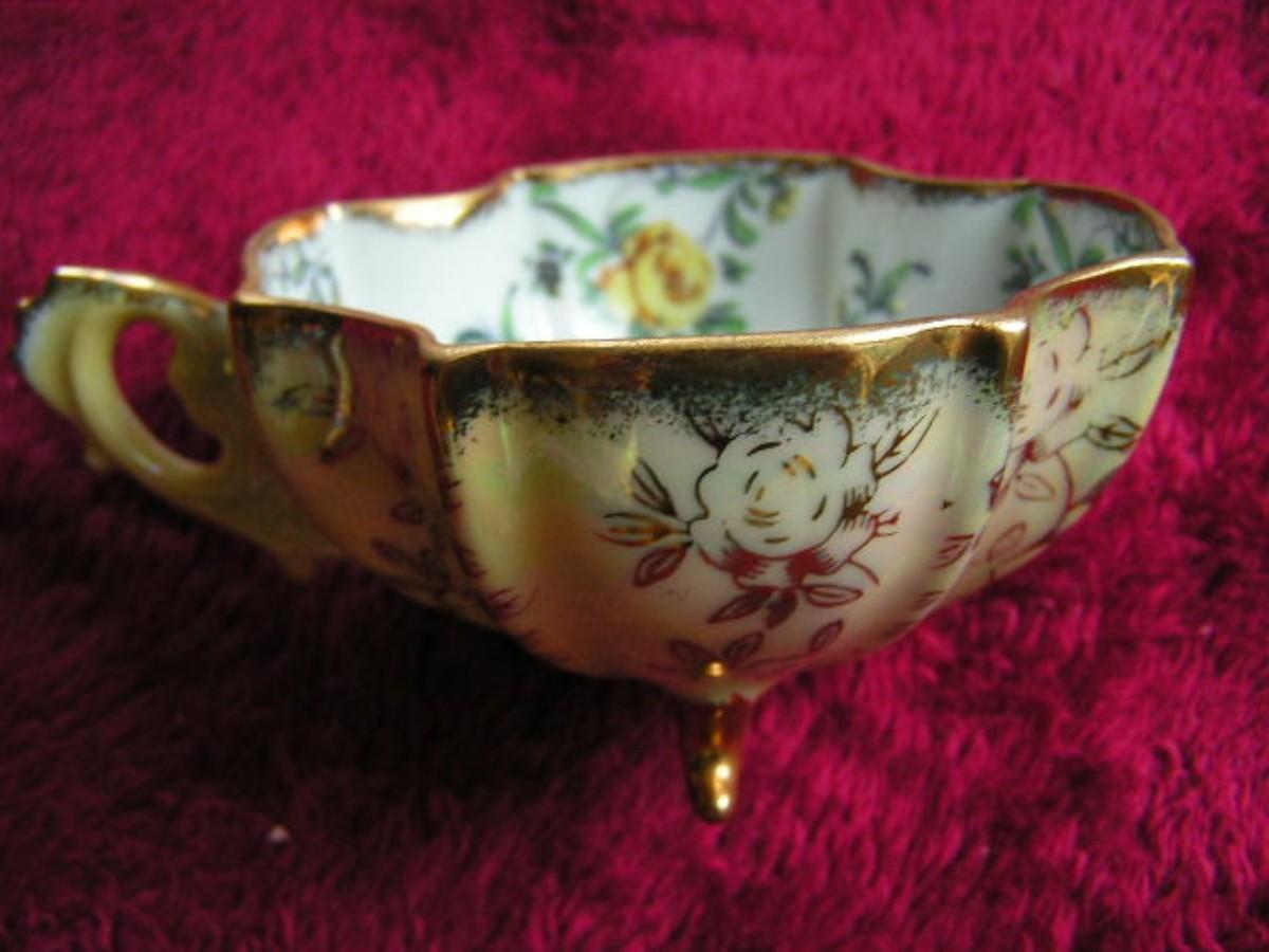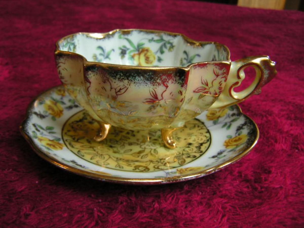 Vintage Napco of Japan Lusterware porcelain 3-footed teacup and saucer. Yellow roses, gold trim and iridescent opalescent finish. Beautiful!