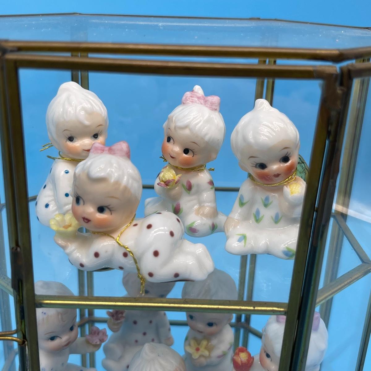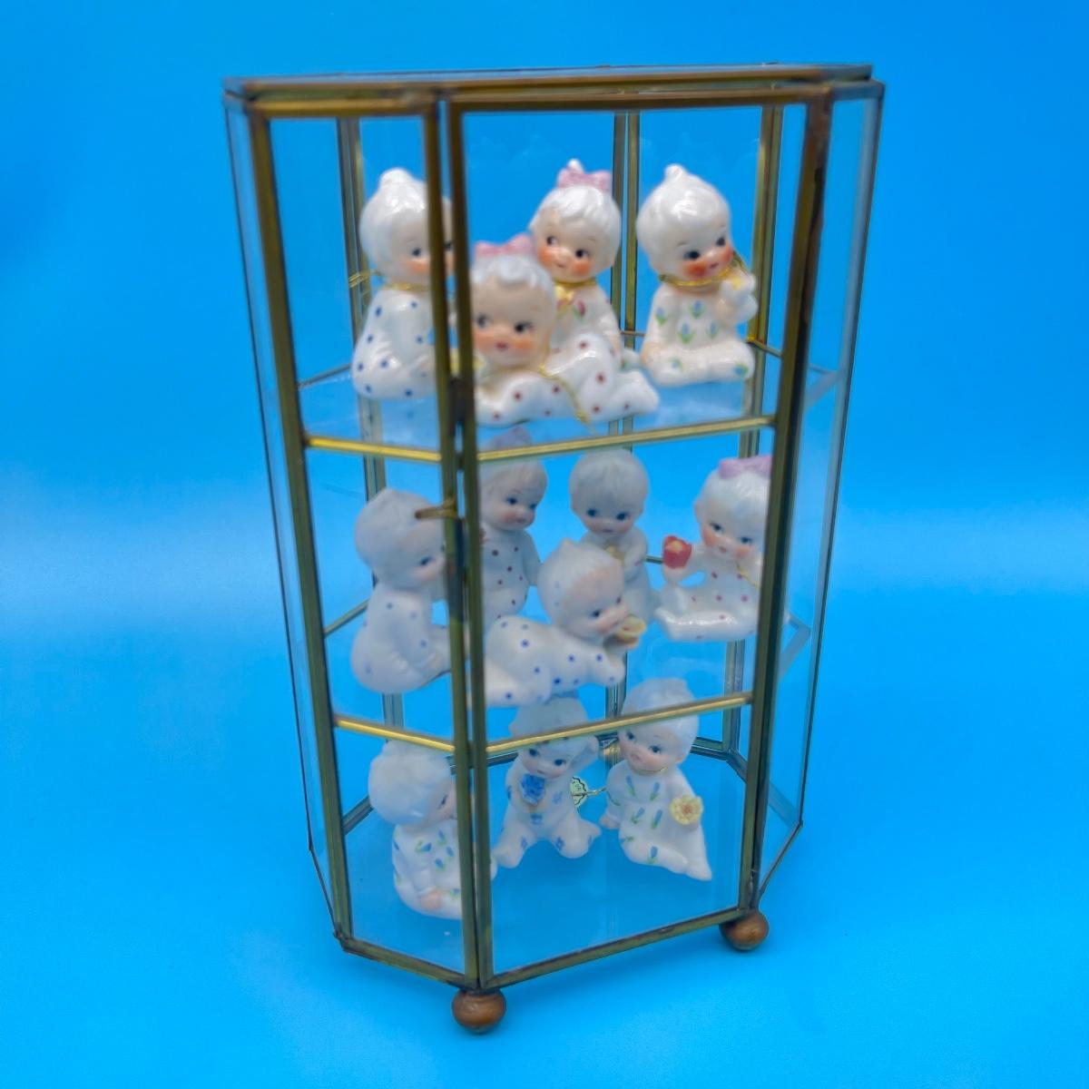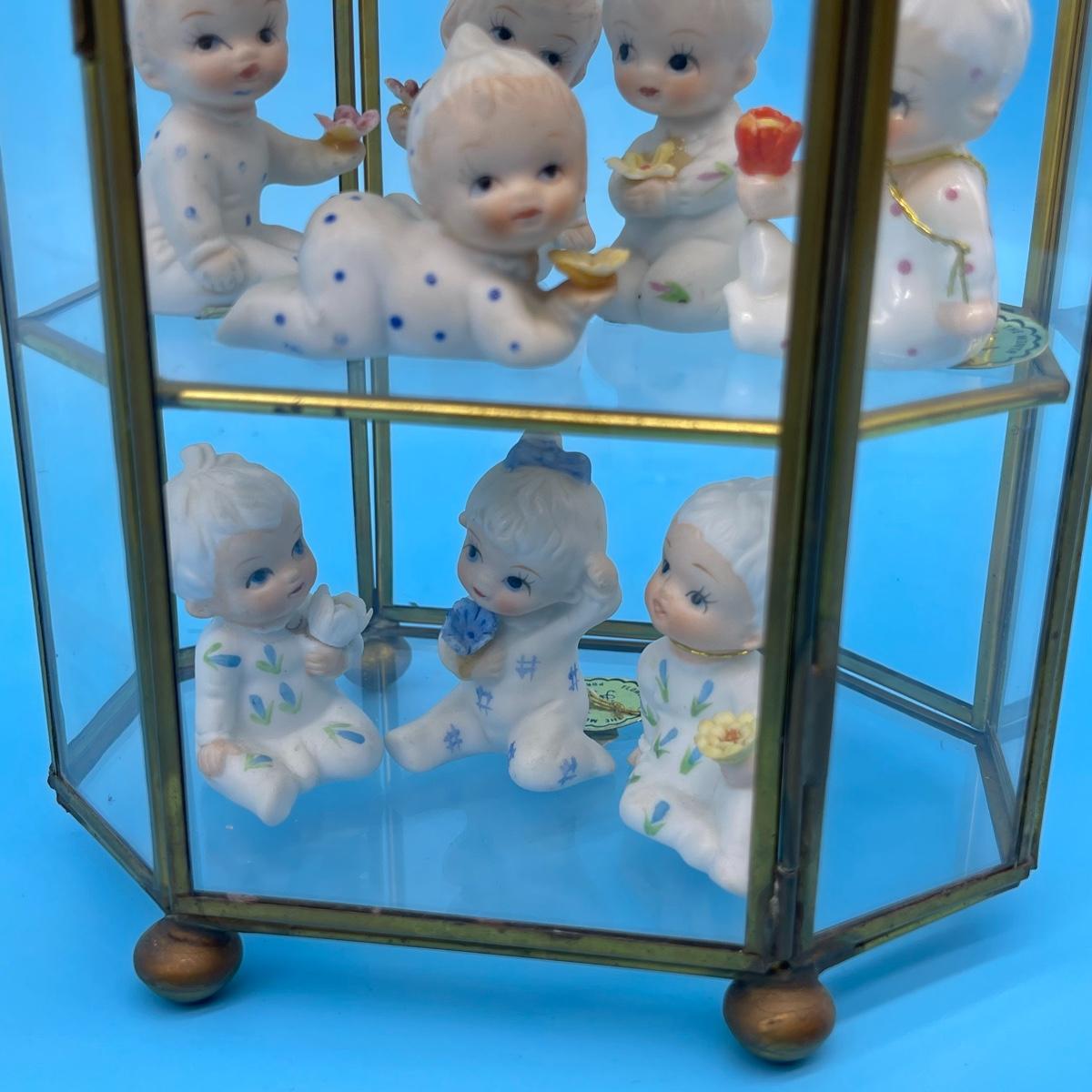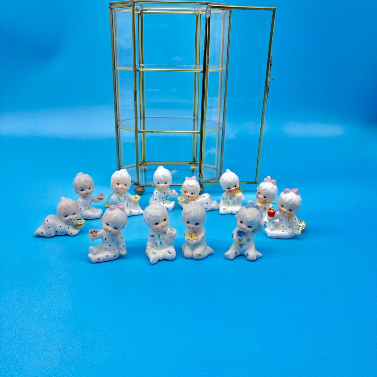 12 total flower girls. Not all pieces have labels identifying the month. Includes a brass and glass mini curio cabinet. 8-12”H x 5-1/2”W x 4”D