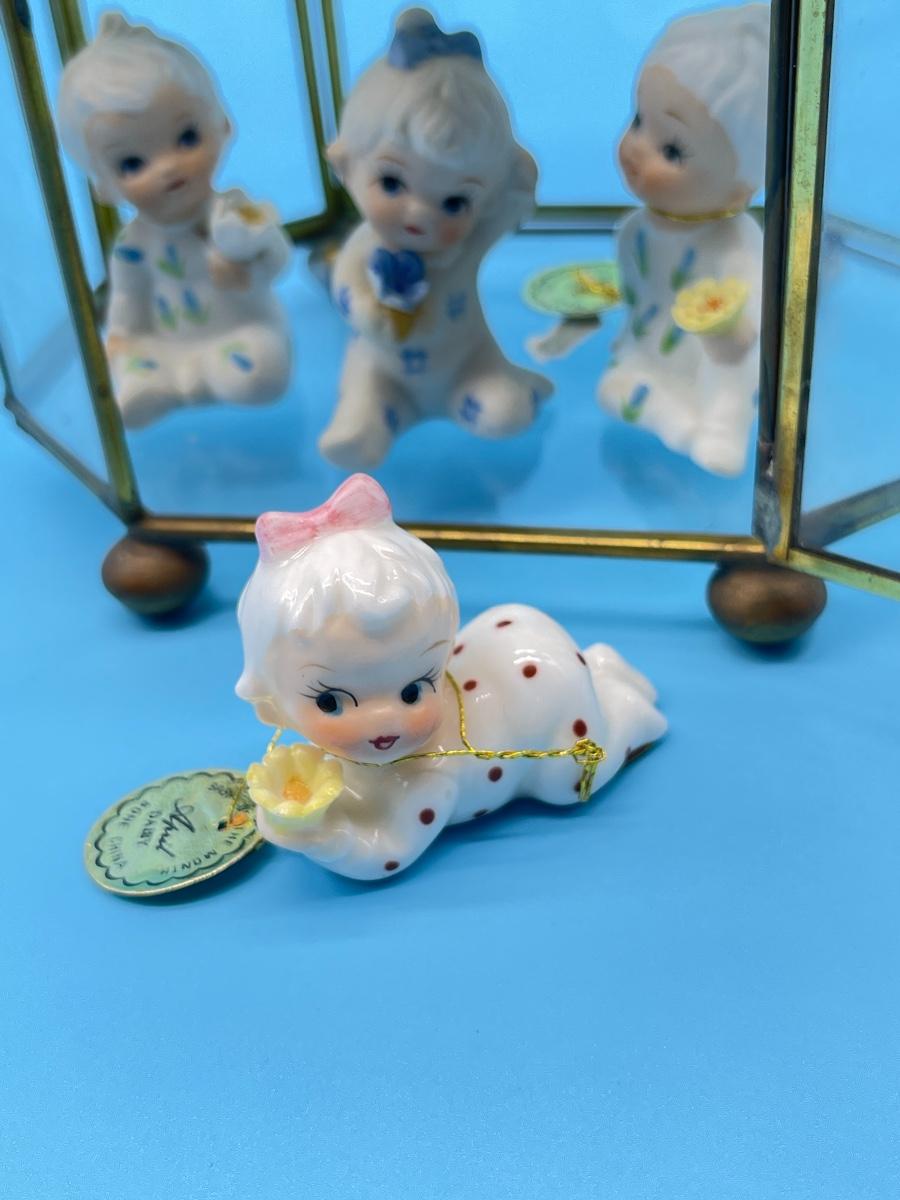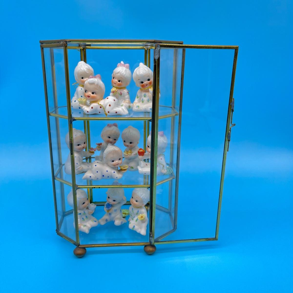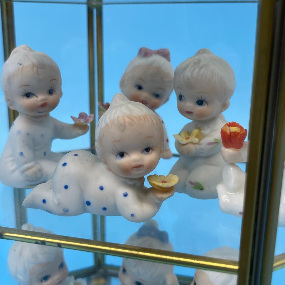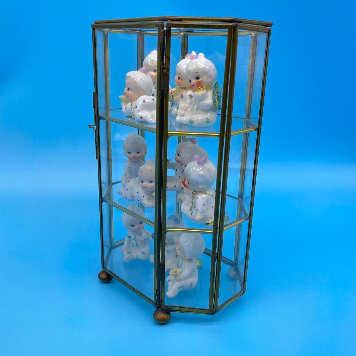12 total flower girls. Not all pieces have labels identifying the month. Includes a brass and glass mini curio cabinet. 8-12”H x 5-1/2”W x 4”D