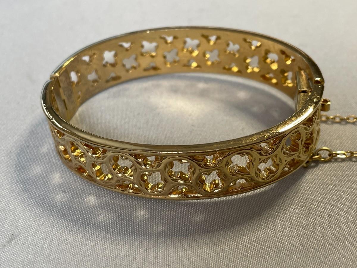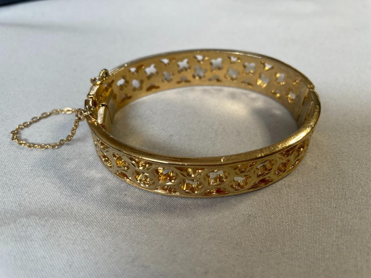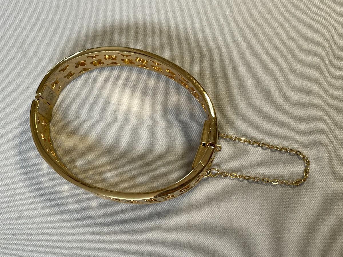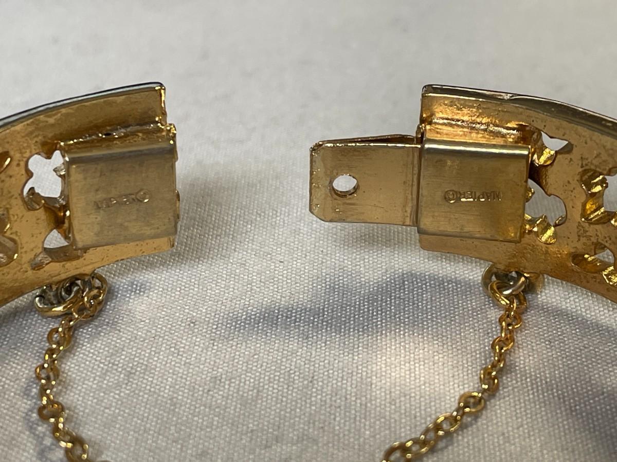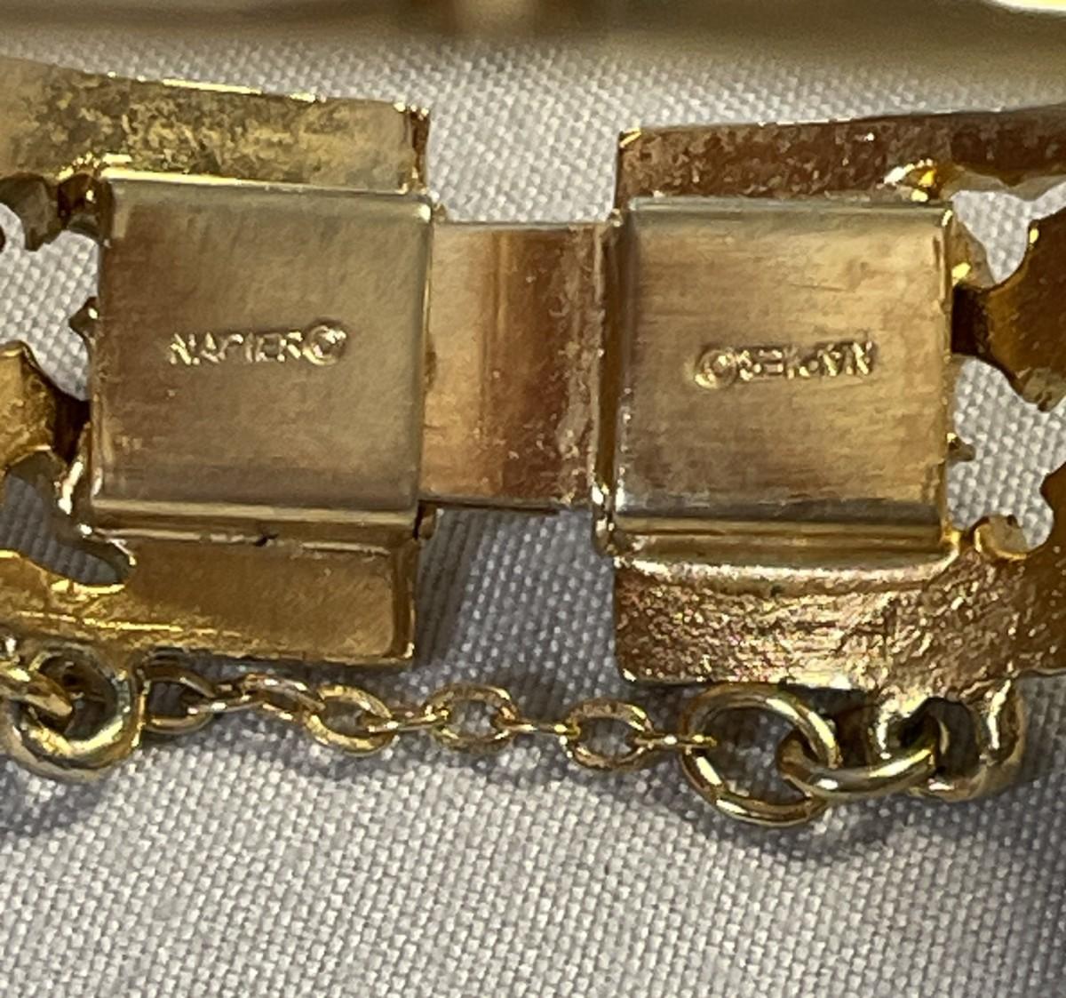 This bracelet is in excellent condition and marked Napier on both ends. It has a gold tone safety chain and there doesn't appear to be any signs of wear of use on this pretty piece. It is about 2.5 inches in diameter at the longest. I have a large wrist and it fit me, but it was pretty snug.