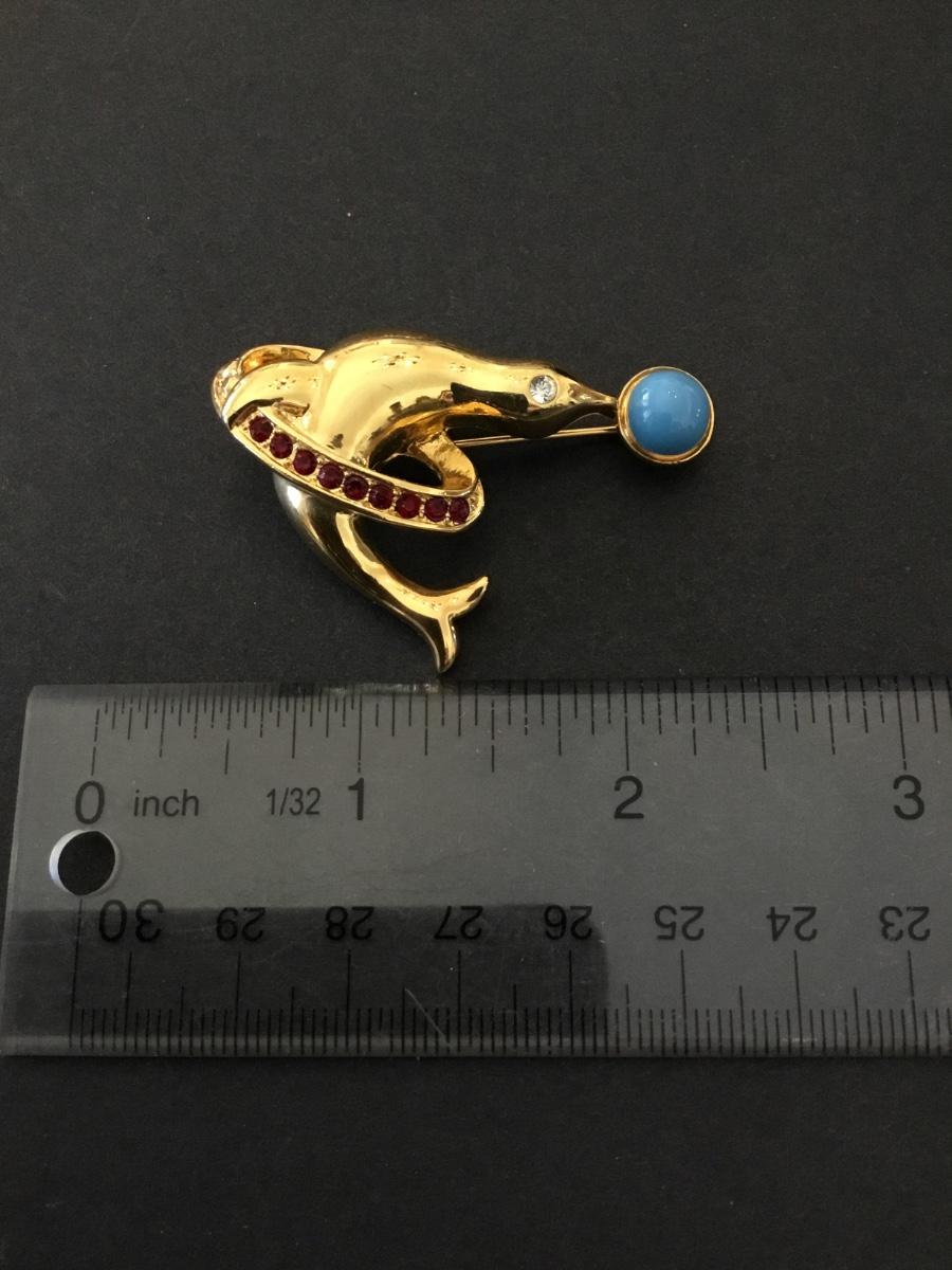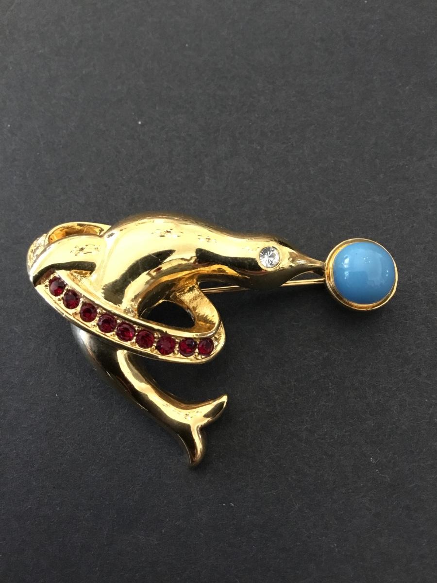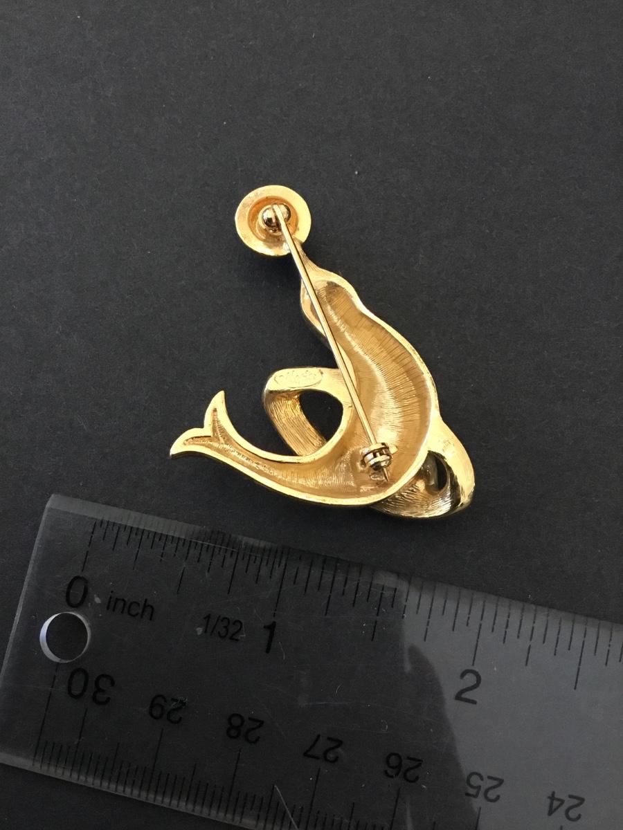 Vintage, Napier, gold, dolphin, rhinestone, designer, runaway brooch