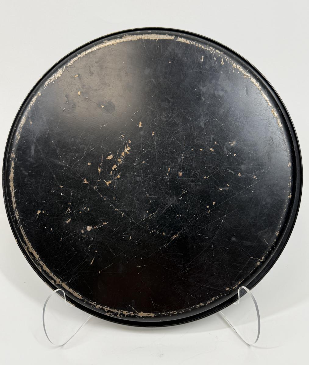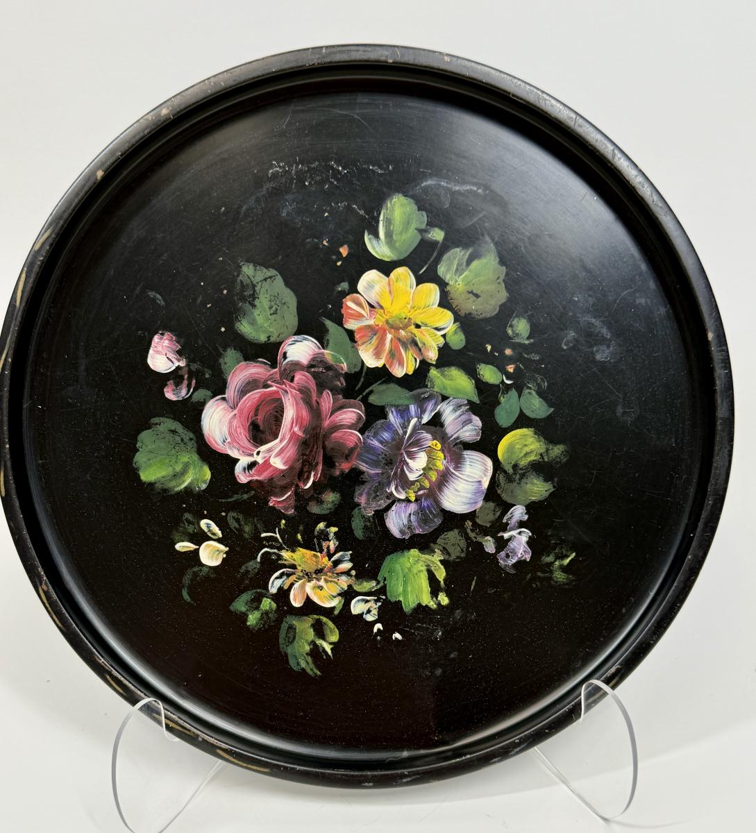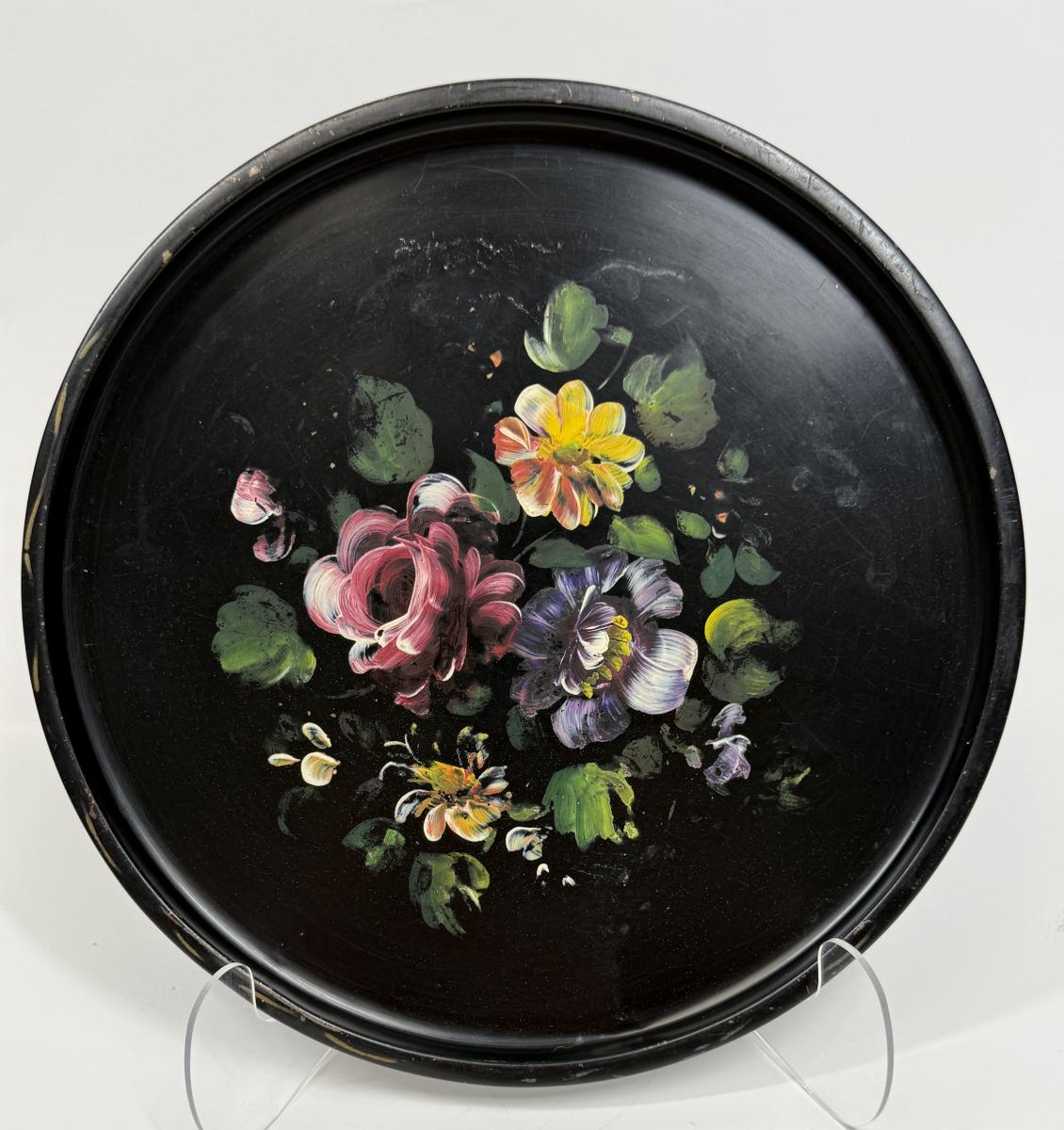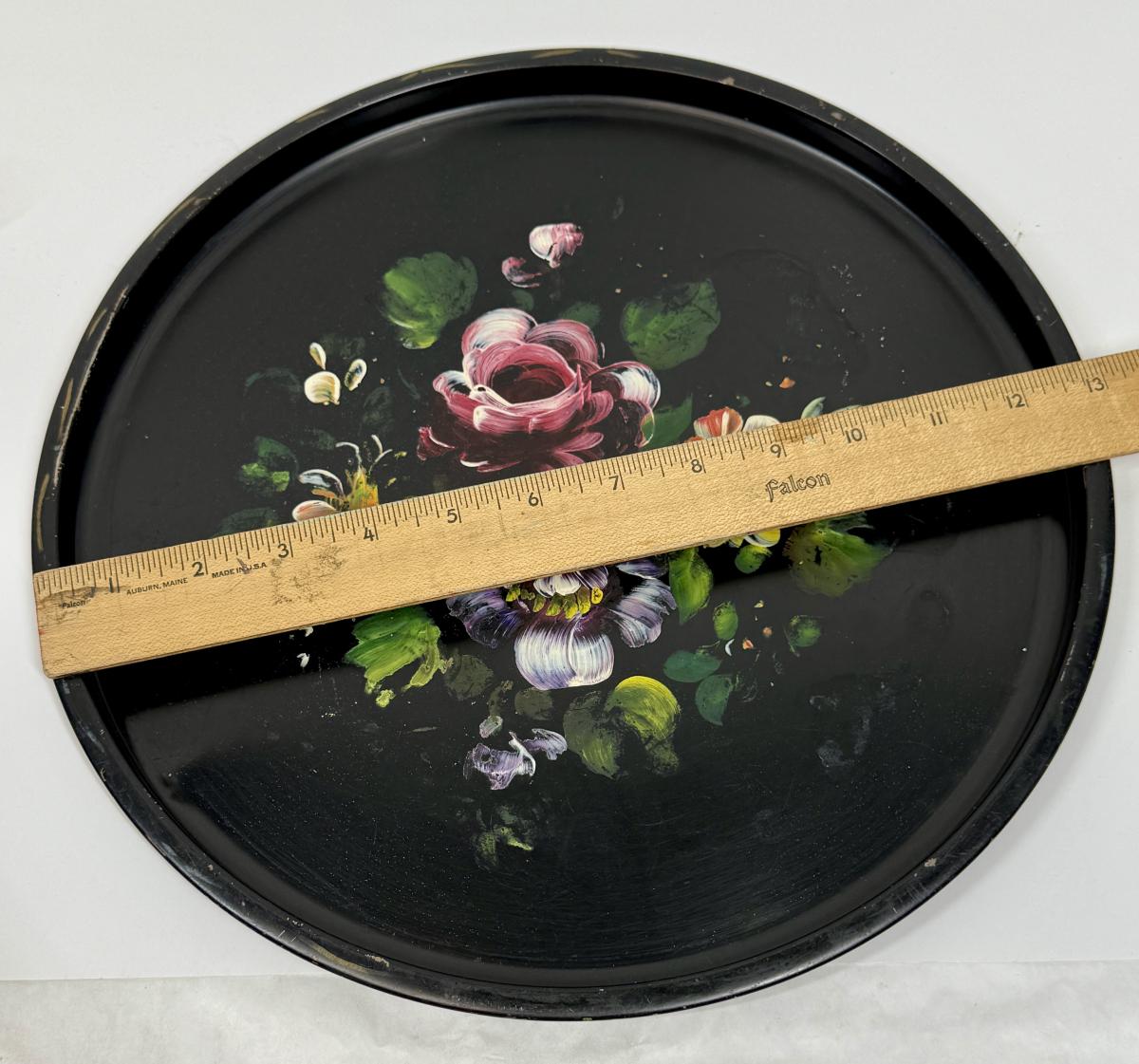 Vintage Nashco Toleware Hand Painted Black Round Metal Tray 12.75" Round Floral Decorative Tray
