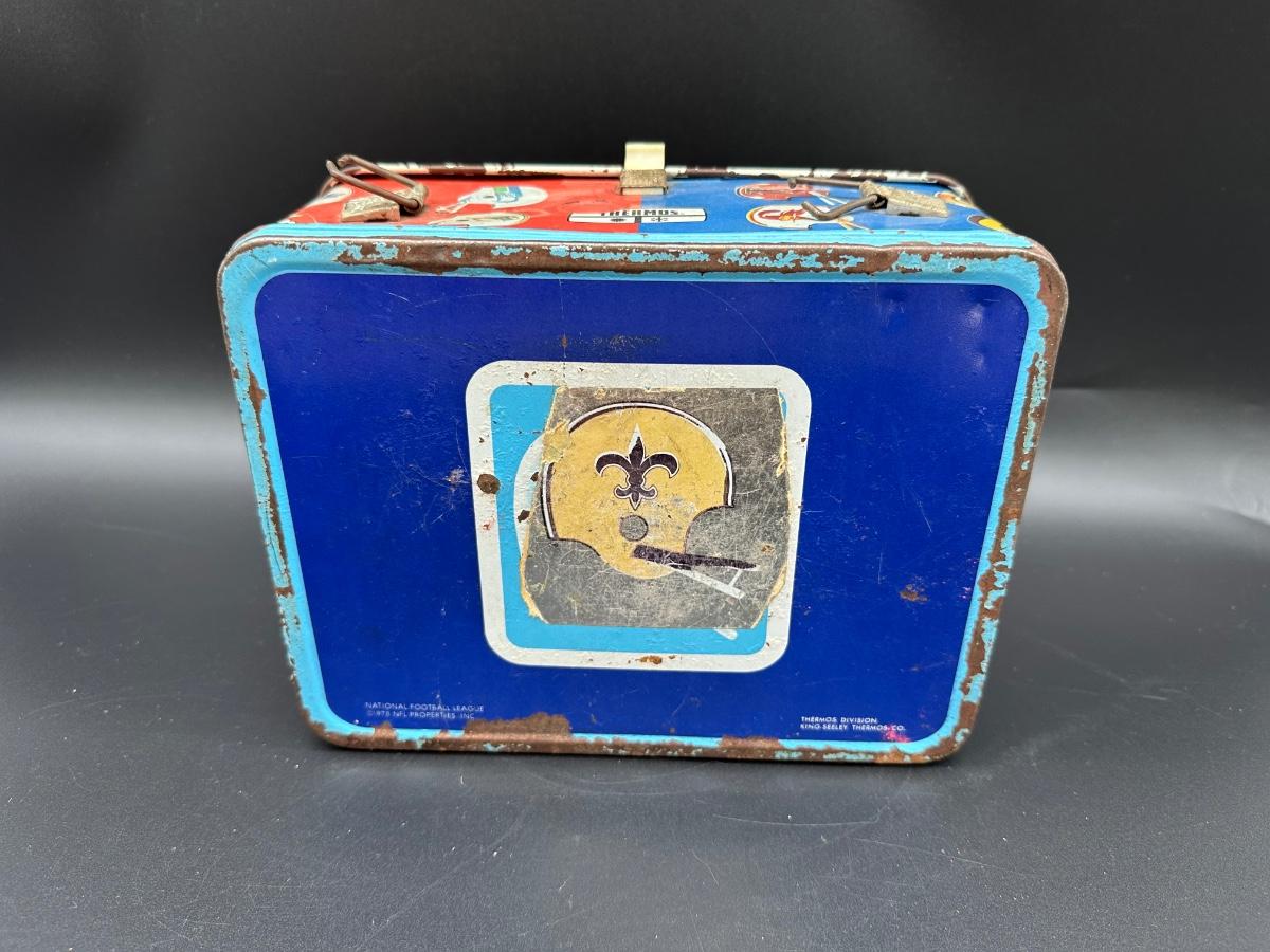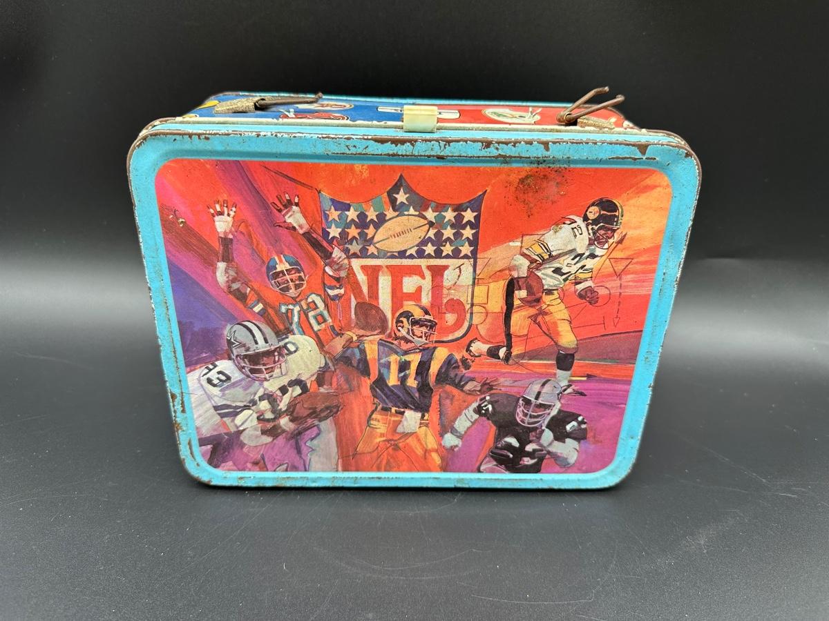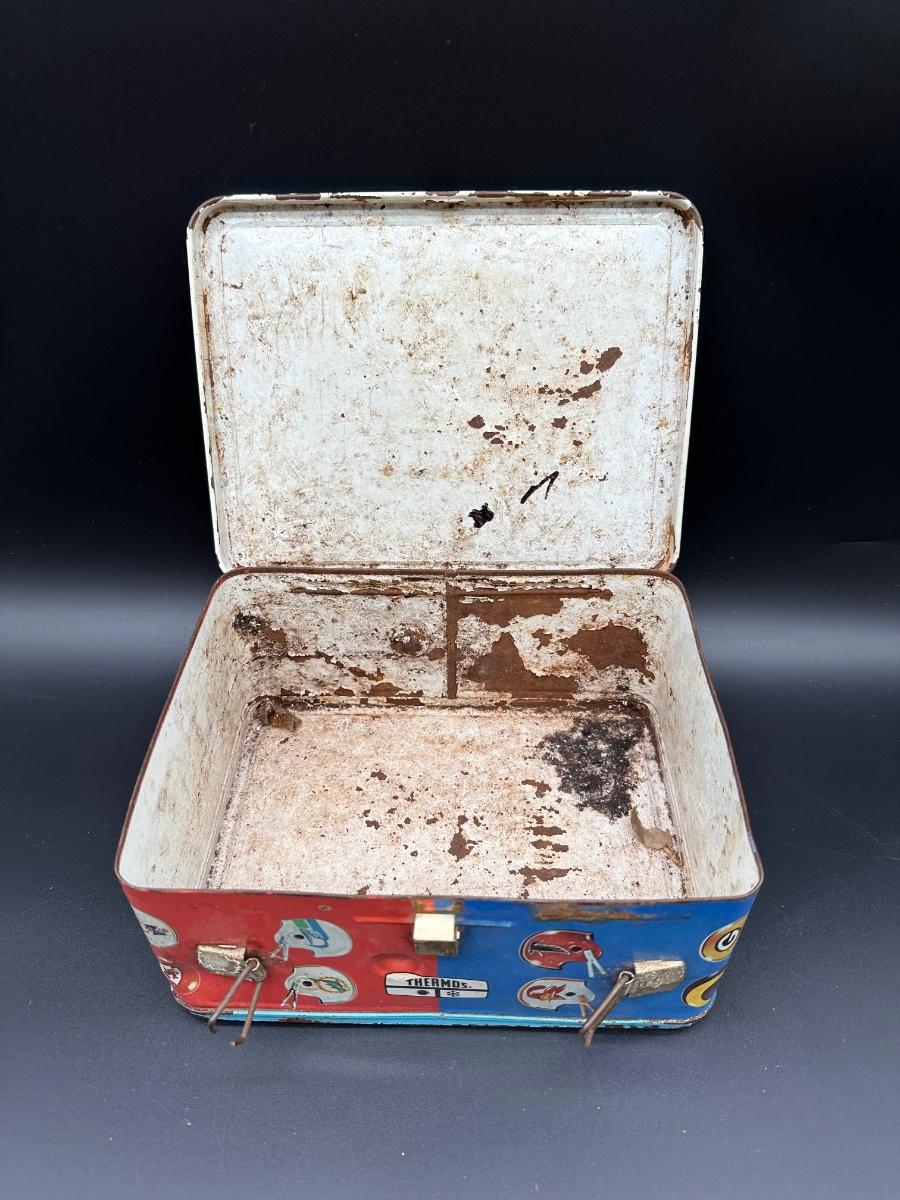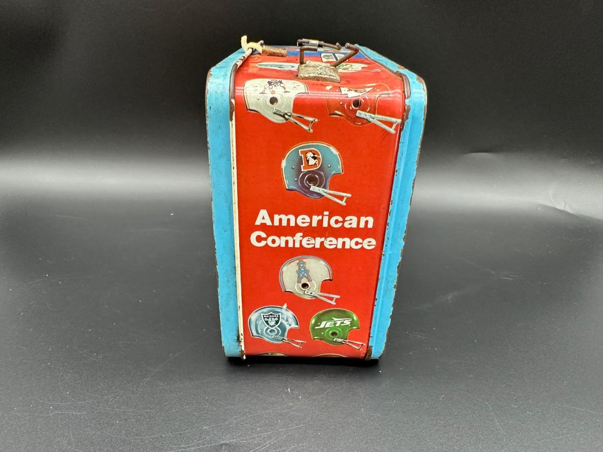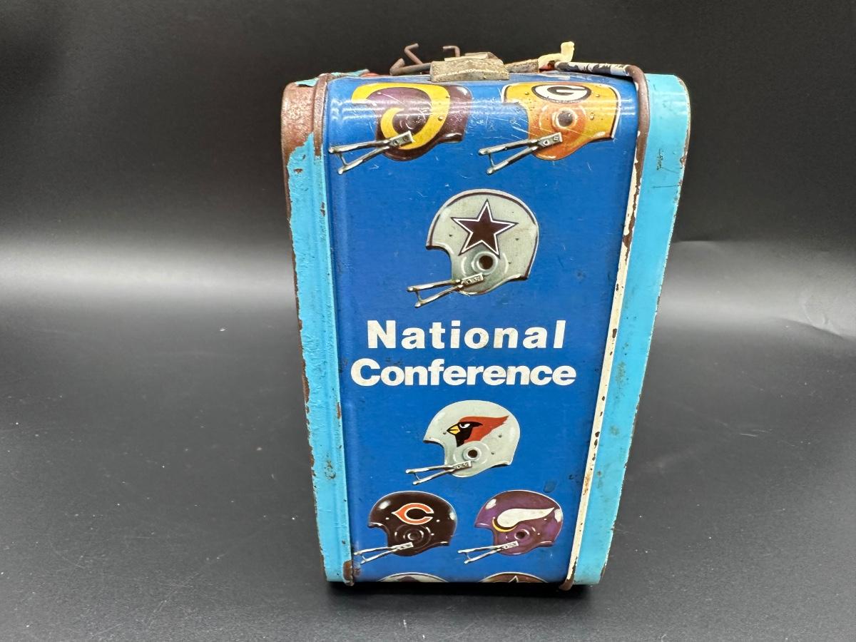 Authentic vintage NFL metal lunchbox, featuring colorful helmet graphics from both the American Conference and National Conference. Produced by Thermos, this classic lunchbox dates to the 1970s era, when conference branding was still prominently used.
