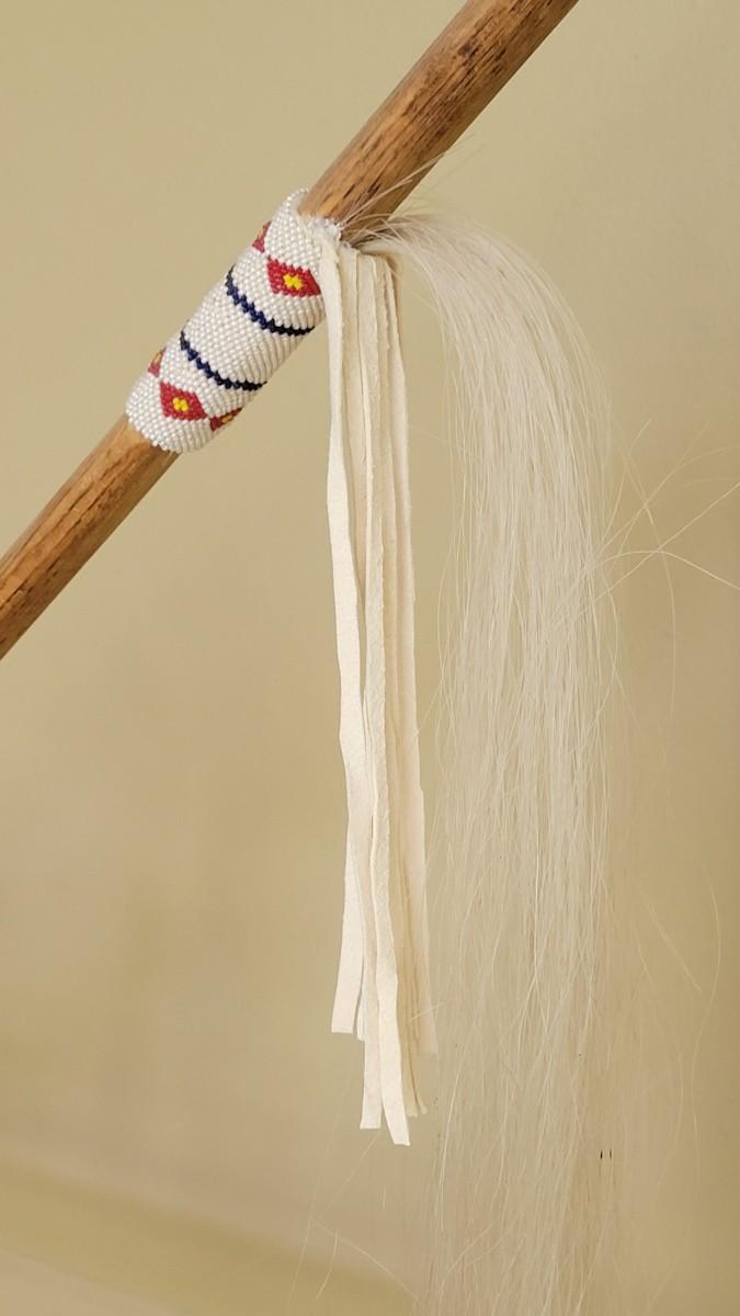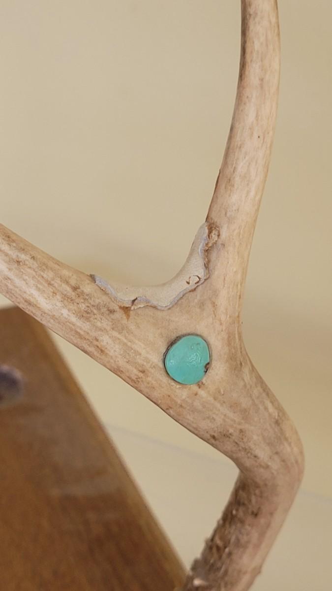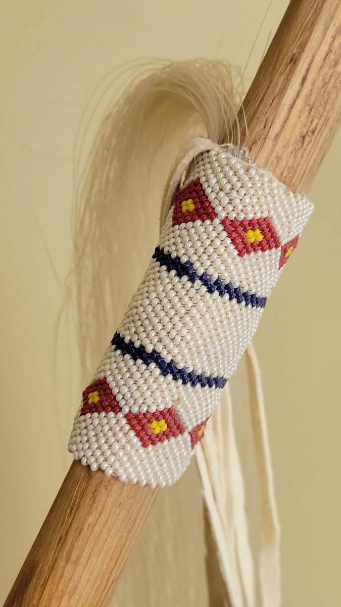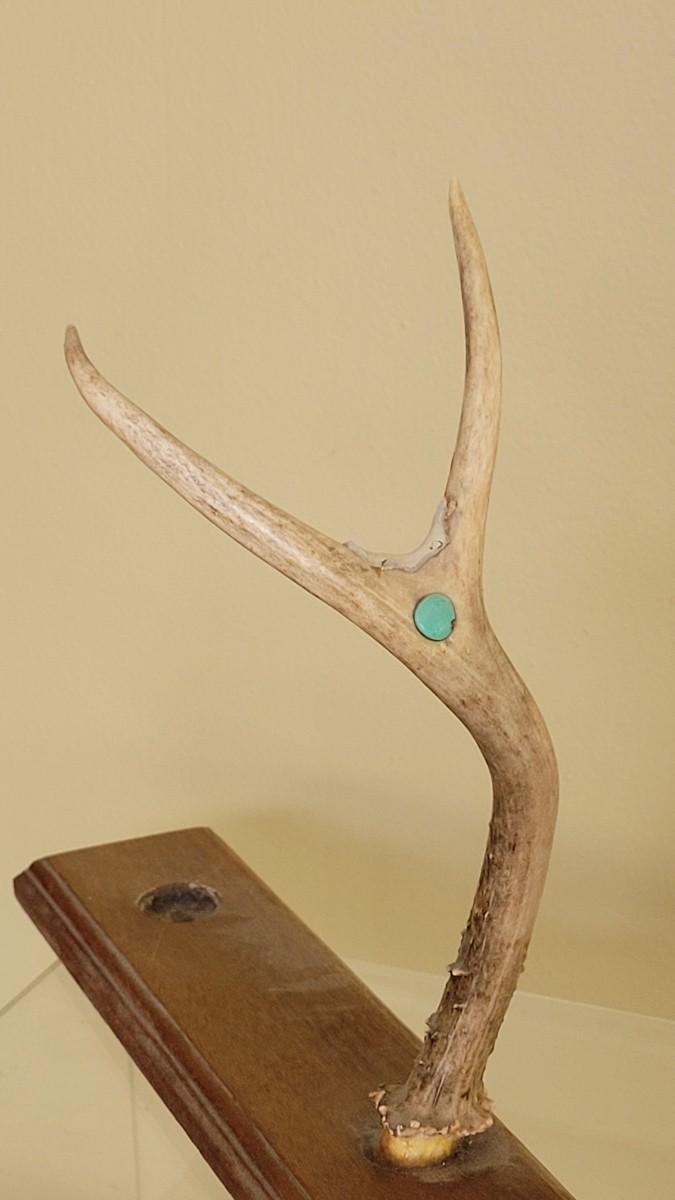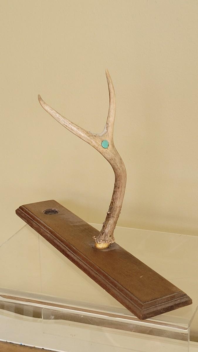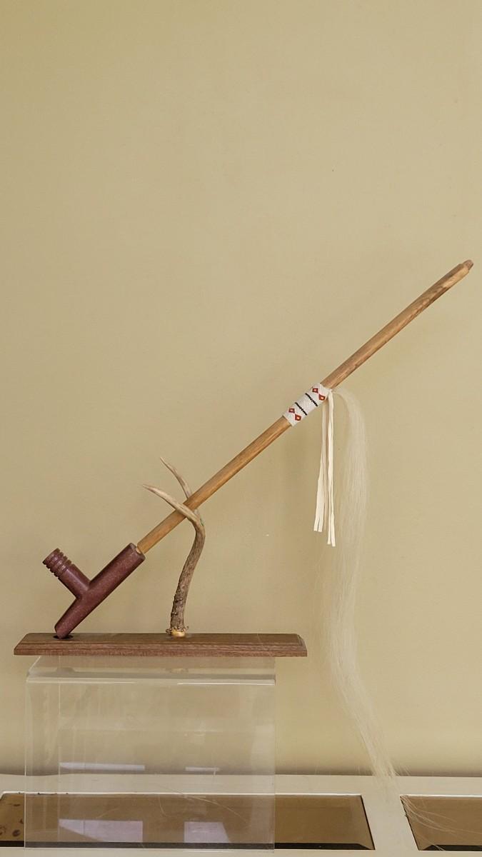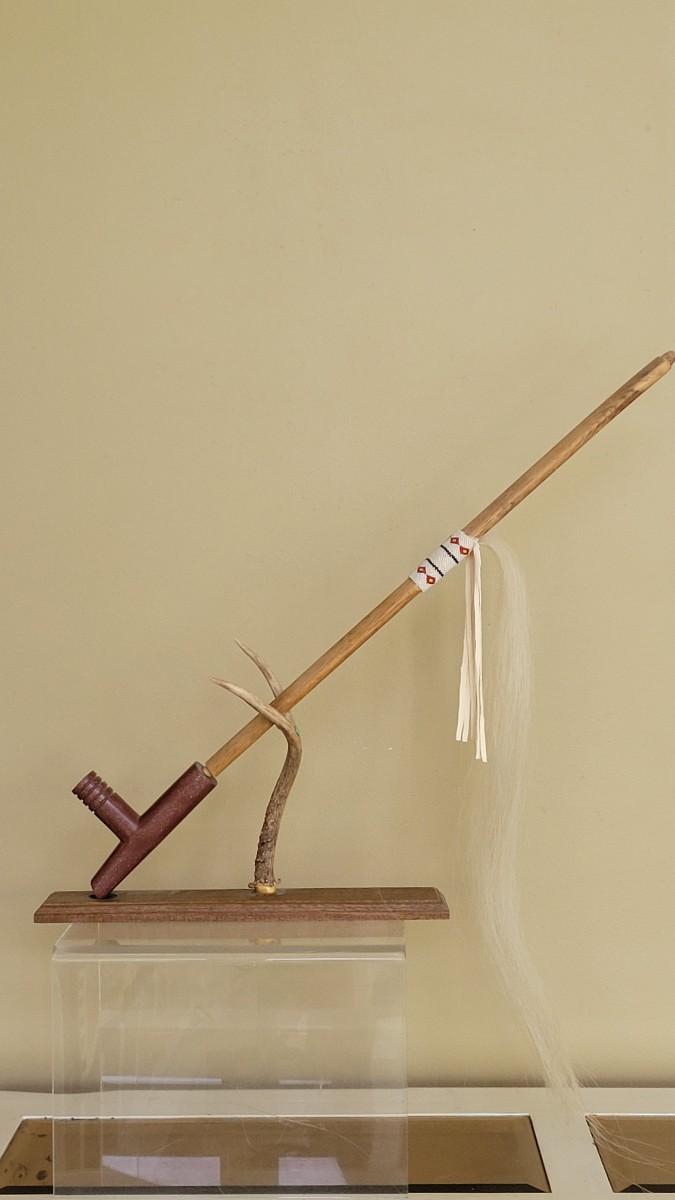Vintage Native American Four Winds Pipe with Beaded Band and Horsehair Tassel Signed R.S. accompanied by Inset Turquoise Antler Pipe Stand