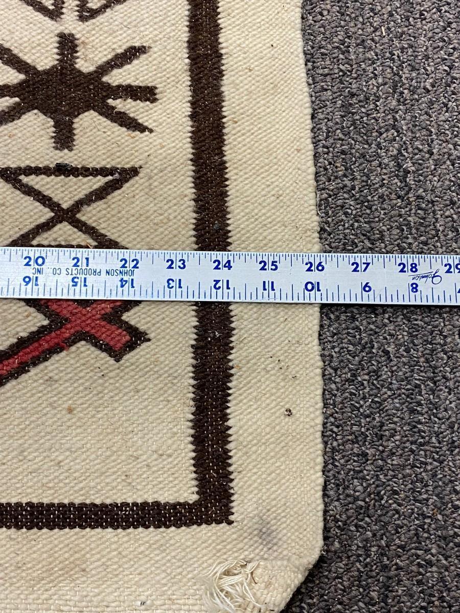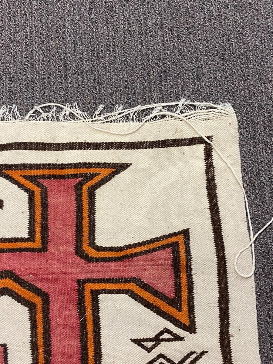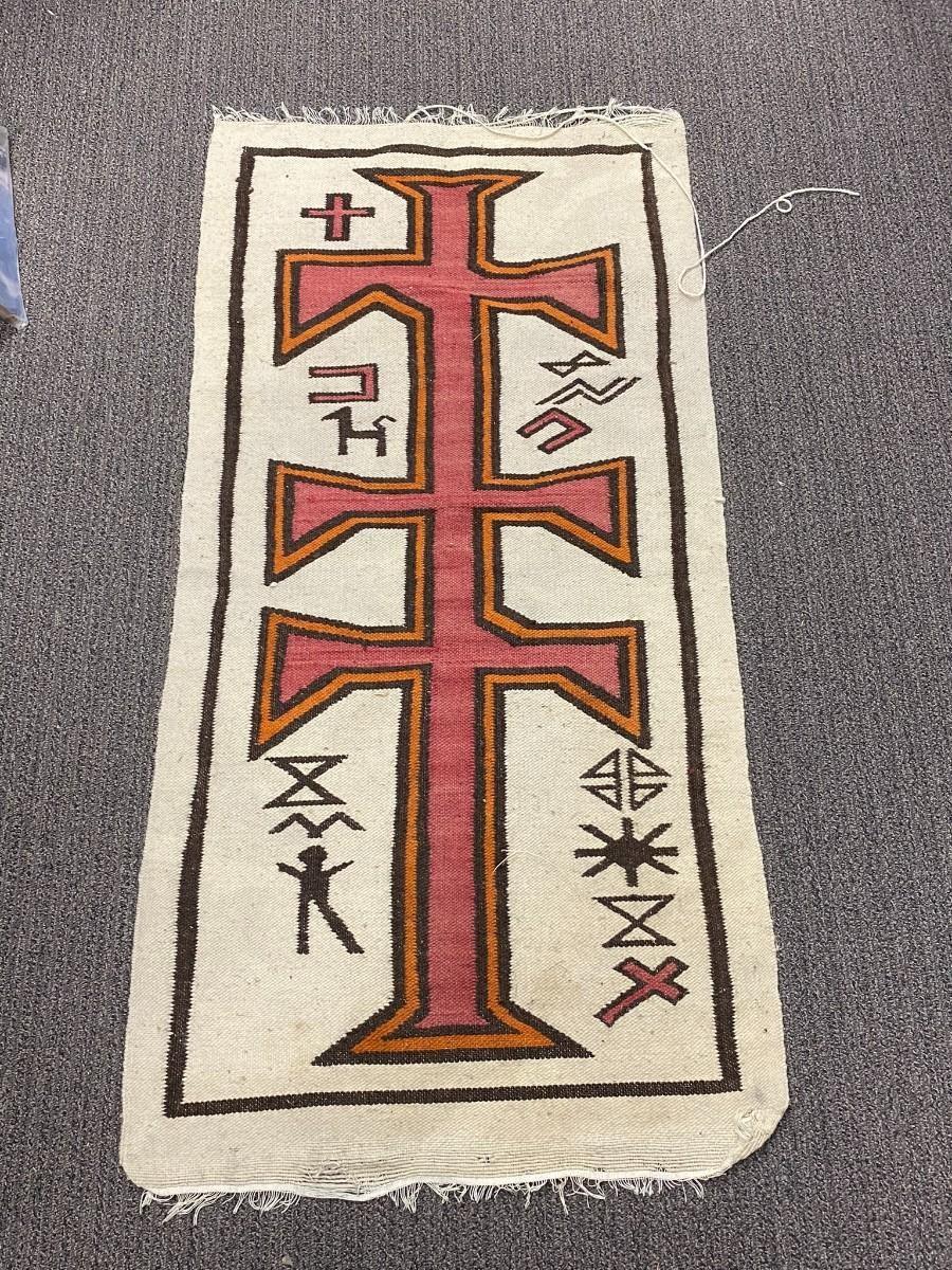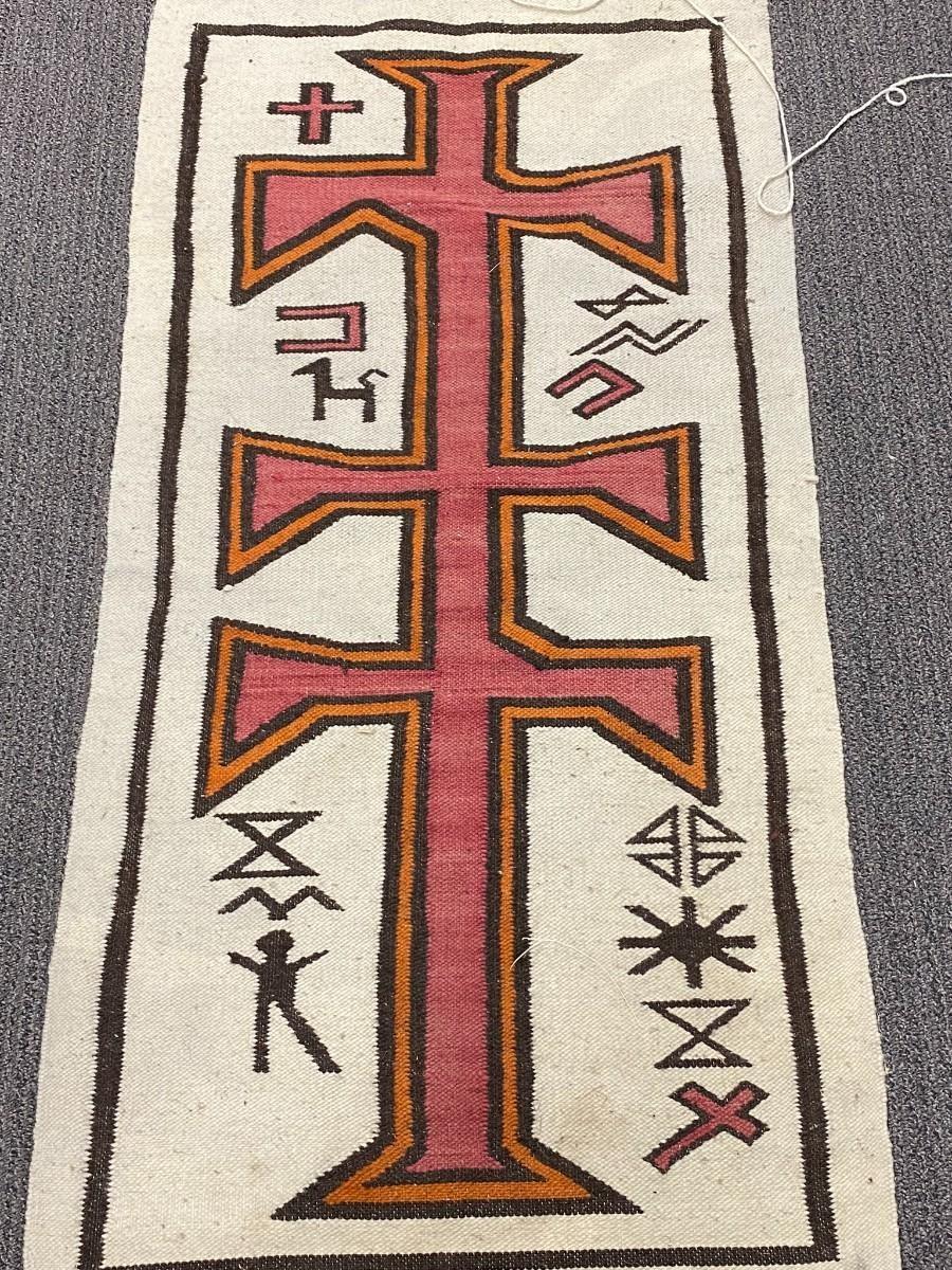 Vintage Native American wall hanging. Woven design has hieroglyphs woven into it, have not found all the symbols looking online. There is damage at ends, it is coming unraveled. Light discolor. Great for display and wall hanging. About 4'x26".