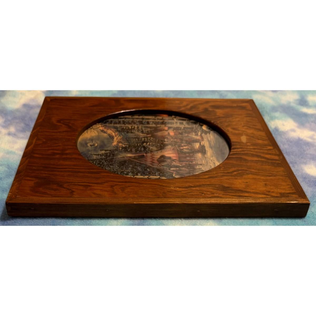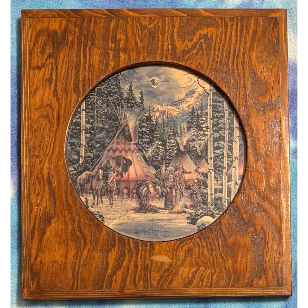 Vintage Native American Village Print Wood & Glass Frame Horses Teepee Tipi