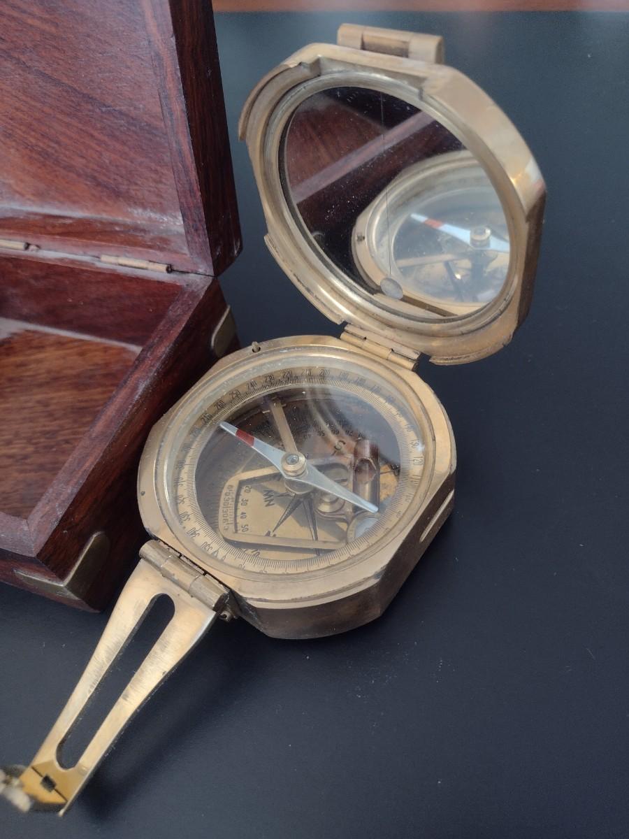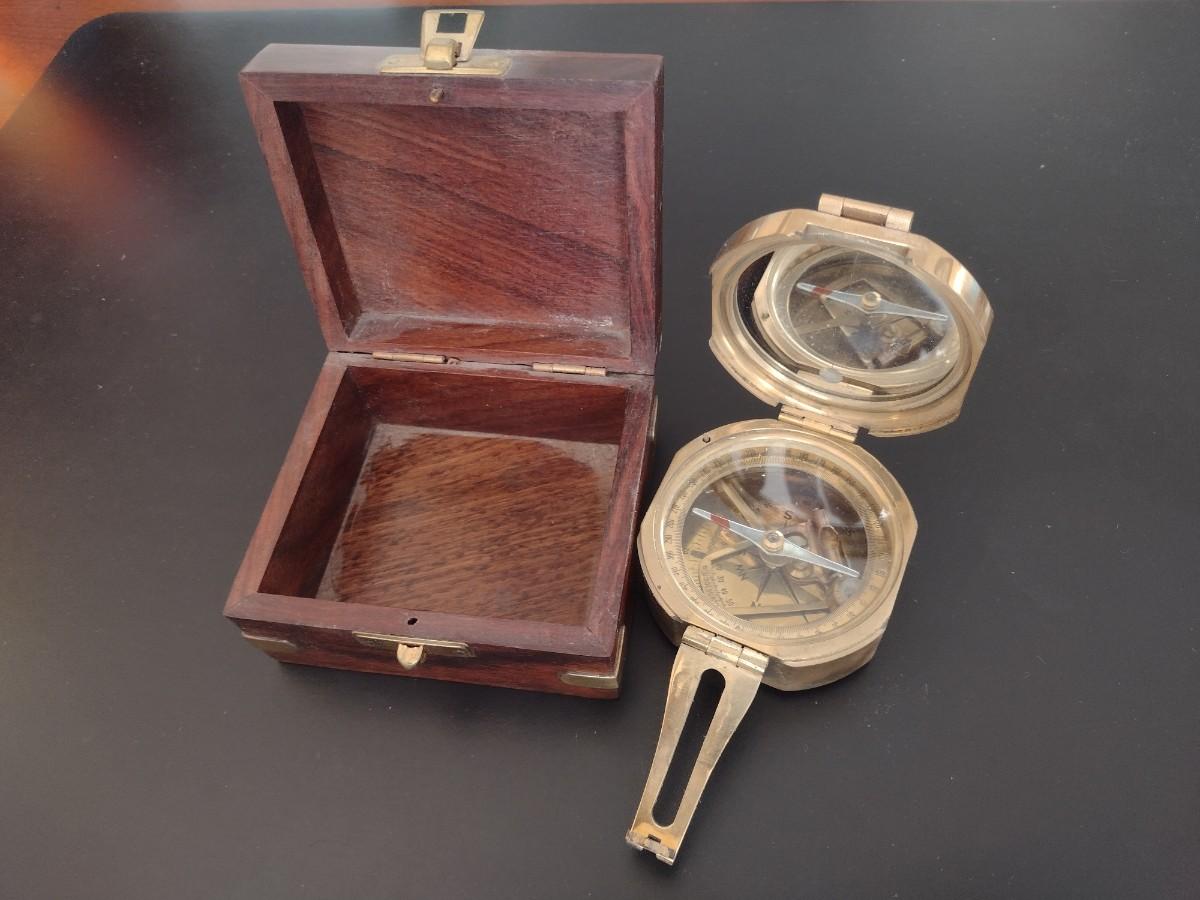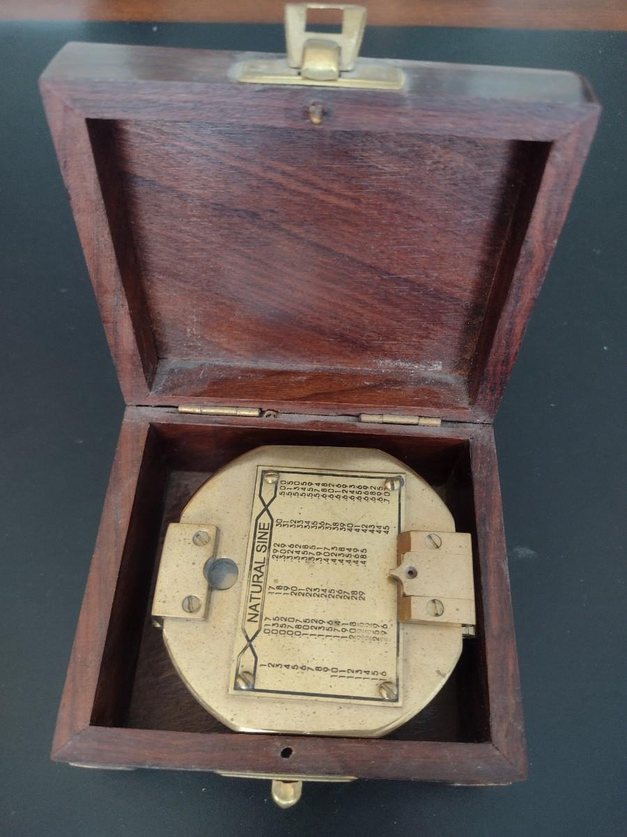 Vintage Natural Sine Brass Case Compass with Wood Storage Box