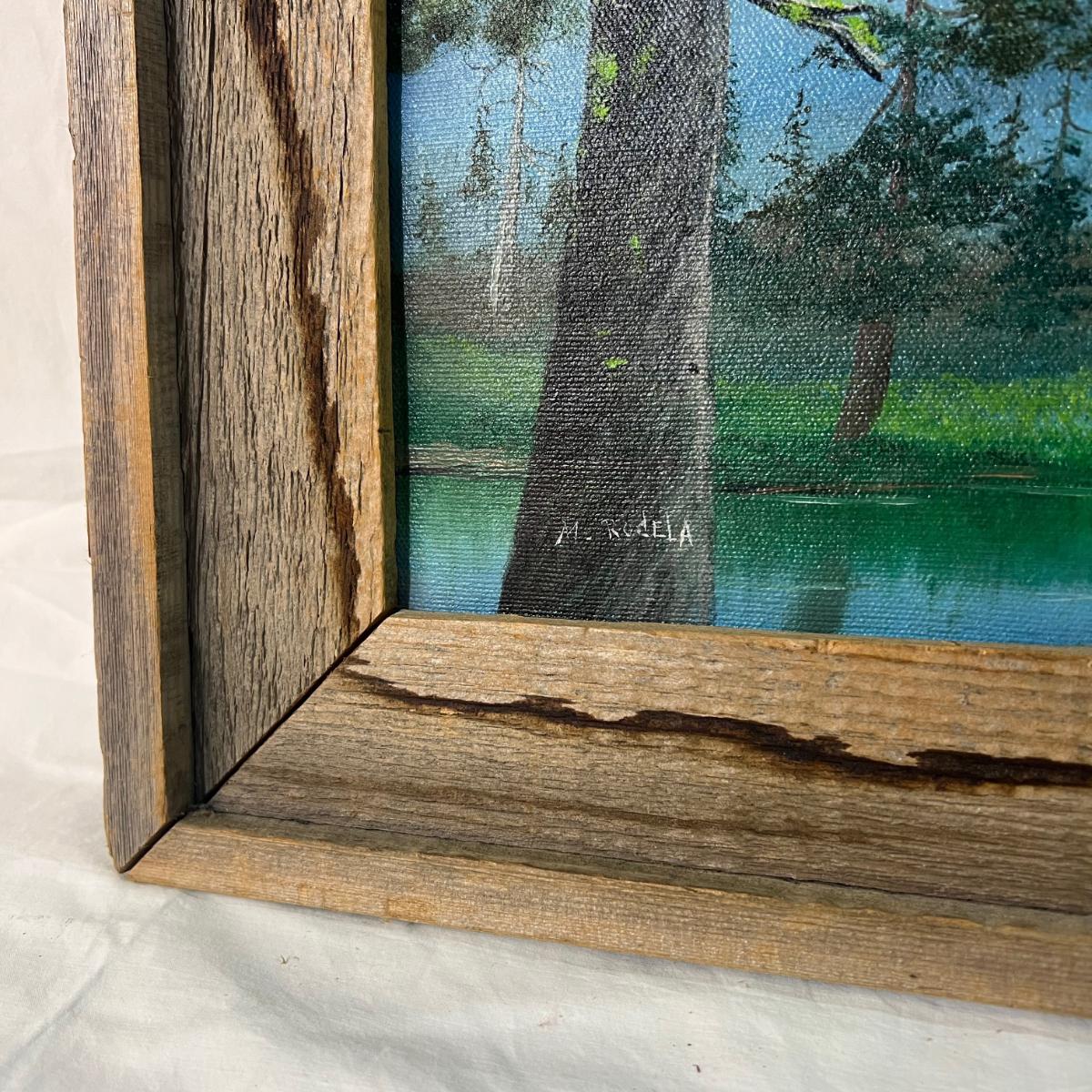 Vintage Natural Wood Frame for Painted Art of Mossy Tree Lake by signed artist M. Rodela. Some water marking on frame. Dimensions being 24 1/4" x 20 1/4"