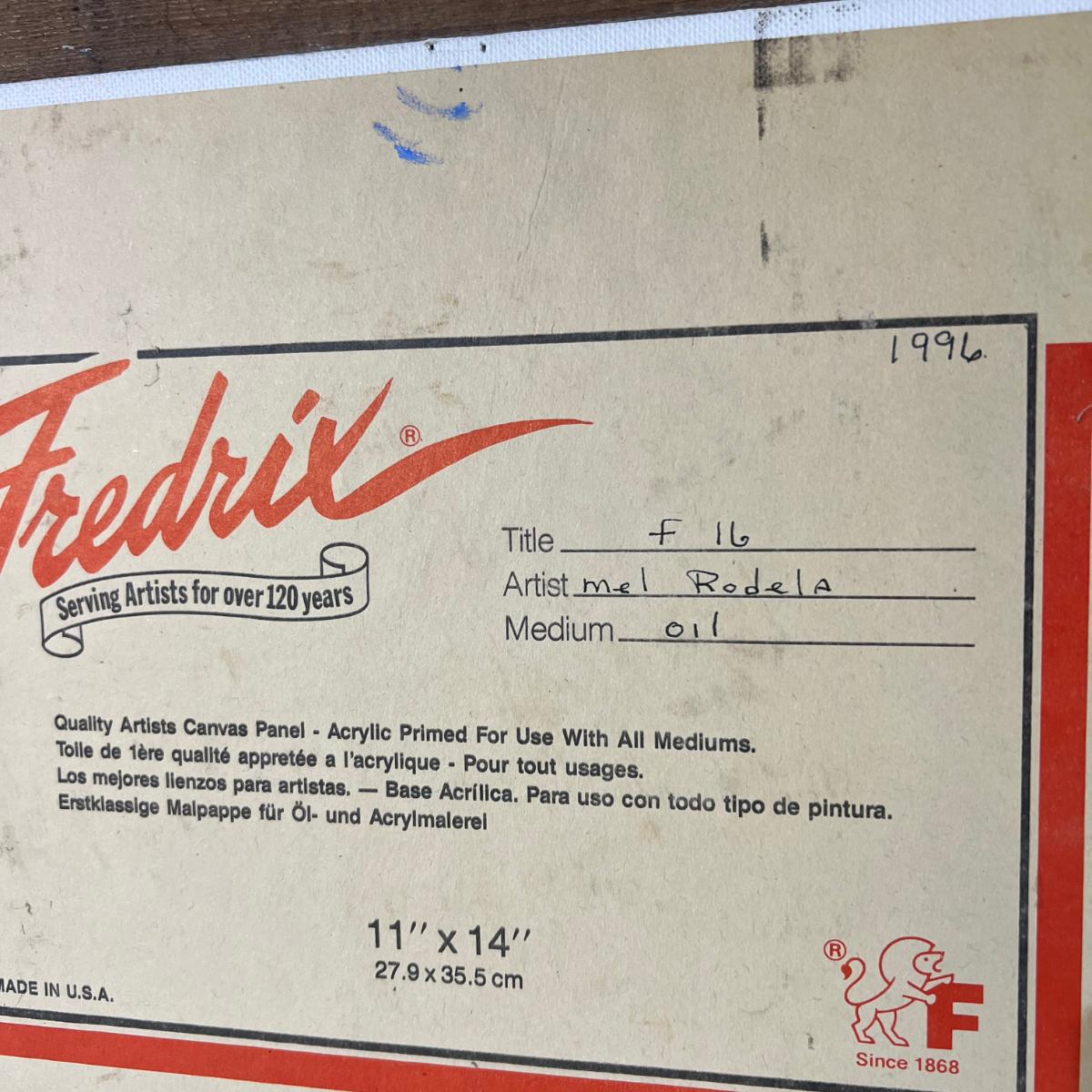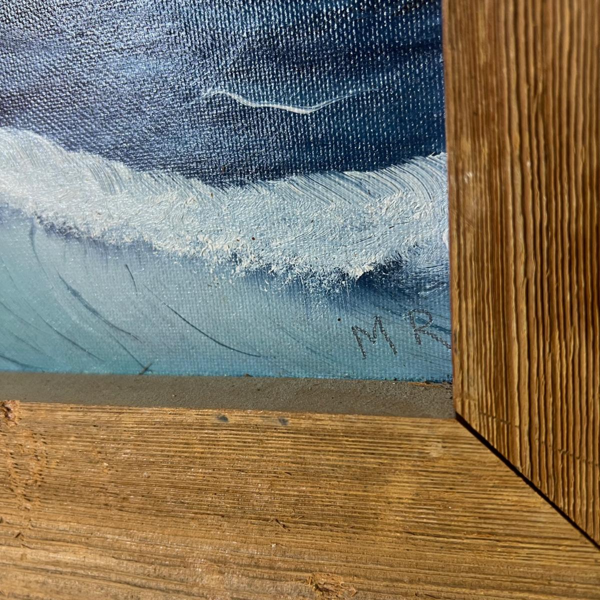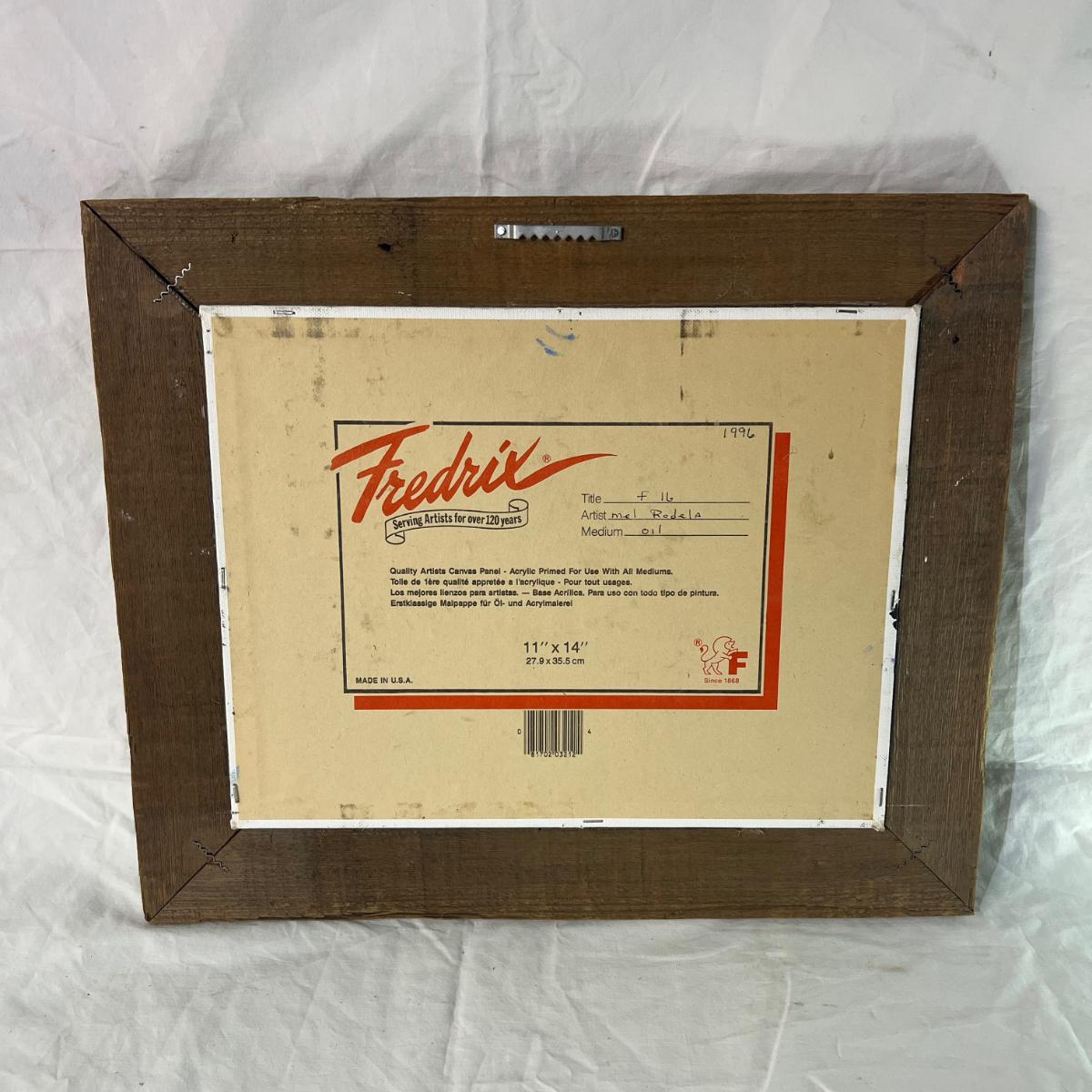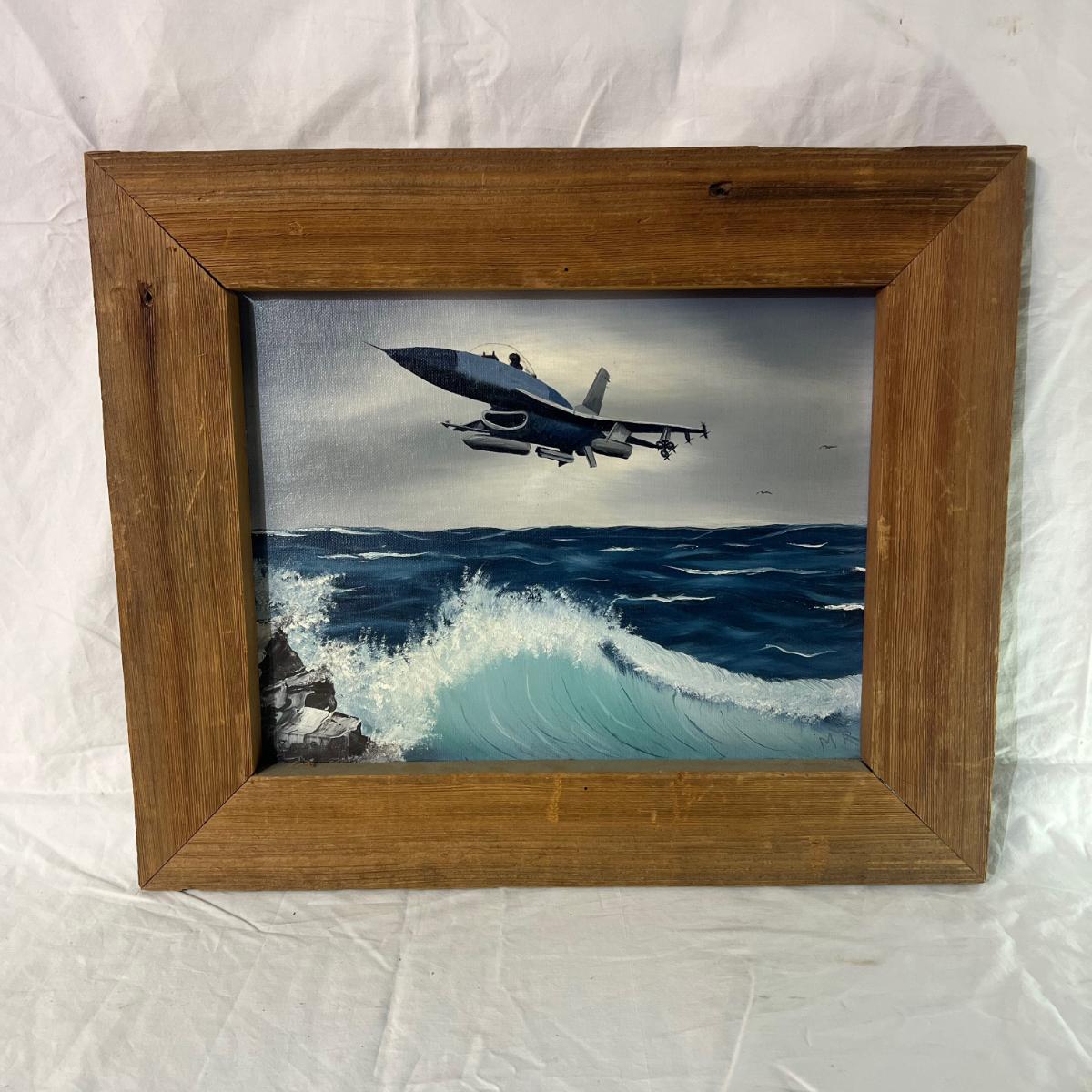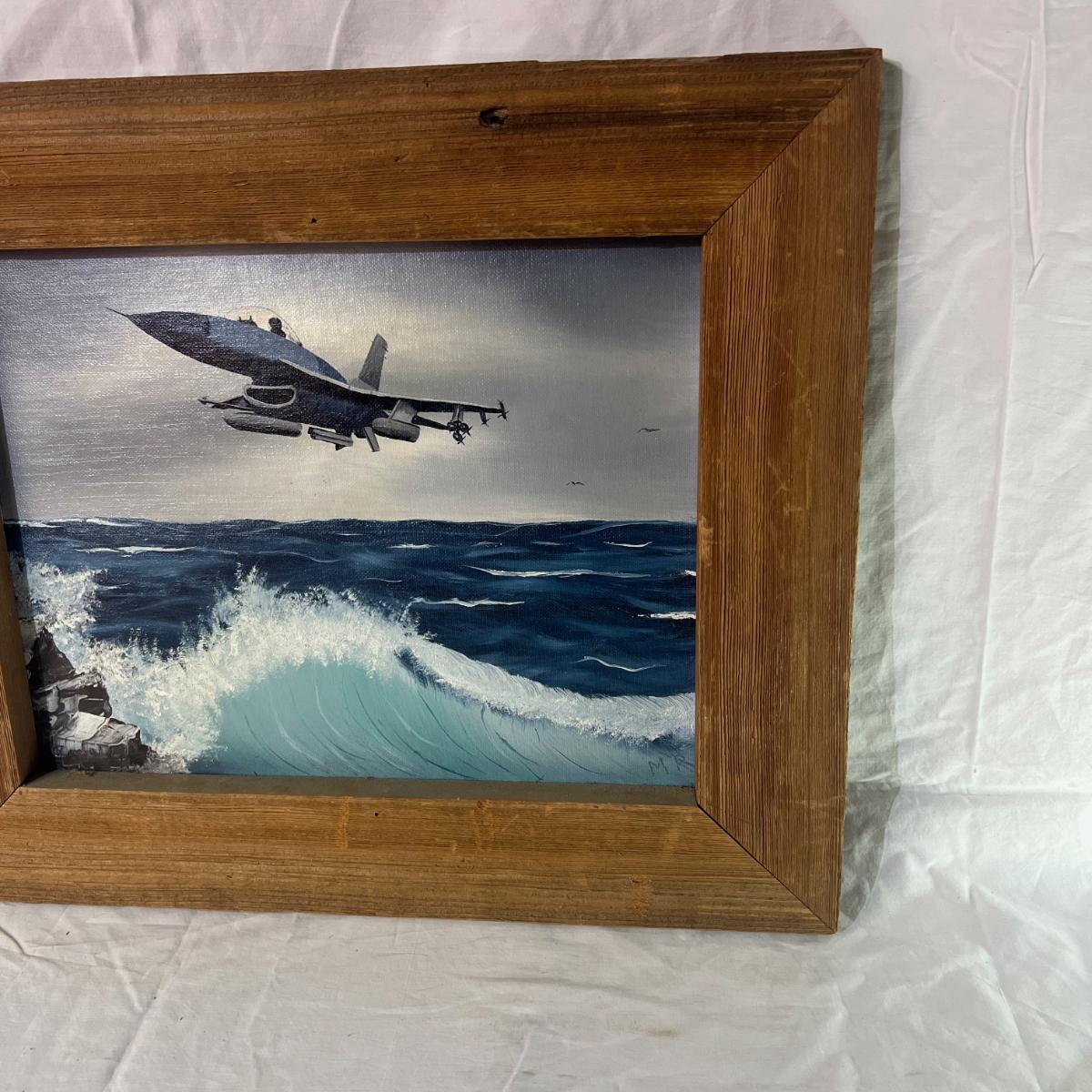 Vintage Natural Wood Frame for Painted Art of believed F-16 Plane over Ocean Signed MR at bottom whereas the back says Mel Rodela as an oil painting in 1996. Dimensions 18" x 15"